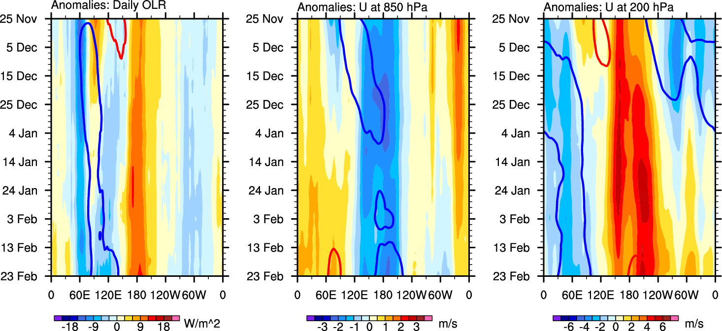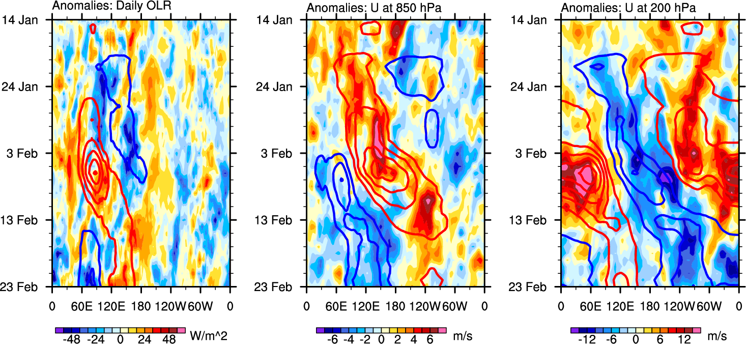 The Hovmollers show longitude-time plots for OLR, U-850, and U-200. The shading indicates the observed anomalies, while the contours are the projection of those anomalies onto the RMM EOFs.