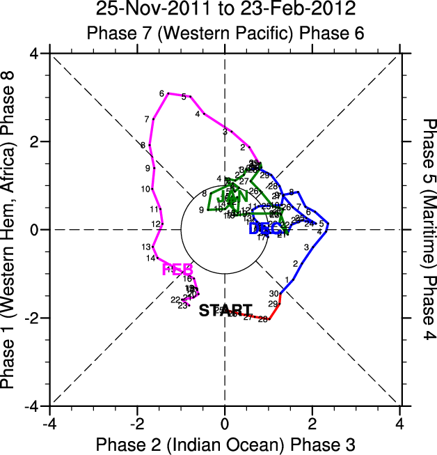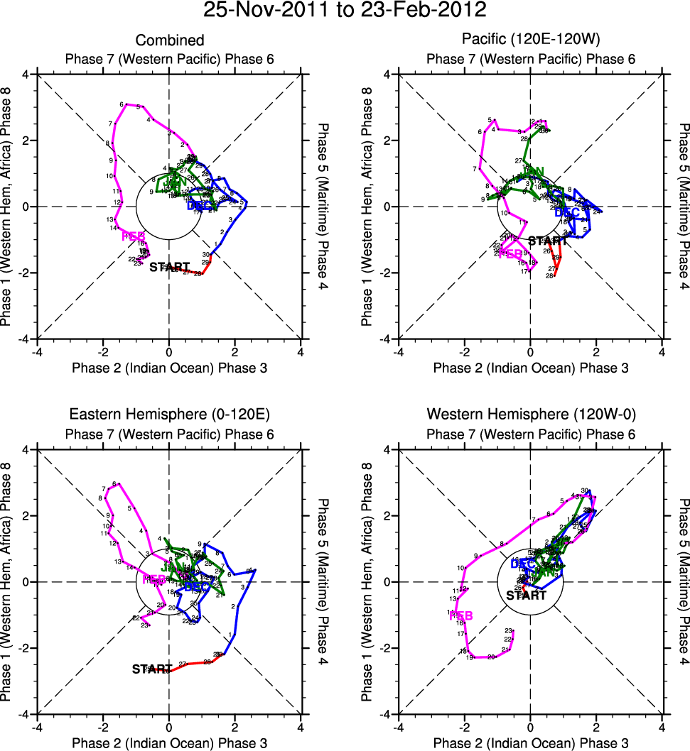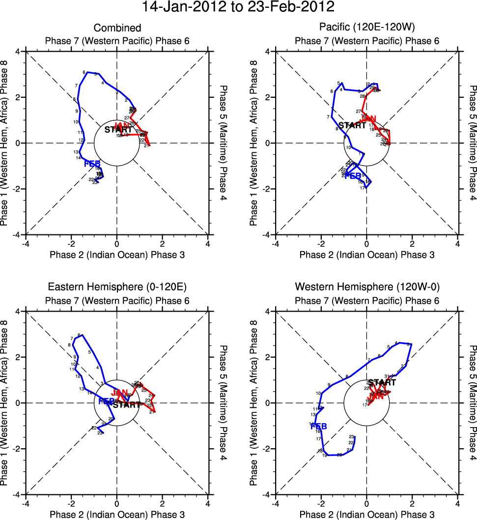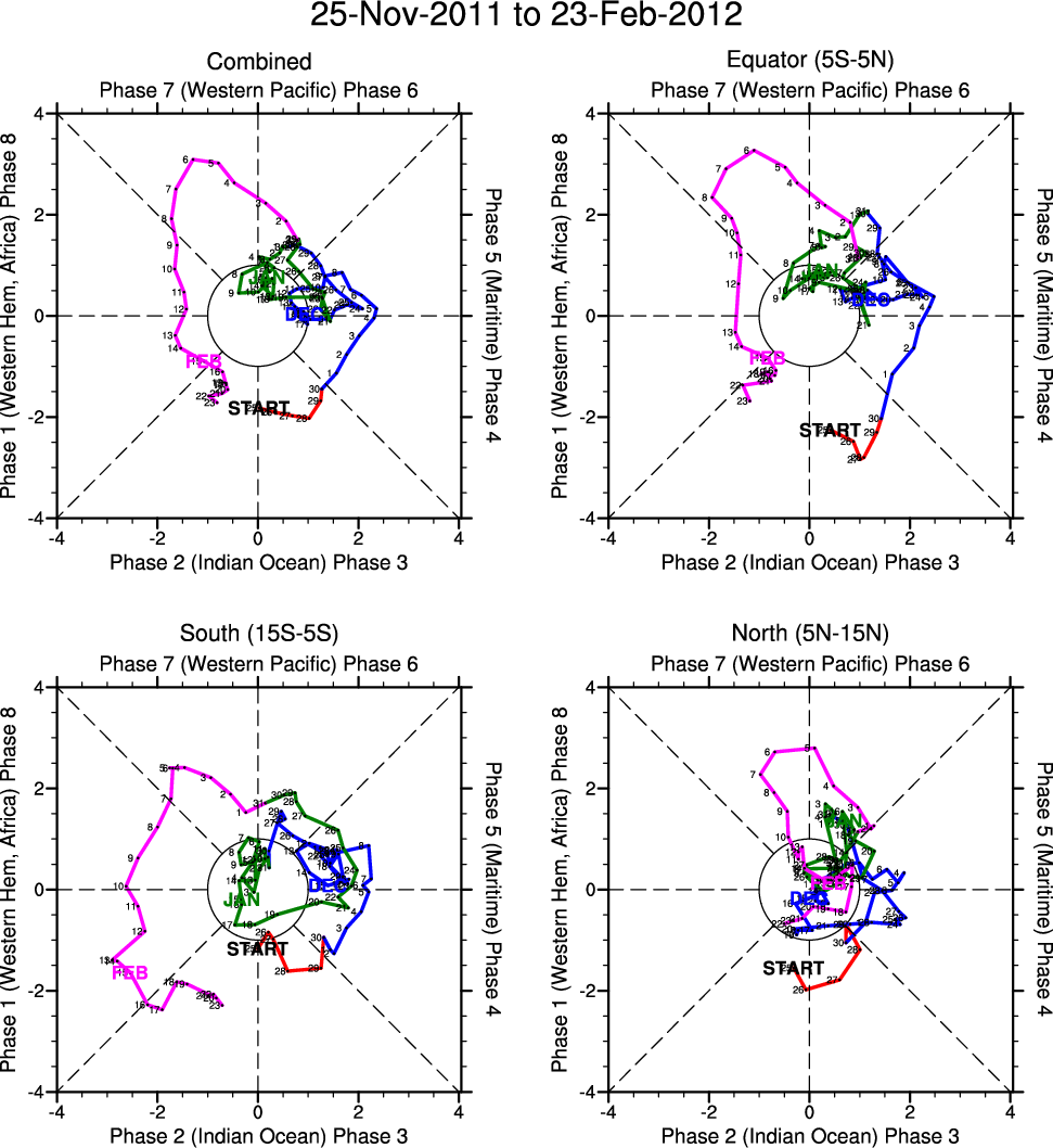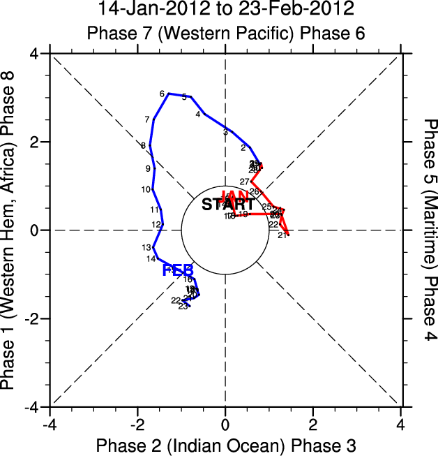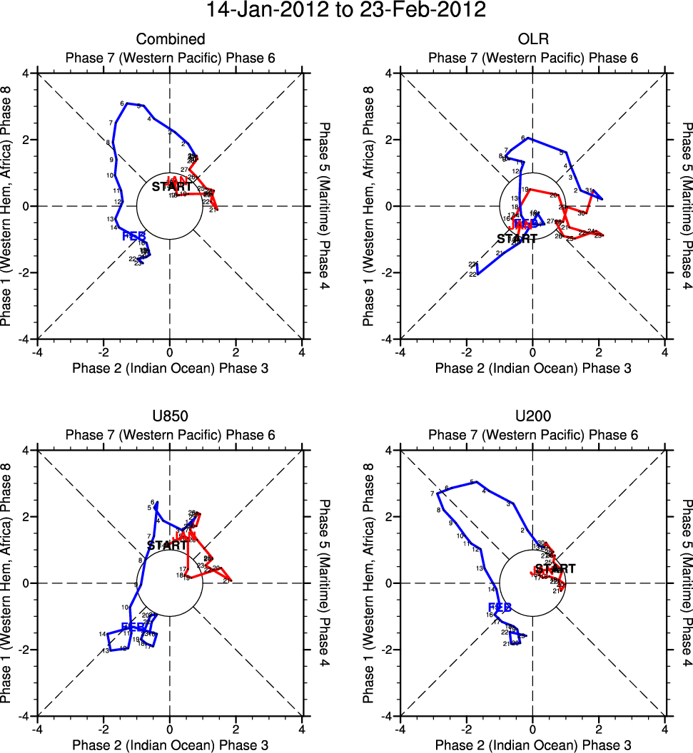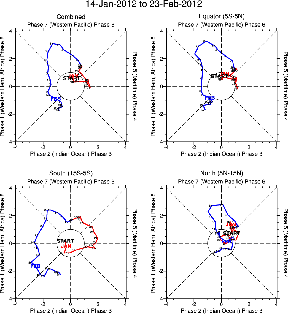 Wheeler and Hendon (2004) constructed the RMM index for monitoring the MJO. This index consists of the first two principal components (PCs) of OLR, 850-hPa zonal wind, and 200-hPa zonal wind averaged 15S-15N.