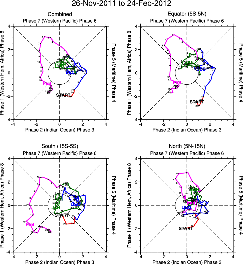 Wheeler and Hendon (2004) constructed the RMM index for monitoring the MJO. This index consists of the first two principal components (PCs) of OLR, 850-hPa zonal wind, and 200-hPa zonal wind averaged 15S-15N.