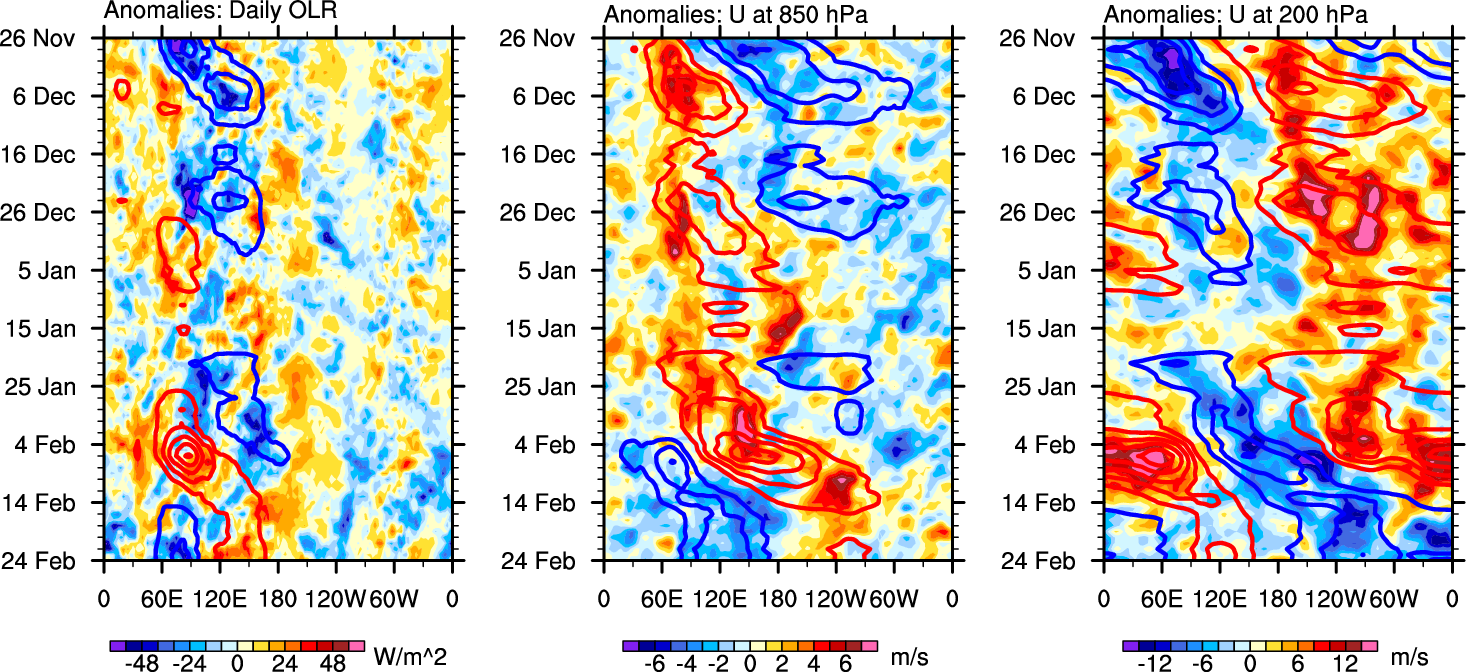 The Hovmollers show longitude-time plots for OLR, U-850, and U-200. The shading indicates the observed anomalies, while the contours are the projection of those anomalies onto the RMM EOFs.
