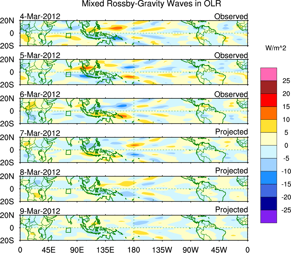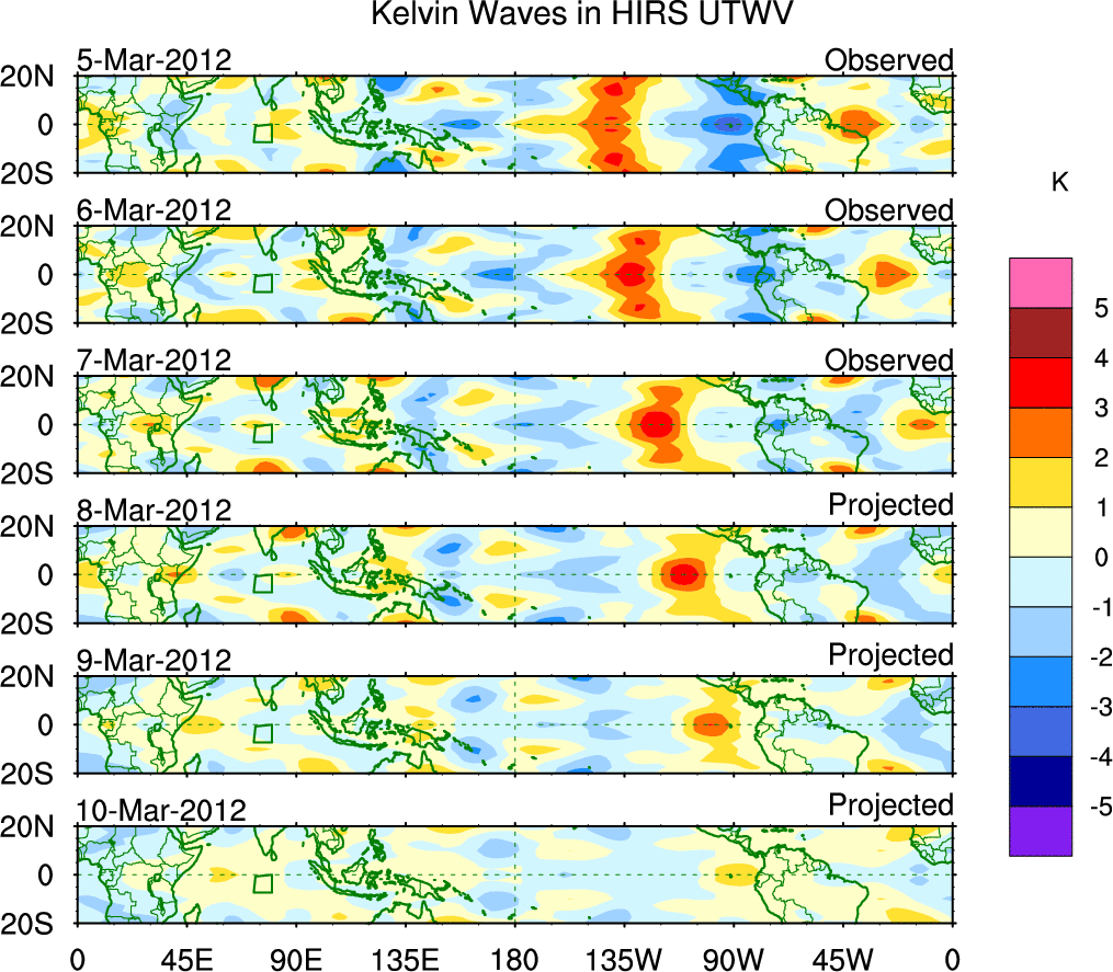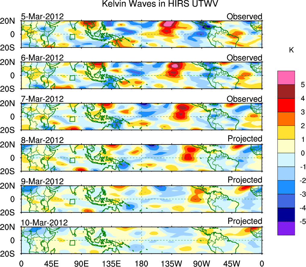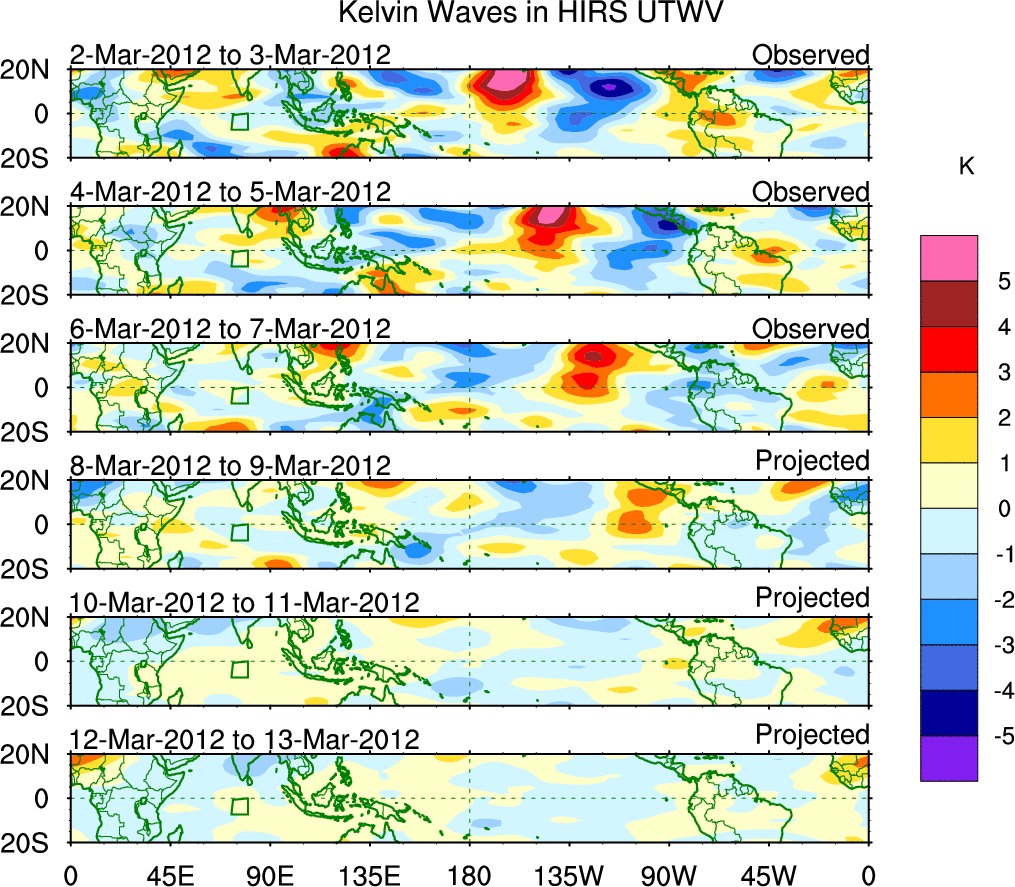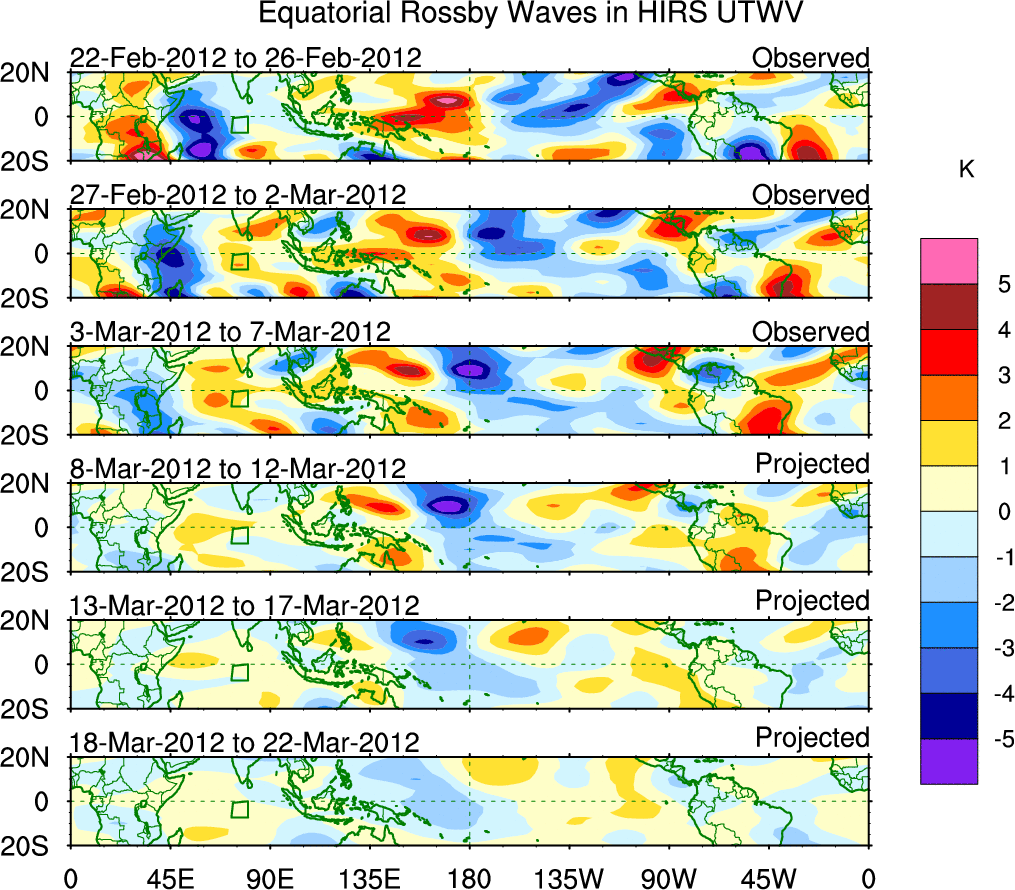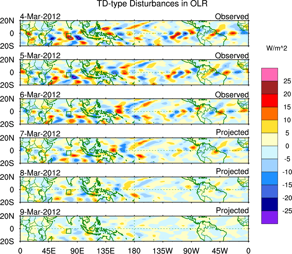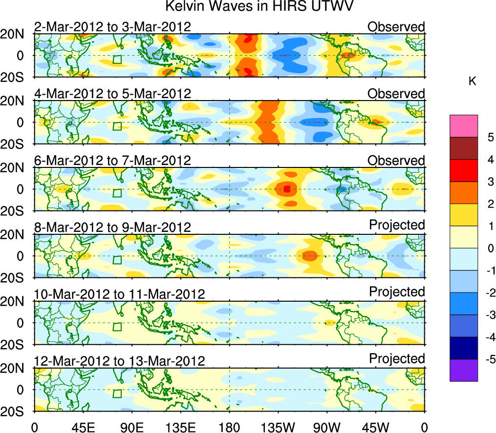 To identify tropical waves in near real-time, the OLR and UTWV data are filtered following Wheeler & Weickmann (2001 MWR). The daily anomalies are calculated using the first 3 harmonics of the seasonal cycle for 1979–2009. Missing values are then filled using linear interpolation in space and time. The most recent 365 days of anomalies are padded with 659 days of zeroes, and the result is filtered for each wave type.