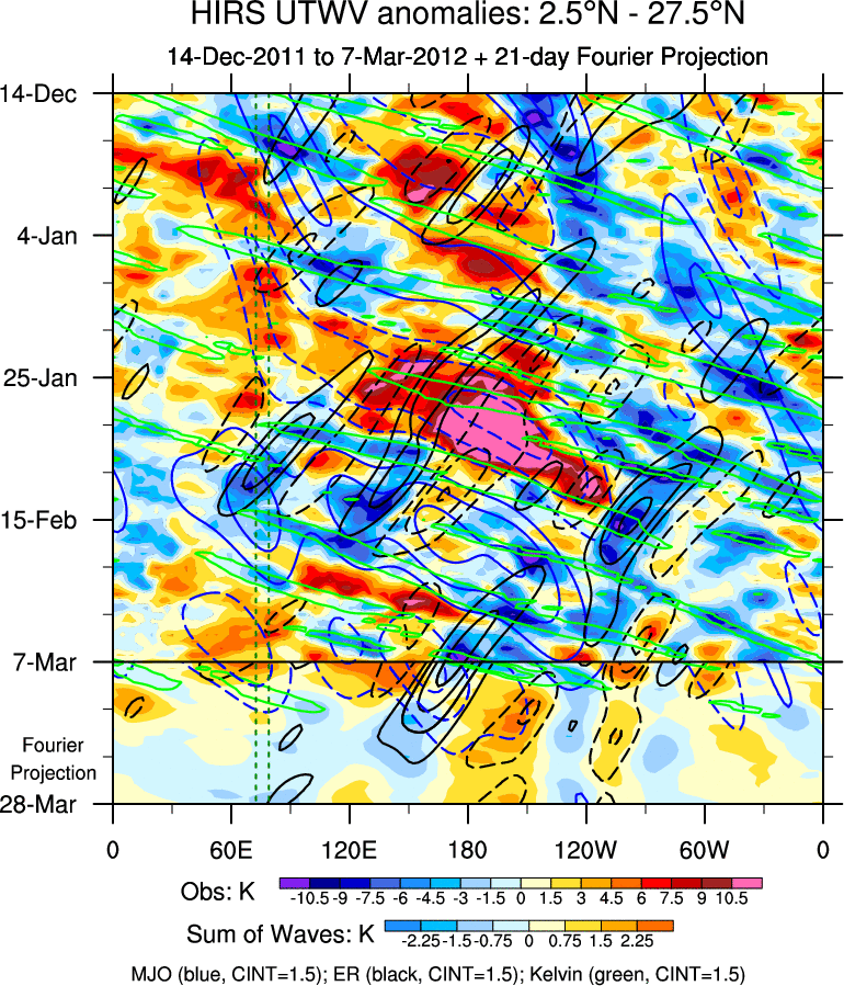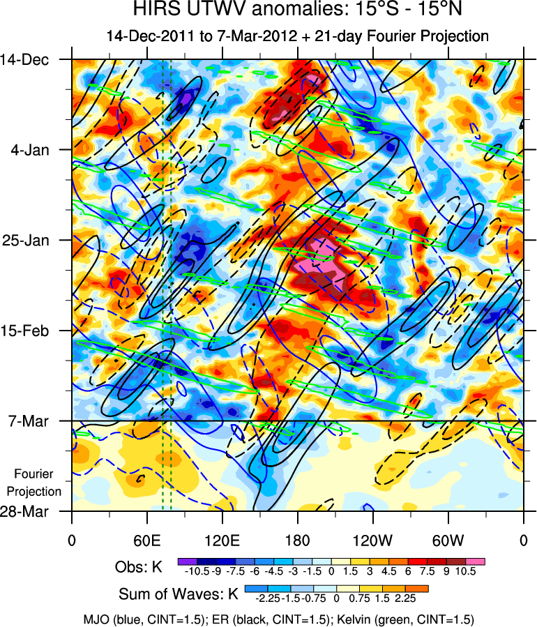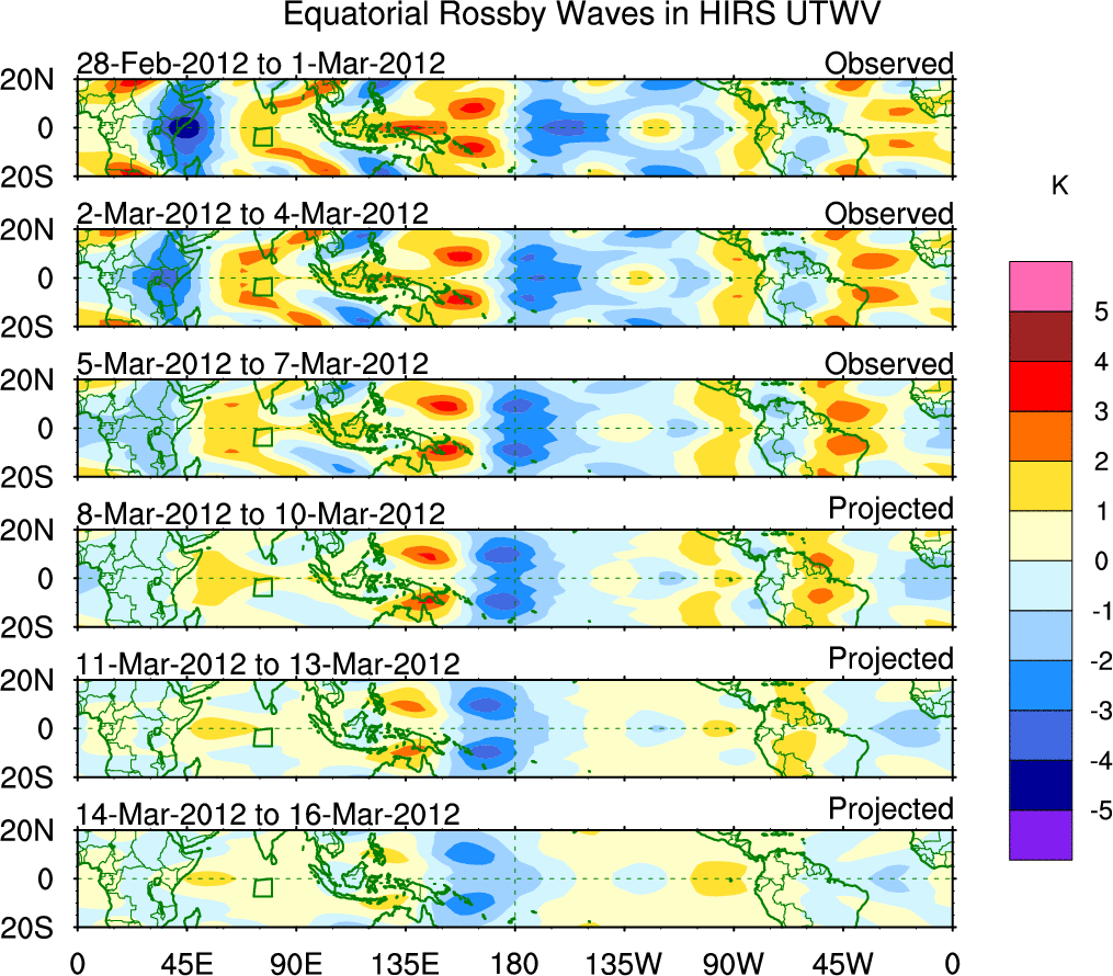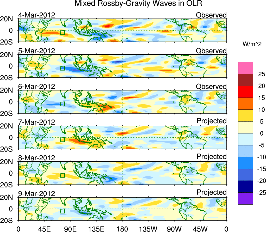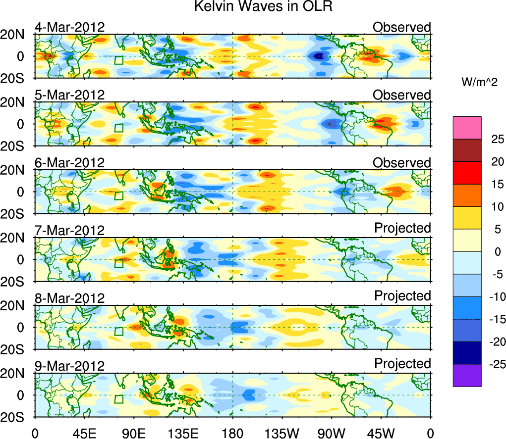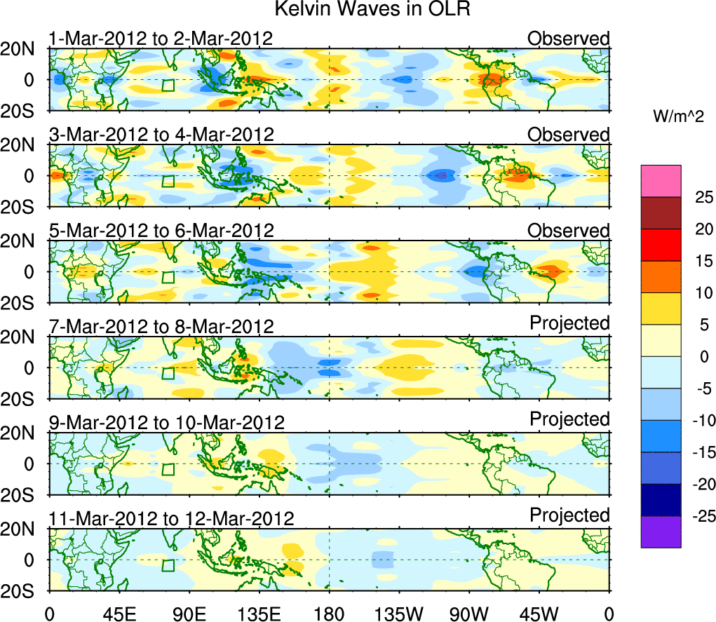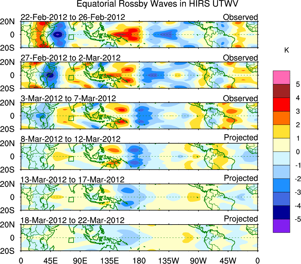 To identify tropical waves in near real-time, the OLR and UTWV data are filtered following Wheeler & Weickmann (2001 MWR). The daily anomalies are calculated using the first 3 harmonics of the seasonal cycle for 1979–2009. Missing values are then filled using linear interpolation in space and time. The most recent 365 days of anomalies are padded with 659 days of zeroes, and the result is filtered for each wave type.