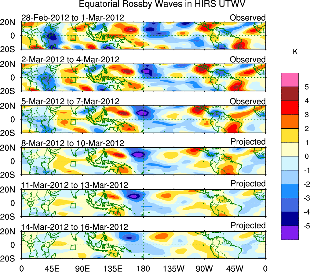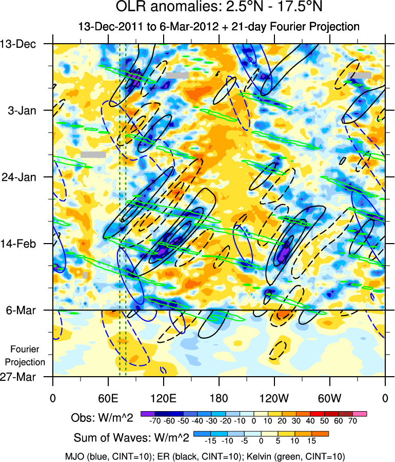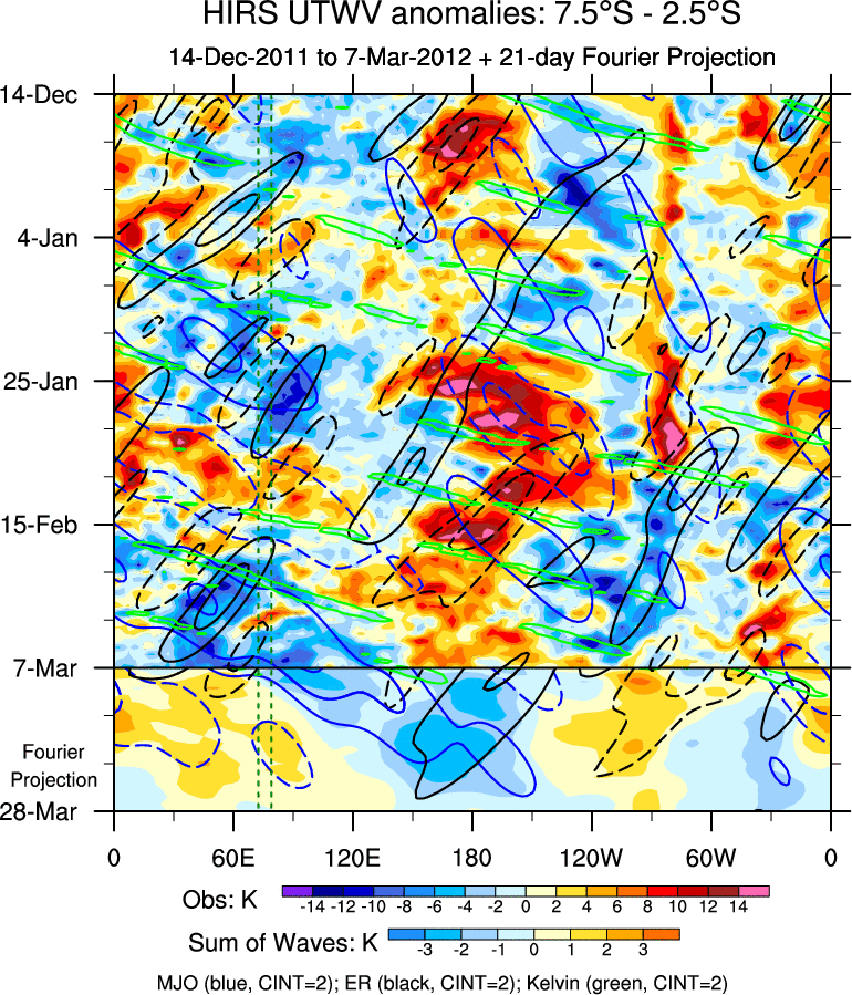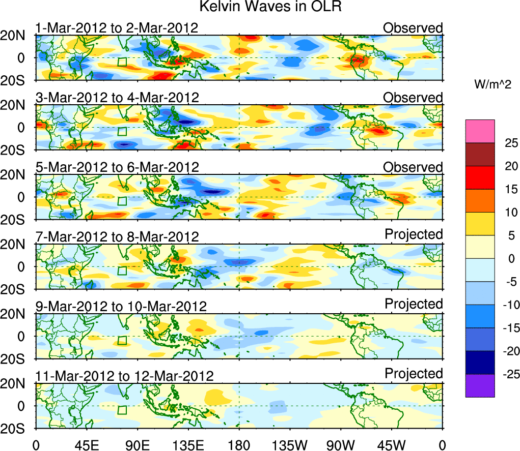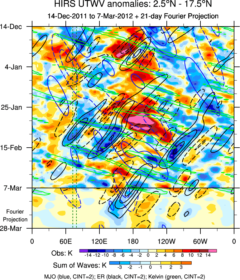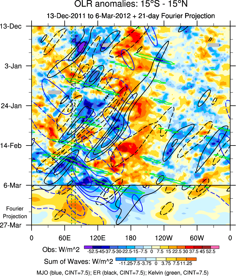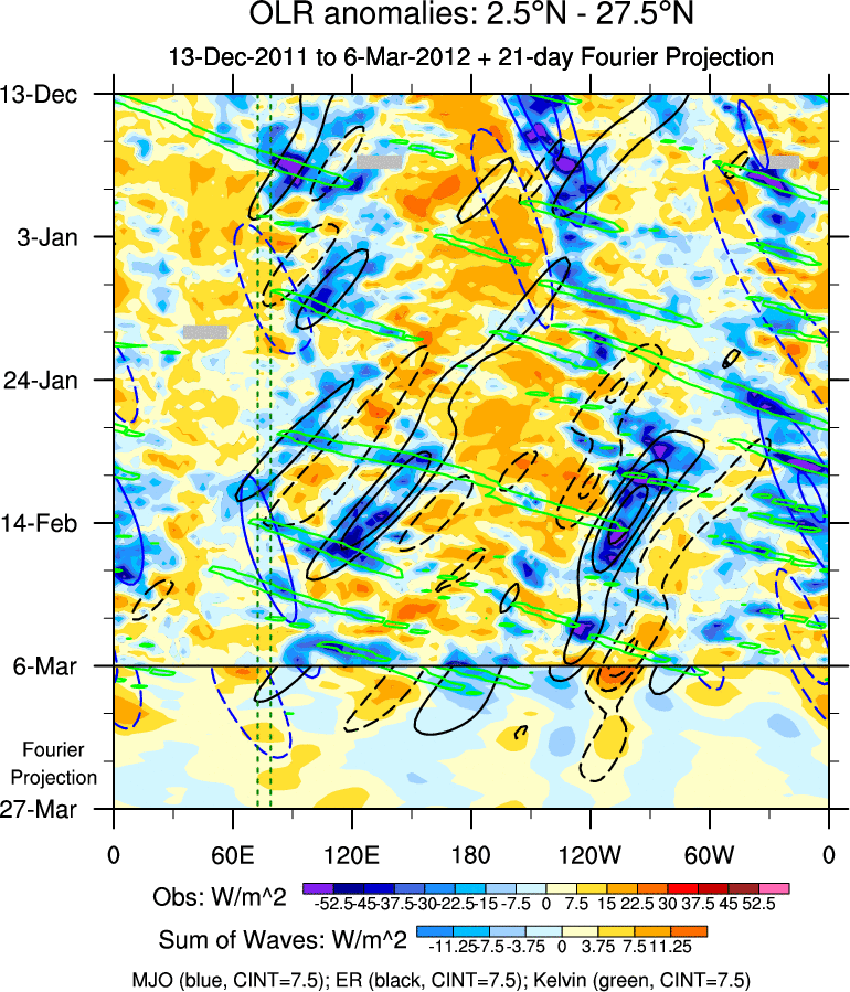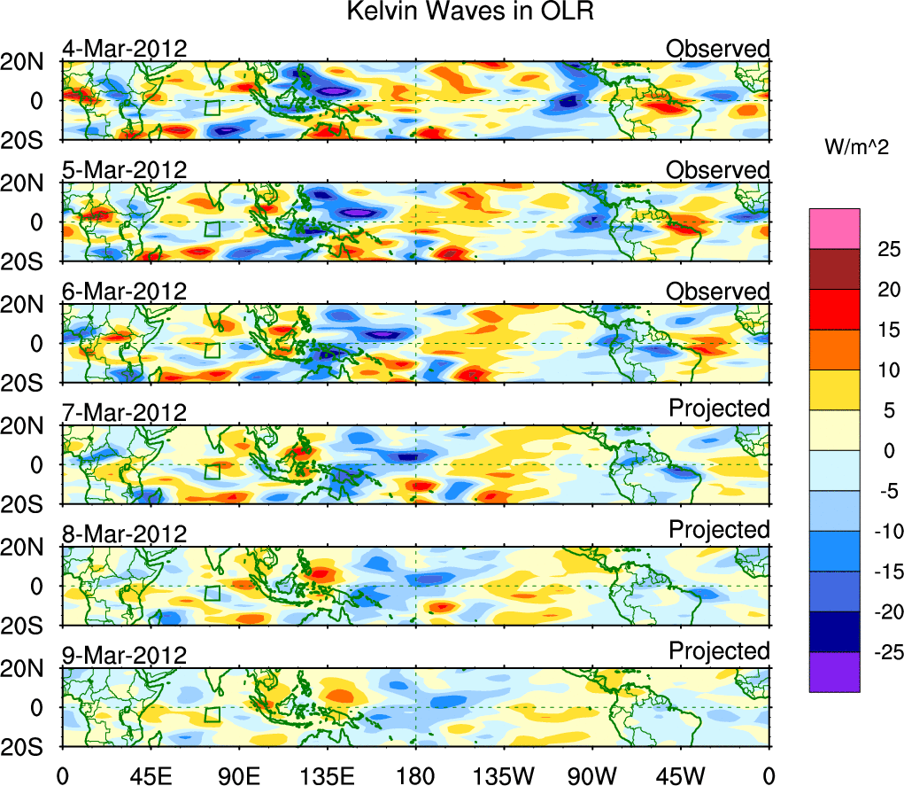 To identify tropical waves in near real-time, the OLR and UTWV data are filtered following Wheeler & Weickmann (2001 MWR). The daily anomalies are calculated using the first 3 harmonics of the seasonal cycle for 1979–2009. Missing values are then filled using linear interpolation in space and time. The most recent 365 days of anomalies are padded with 659 days of zeroes, and the result is filtered for each wave type.
