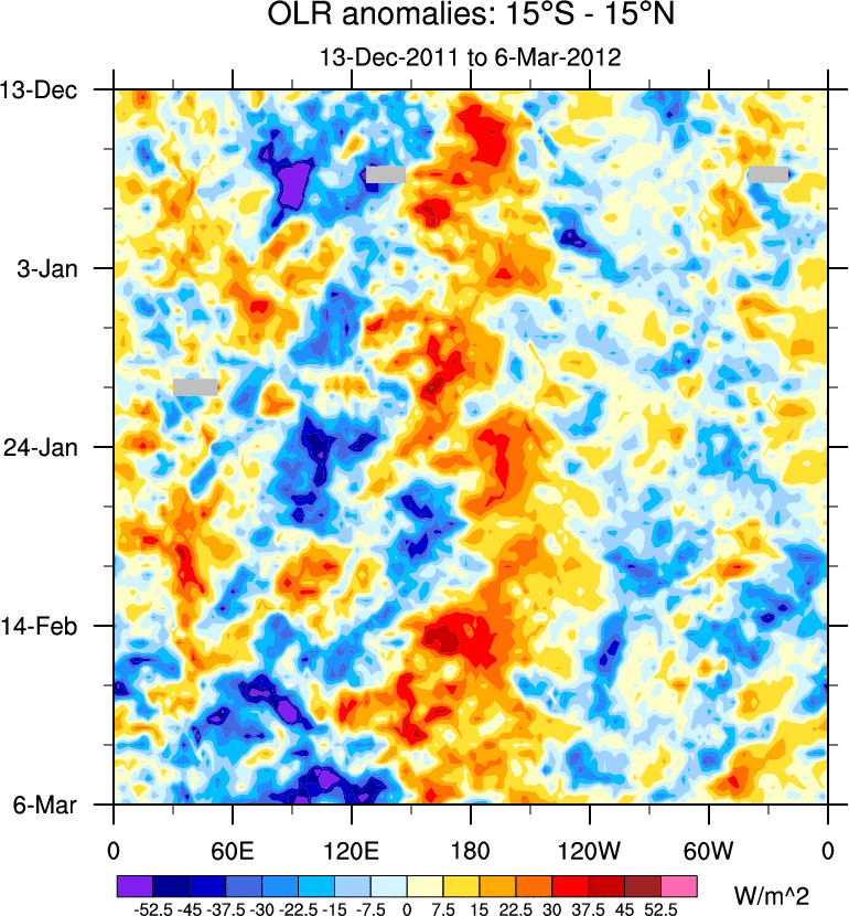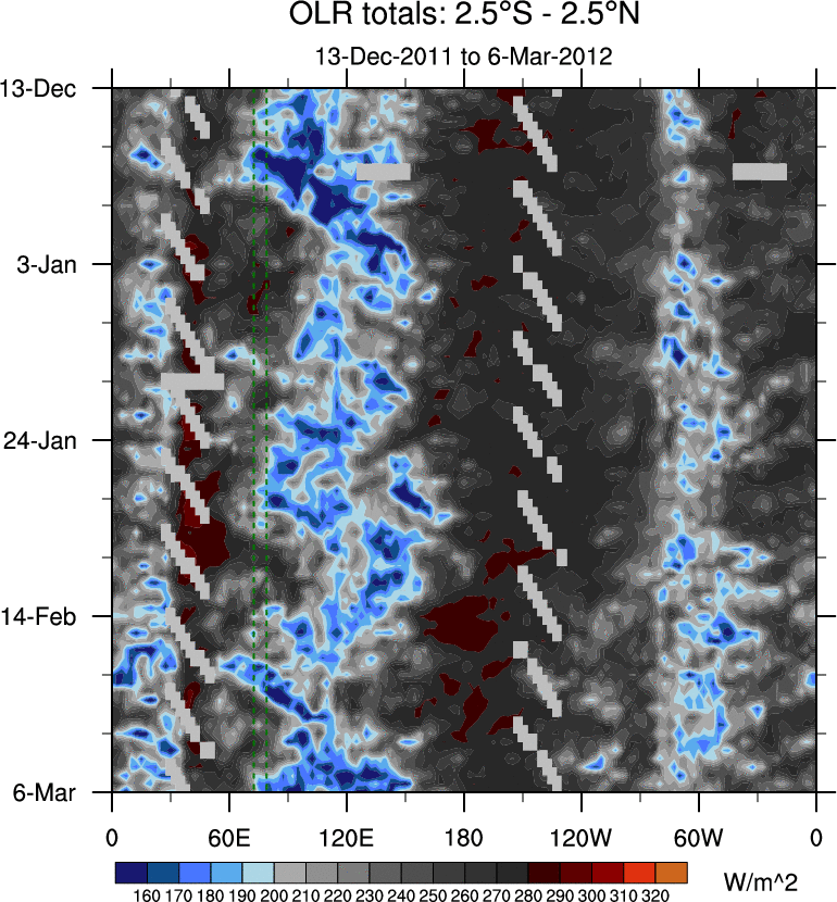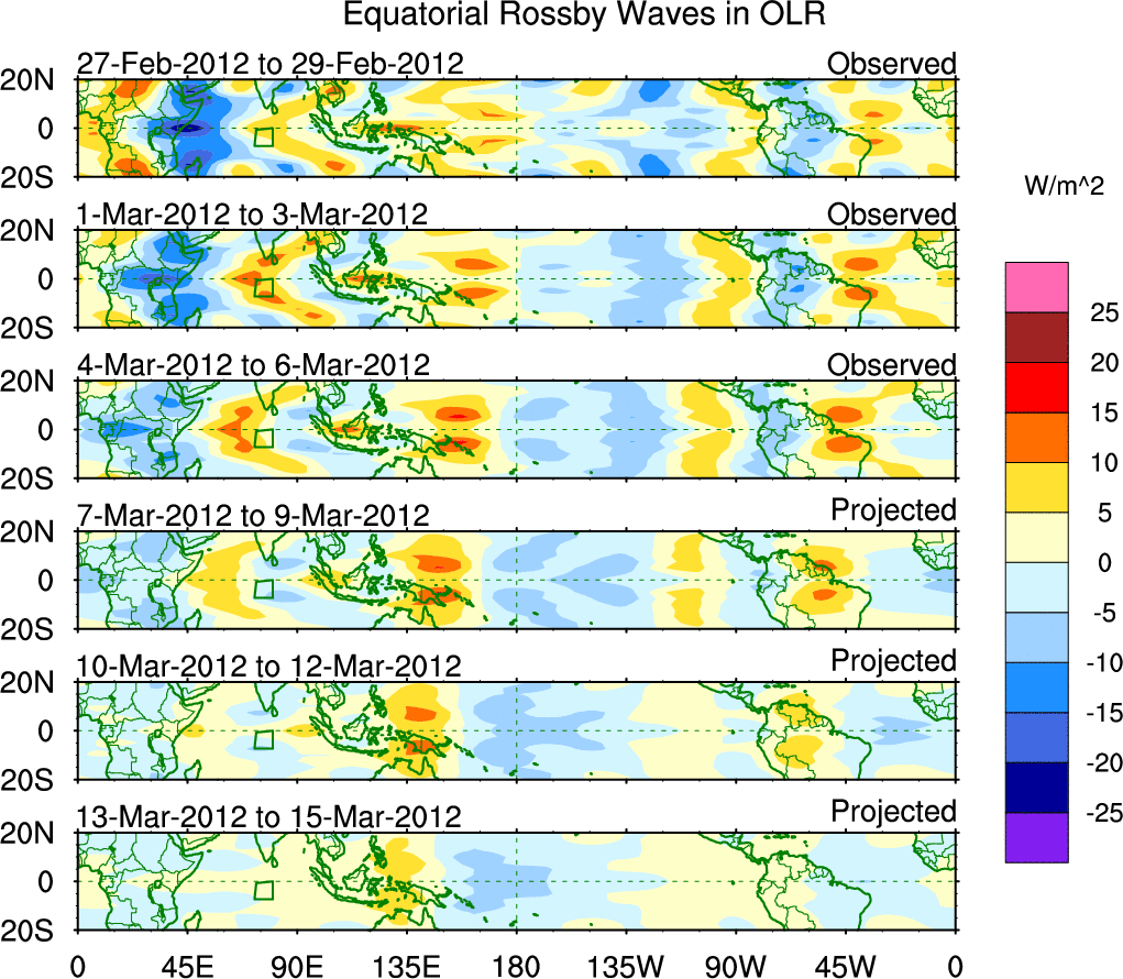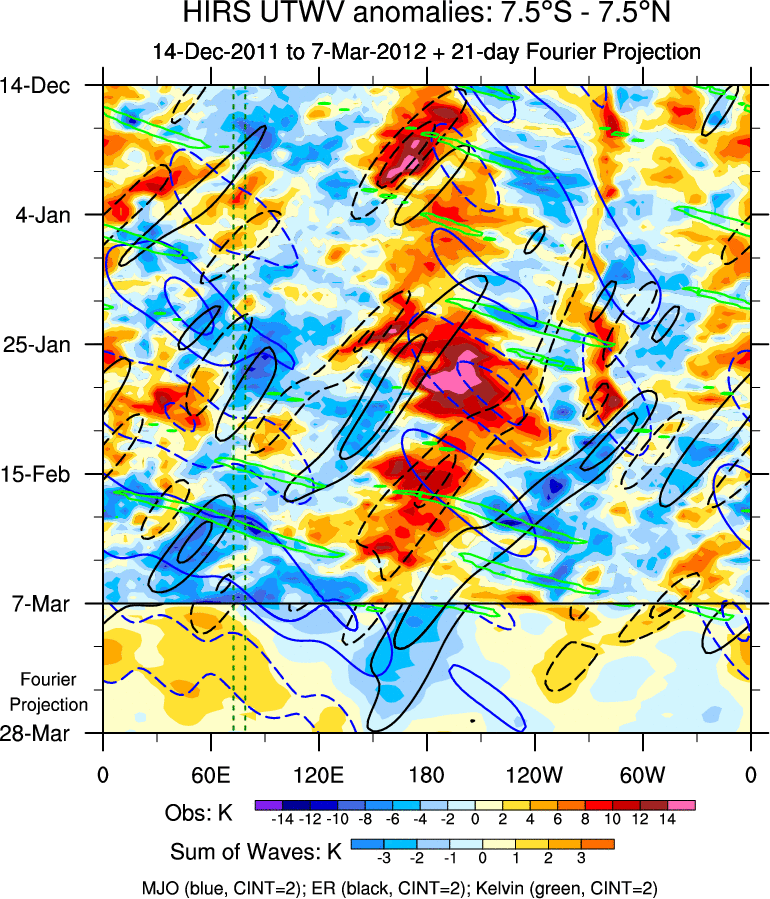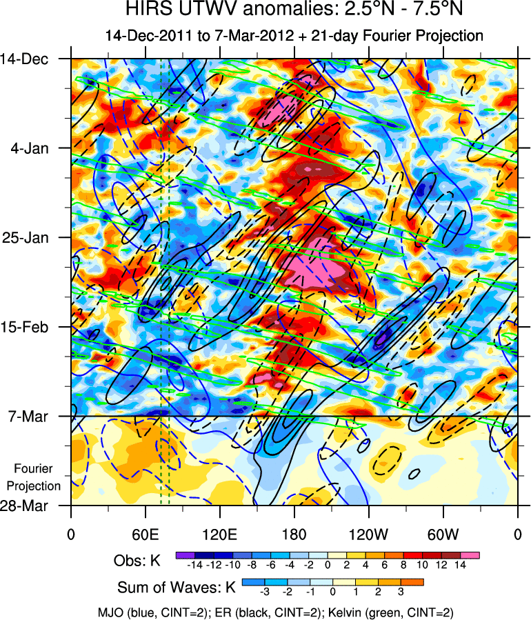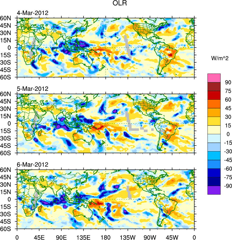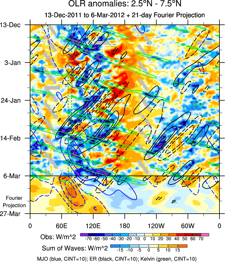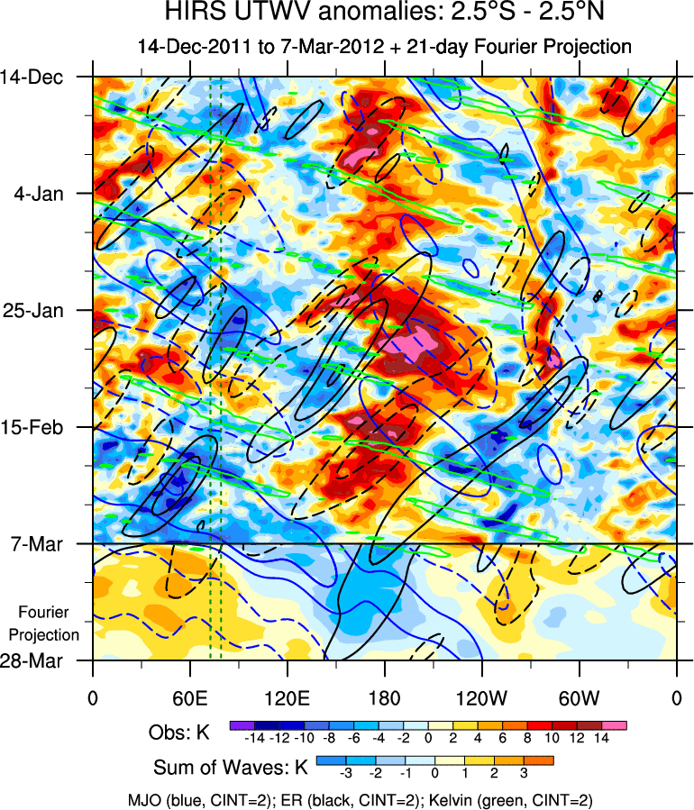 To identify tropical waves in near real-time, the OLR and UTWV data are filtered following Wheeler & Weickmann (2001 MWR). The daily anomalies are calculated using the first 3 harmonics of the seasonal cycle for 1979–2009. Missing values are then filled using linear interpolation in space and time. The most recent 365 days of anomalies are padded with 659 days of zeroes, and the result is filtered for each wave type.