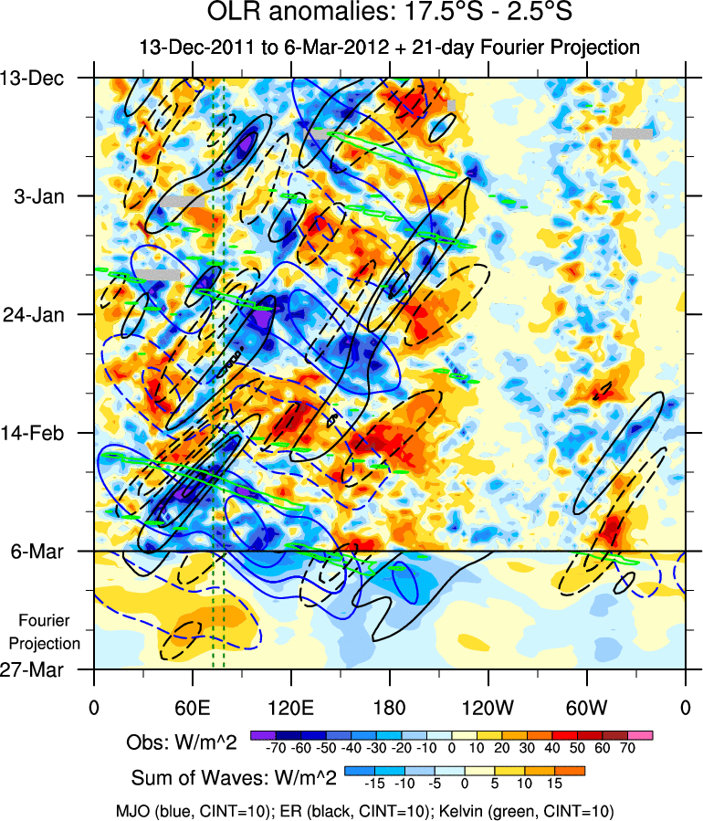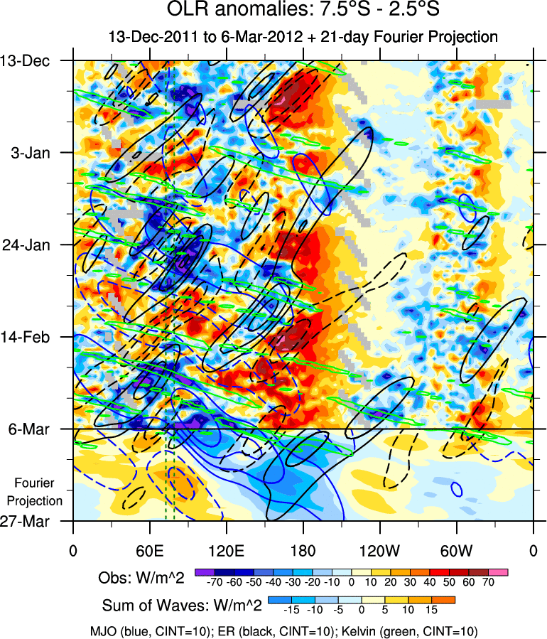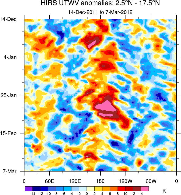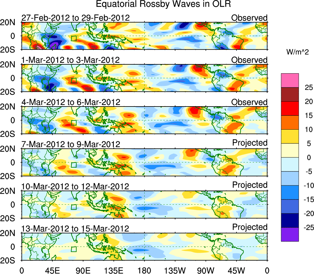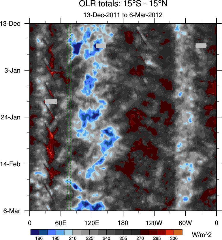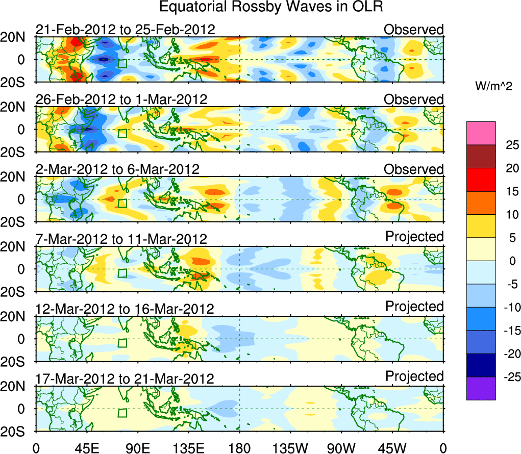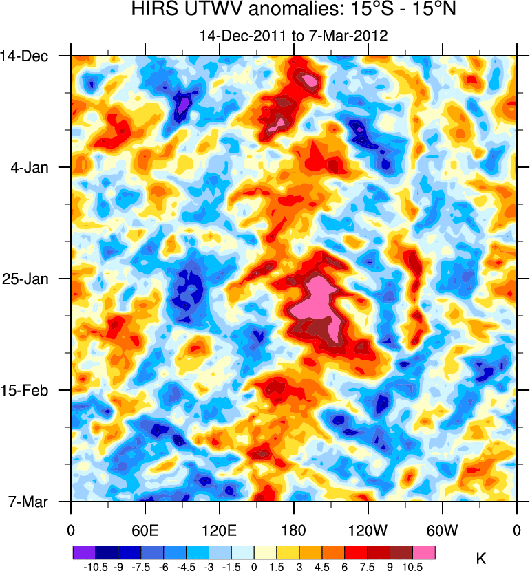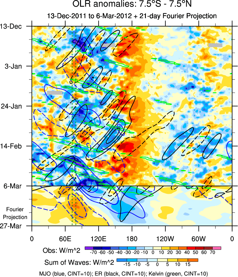 To identify tropical waves in near real-time, the OLR and UTWV data are filtered following Wheeler & Weickmann (2001 MWR). The daily anomalies are calculated using the first 3 harmonics of the seasonal cycle for 1979–2009. Missing values are then filled using linear interpolation in space and time. The most recent 365 days of anomalies are padded with 659 days of zeroes, and the result is filtered for each wave type.