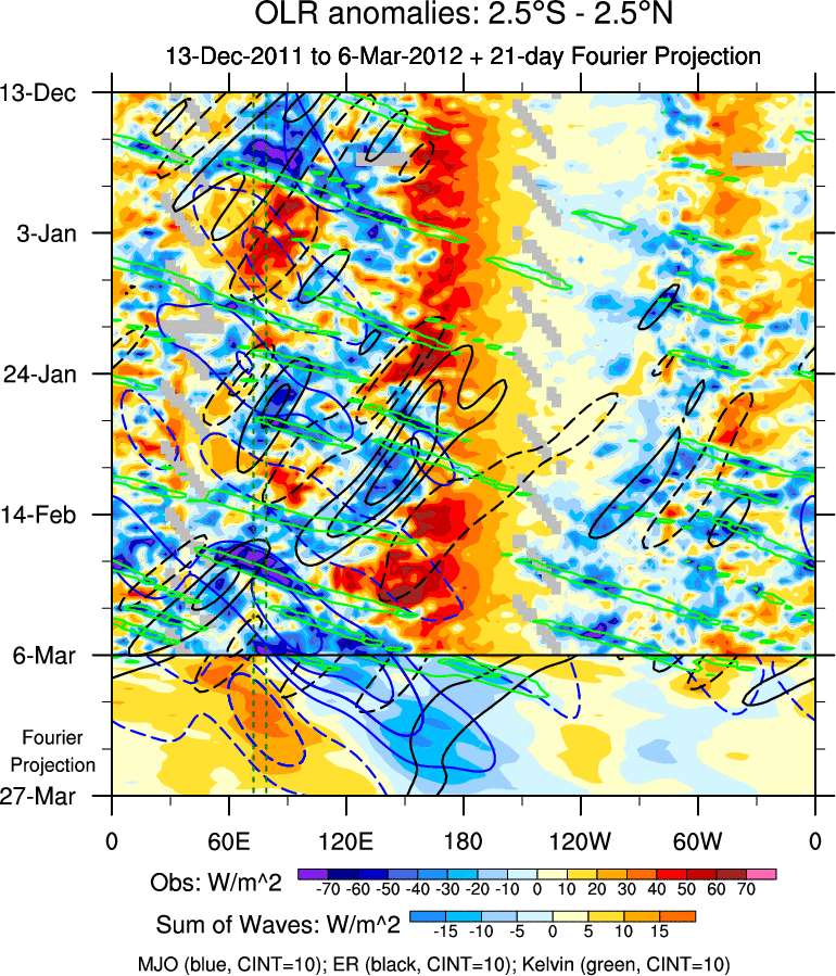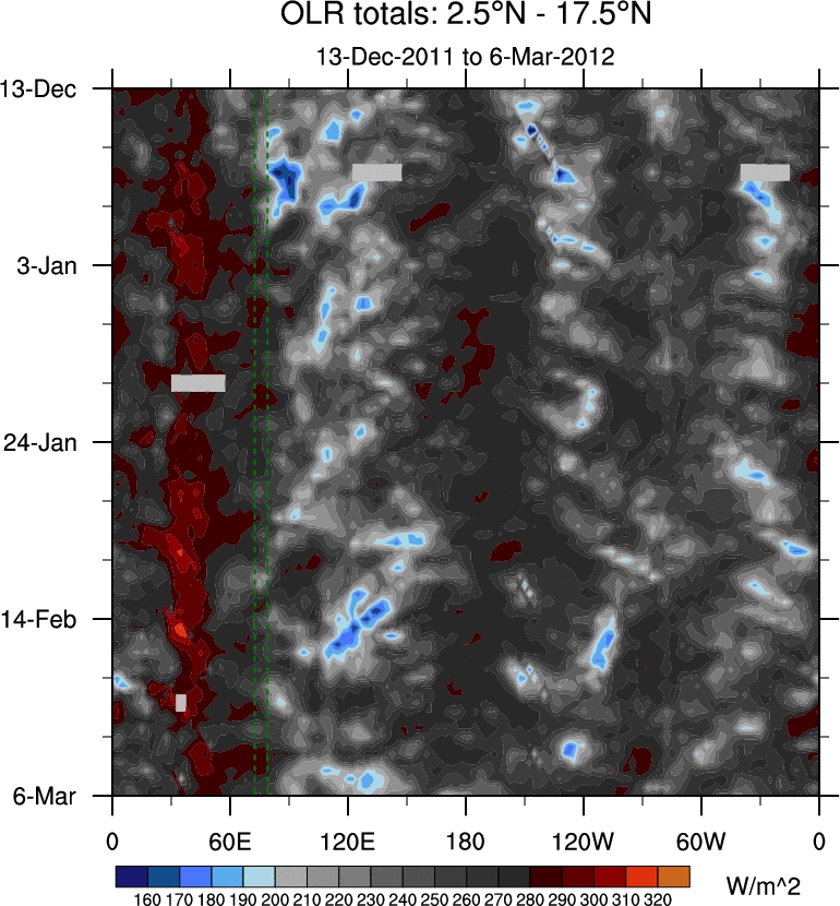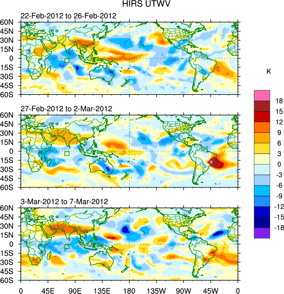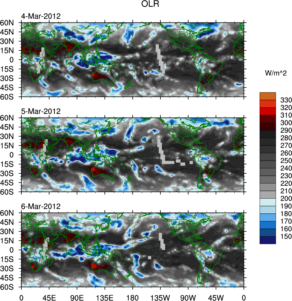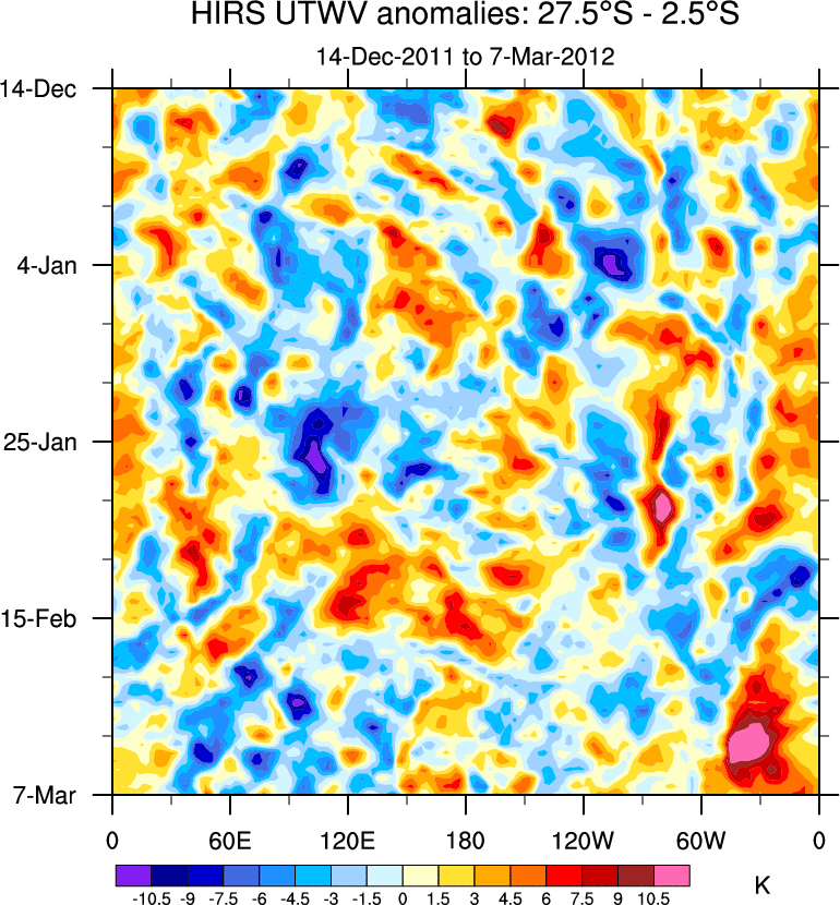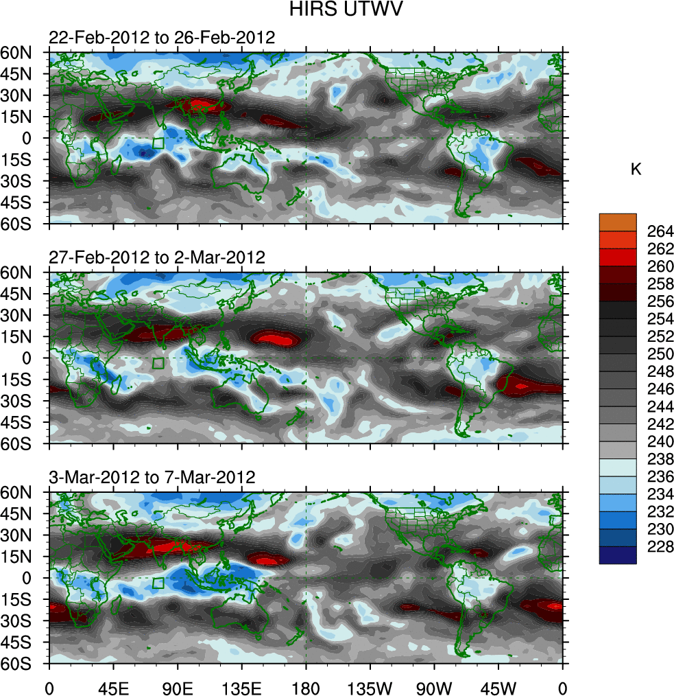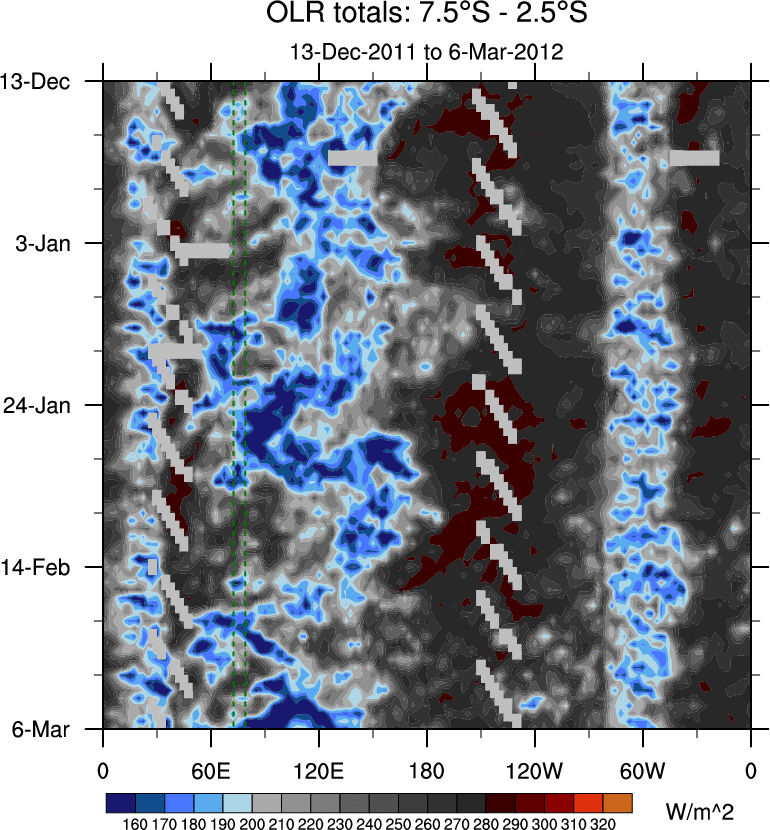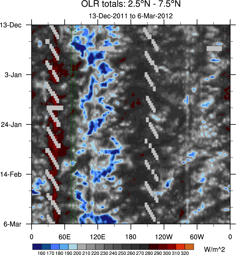 To identify tropical waves in near real-time, the OLR and UTWV data are filtered following Wheeler & Weickmann (2001 MWR). The daily anomalies are calculated using the first 3 harmonics of the seasonal cycle for 1979–2009. Missing values are then filled using linear interpolation in space and time. The most recent 365 days of anomalies are padded with 659 days of zeroes, and the result is filtered for each wave type.