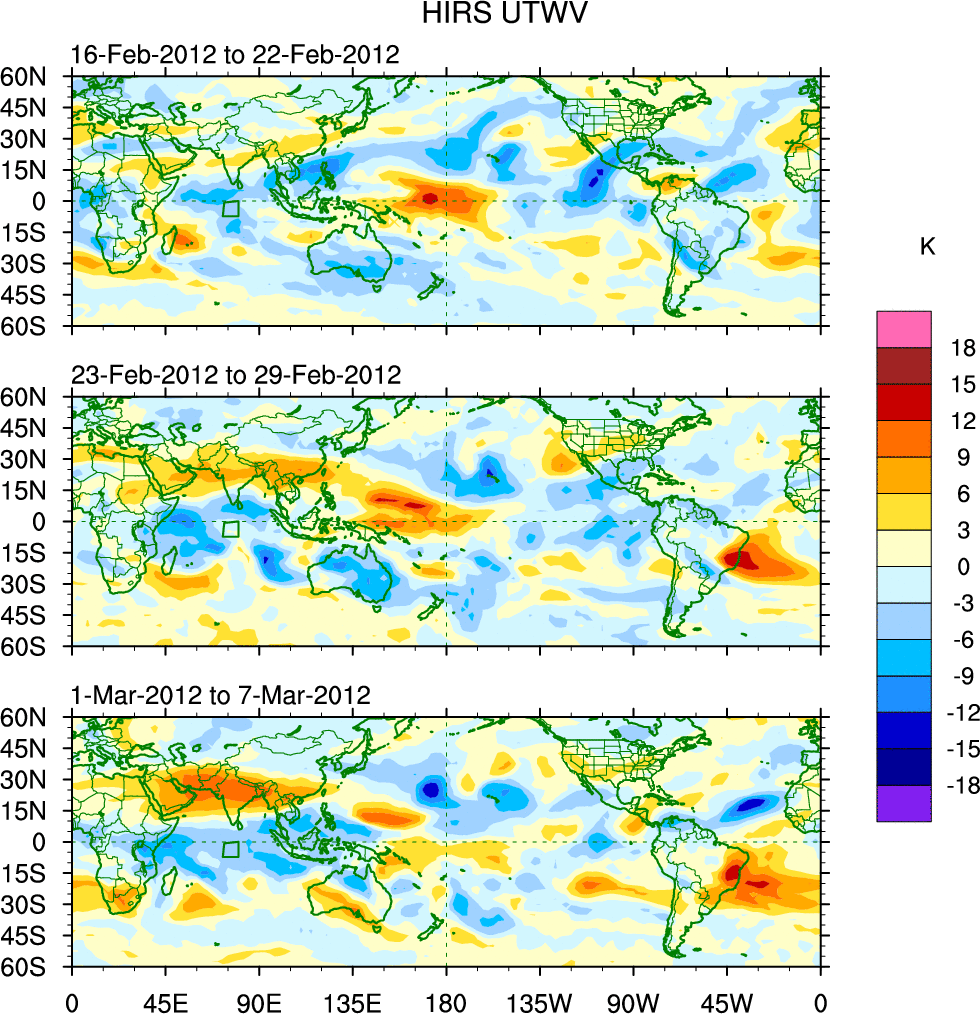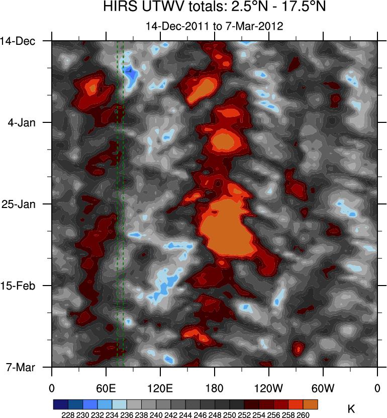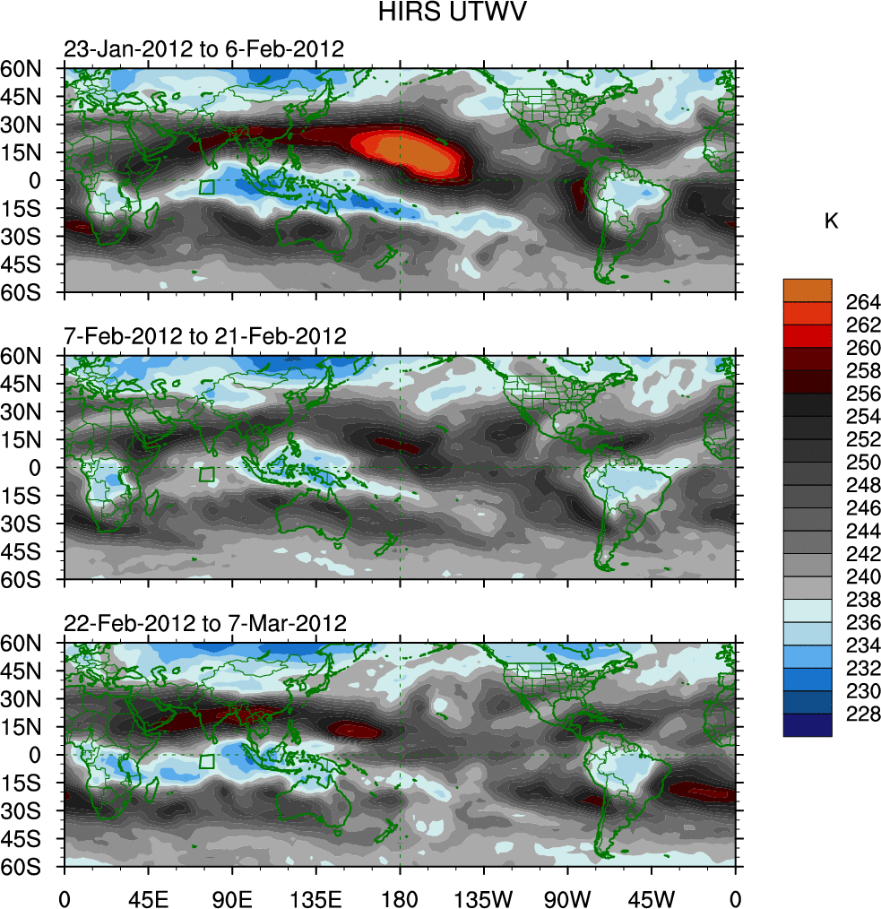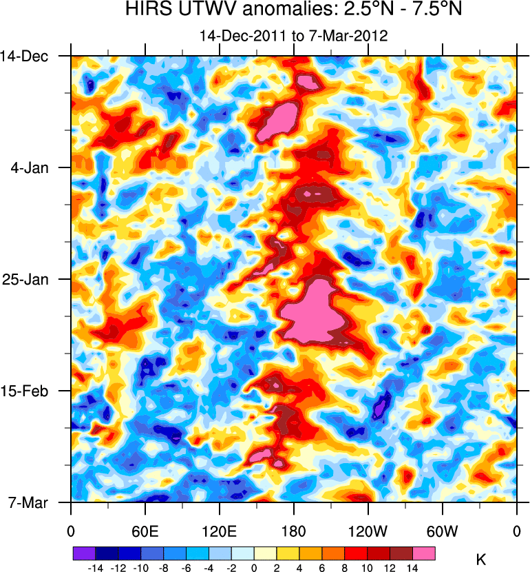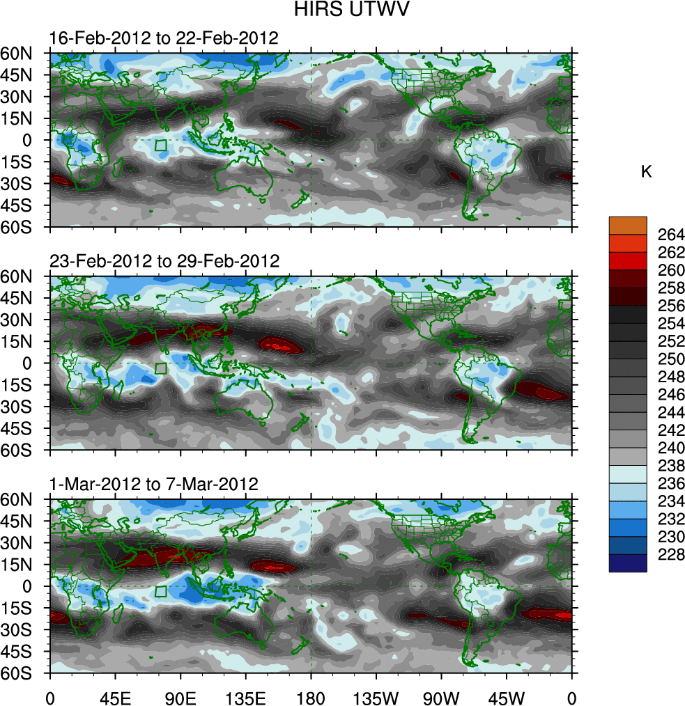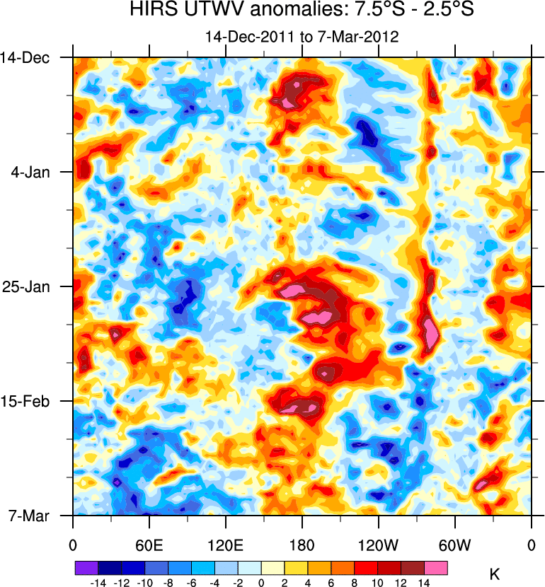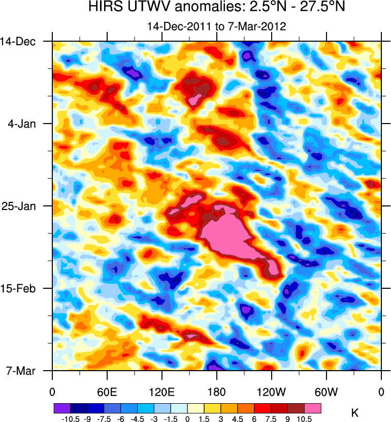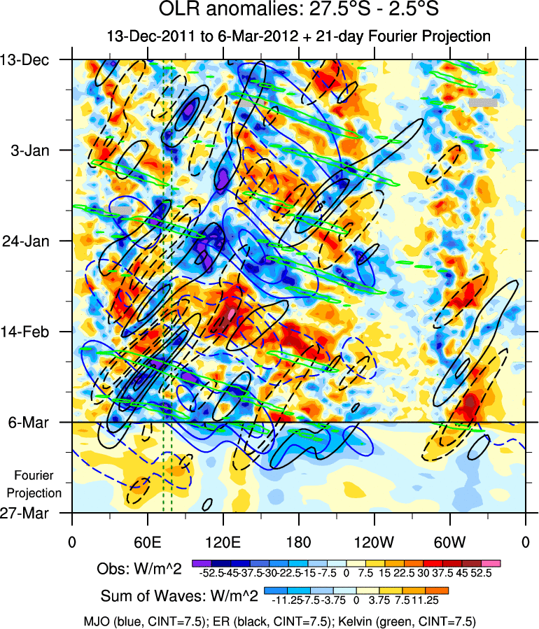 To identify tropical waves in near real-time, the OLR and UTWV data are filtered following Wheeler & Weickmann (2001 MWR). The daily anomalies are calculated using the first 3 harmonics of the seasonal cycle for 1979–2009. Missing values are then filled using linear interpolation in space and time. The most recent 365 days of anomalies are padded with 659 days of zeroes, and the result is filtered for each wave type.
