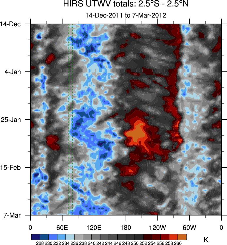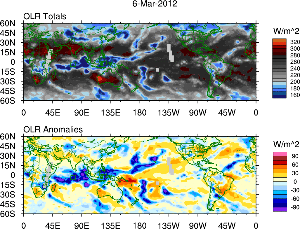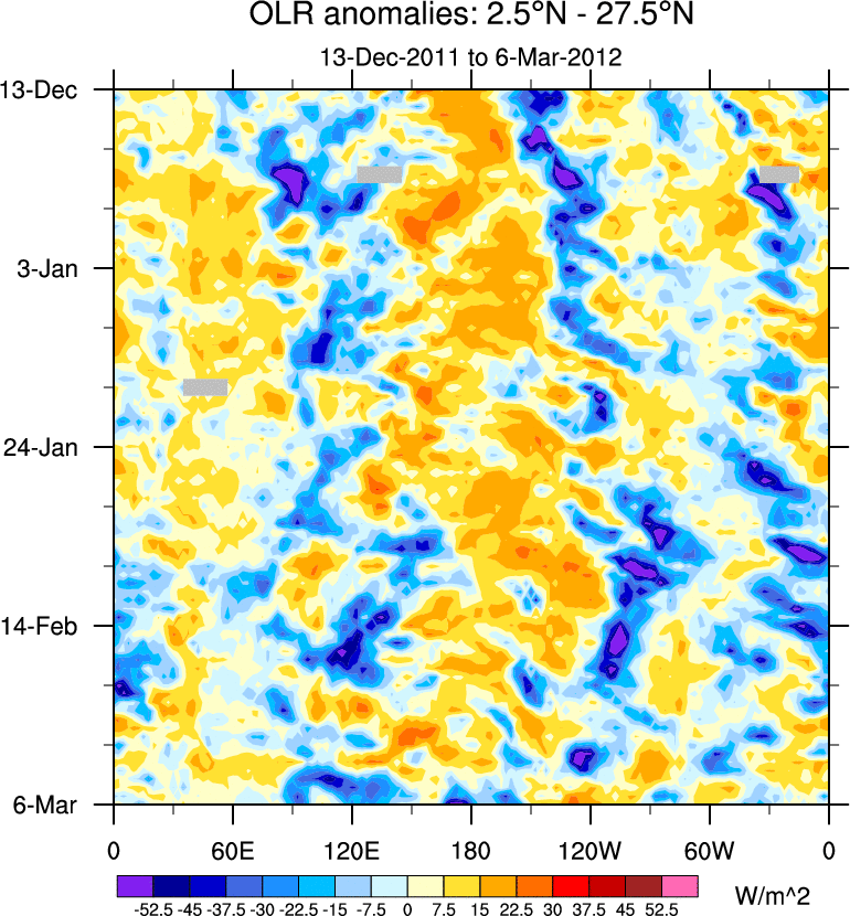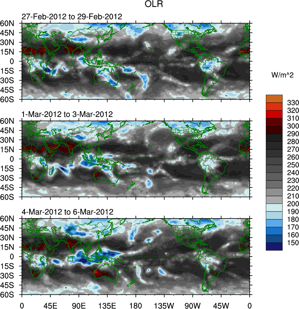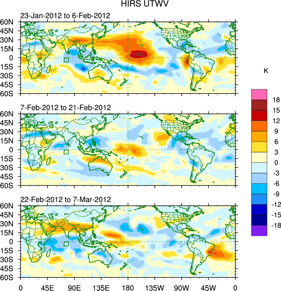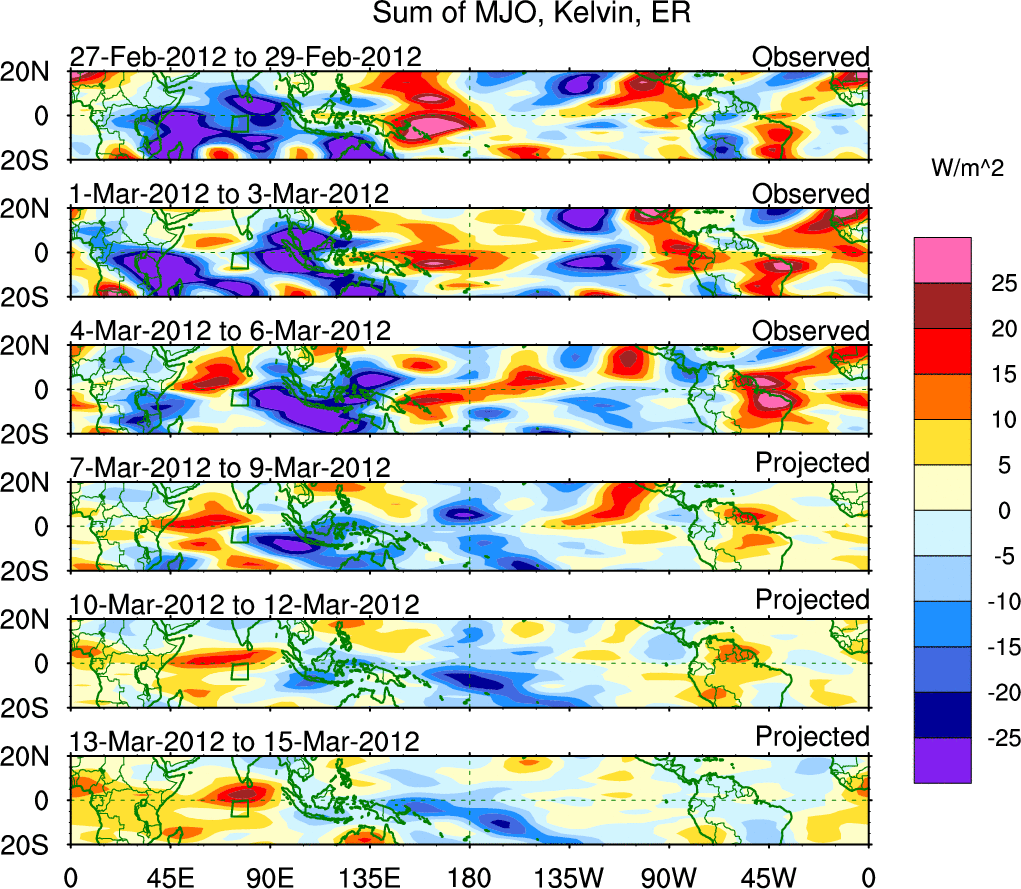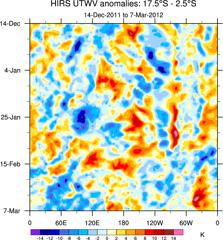 To identify tropical waves in near real-time, the OLR and UTWV data are filtered following Wheeler & Weickmann (2001 MWR). The daily anomalies are calculated using the first 3 harmonics of the seasonal cycle for 1979–2009. Missing values are then filled using linear interpolation in space and time. The most recent 365 days of anomalies are padded with 659 days of zeroes, and the result is filtered for each wave type.
