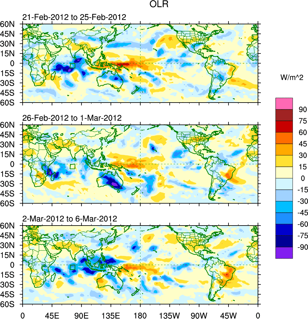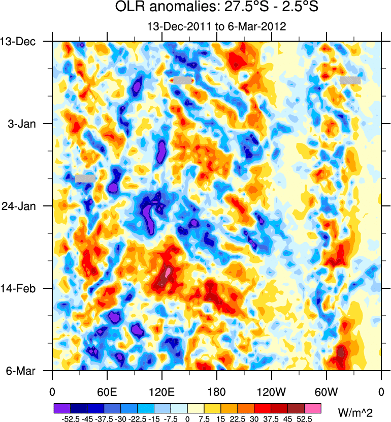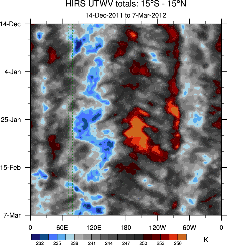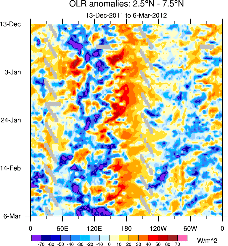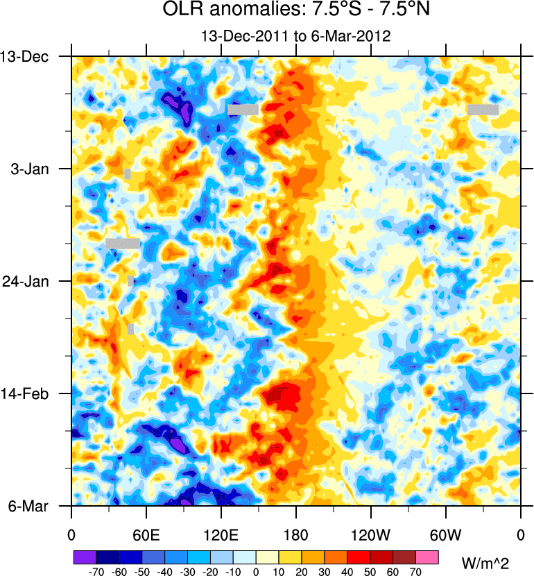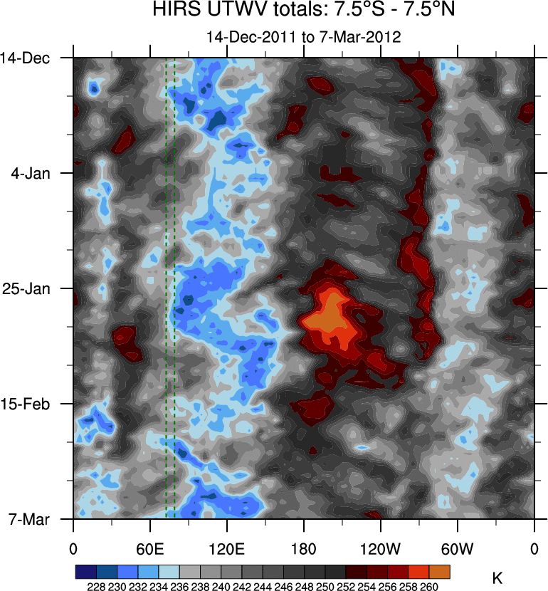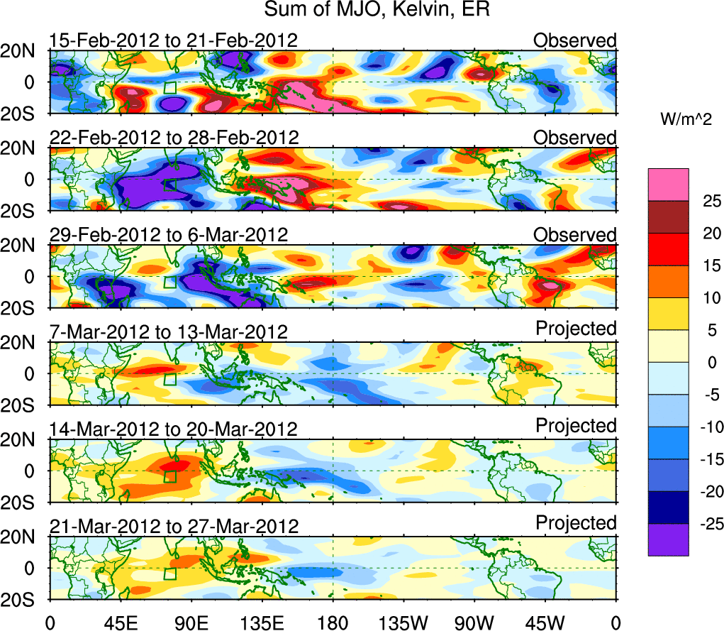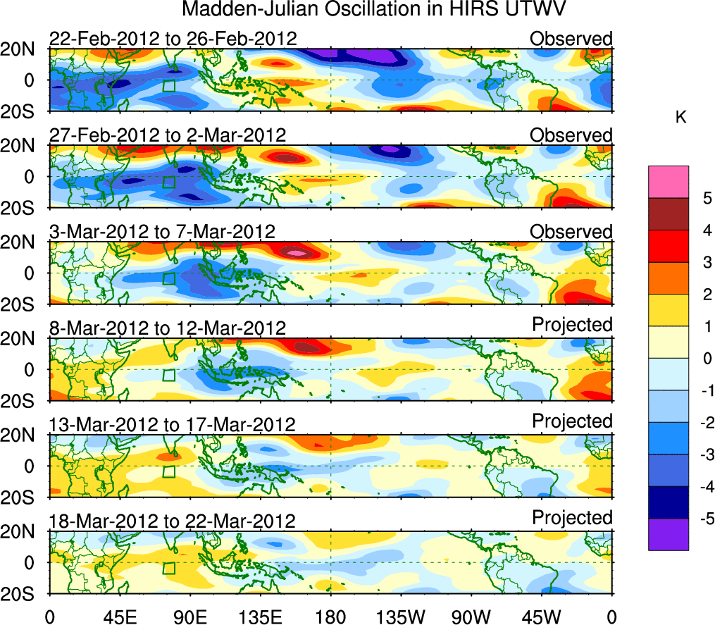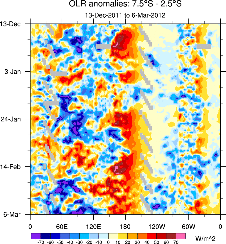 To identify tropical waves in near real-time, the OLR and UTWV data are filtered following Wheeler & Weickmann (2001 MWR). The daily anomalies are calculated using the first 3 harmonics of the seasonal cycle for 1979–2009. Missing values are then filled using linear interpolation in space and time. The most recent 365 days of anomalies are padded with 659 days of zeroes, and the result is filtered for each wave type.
