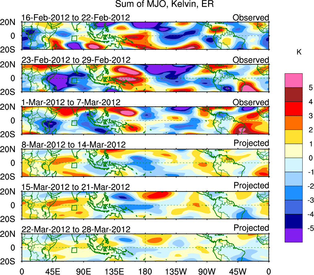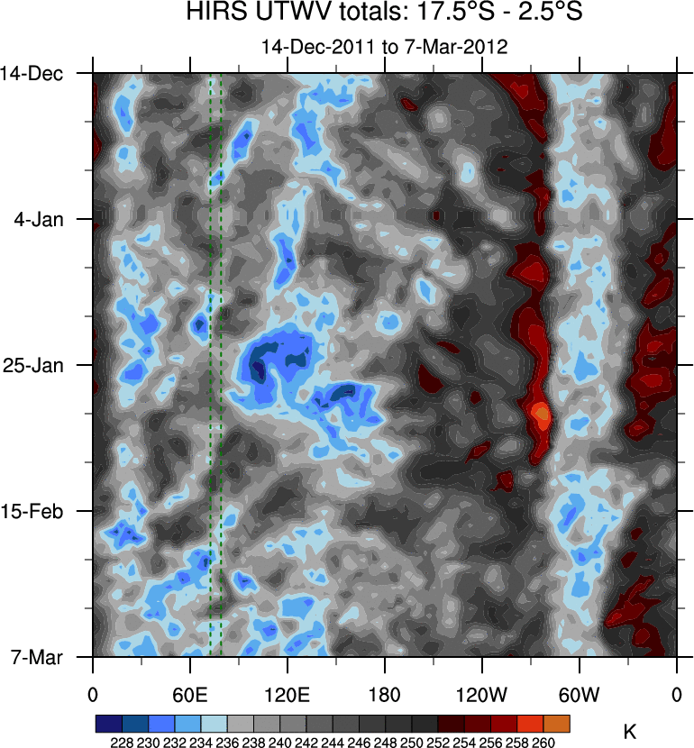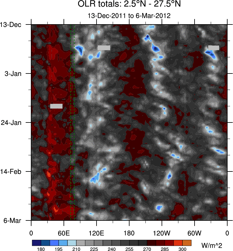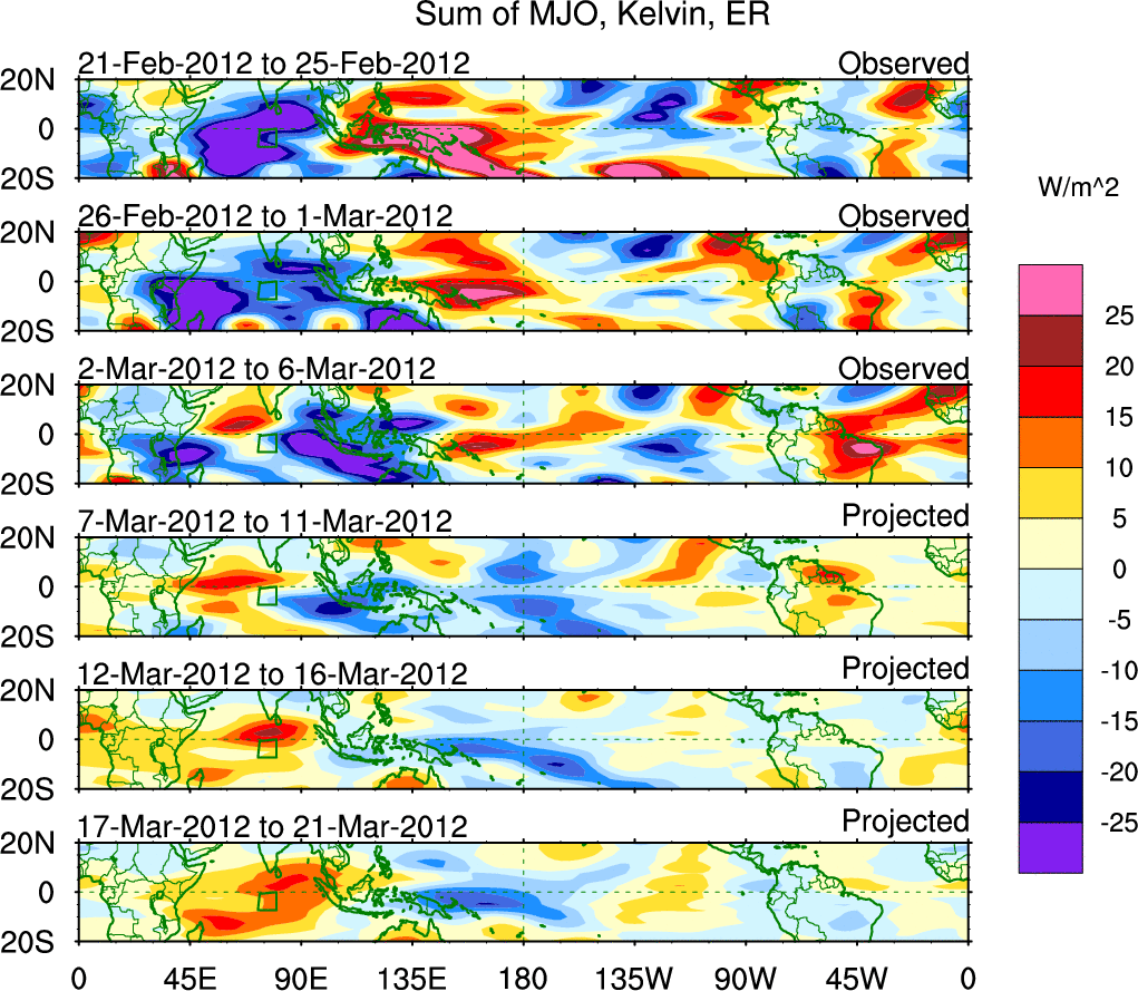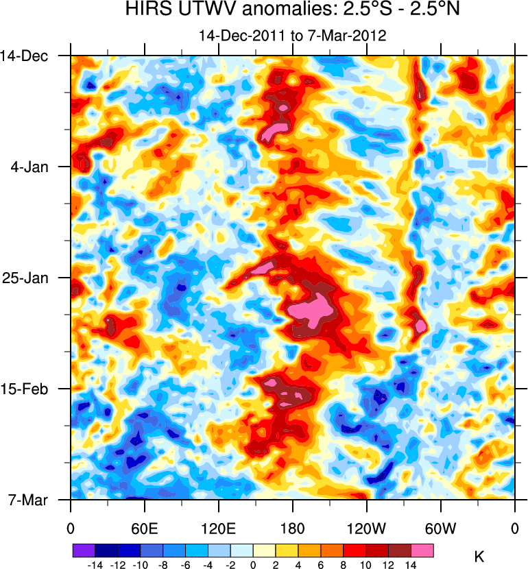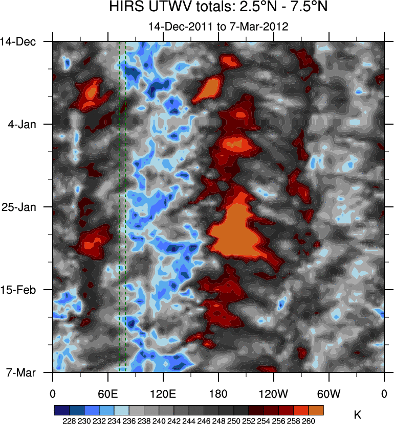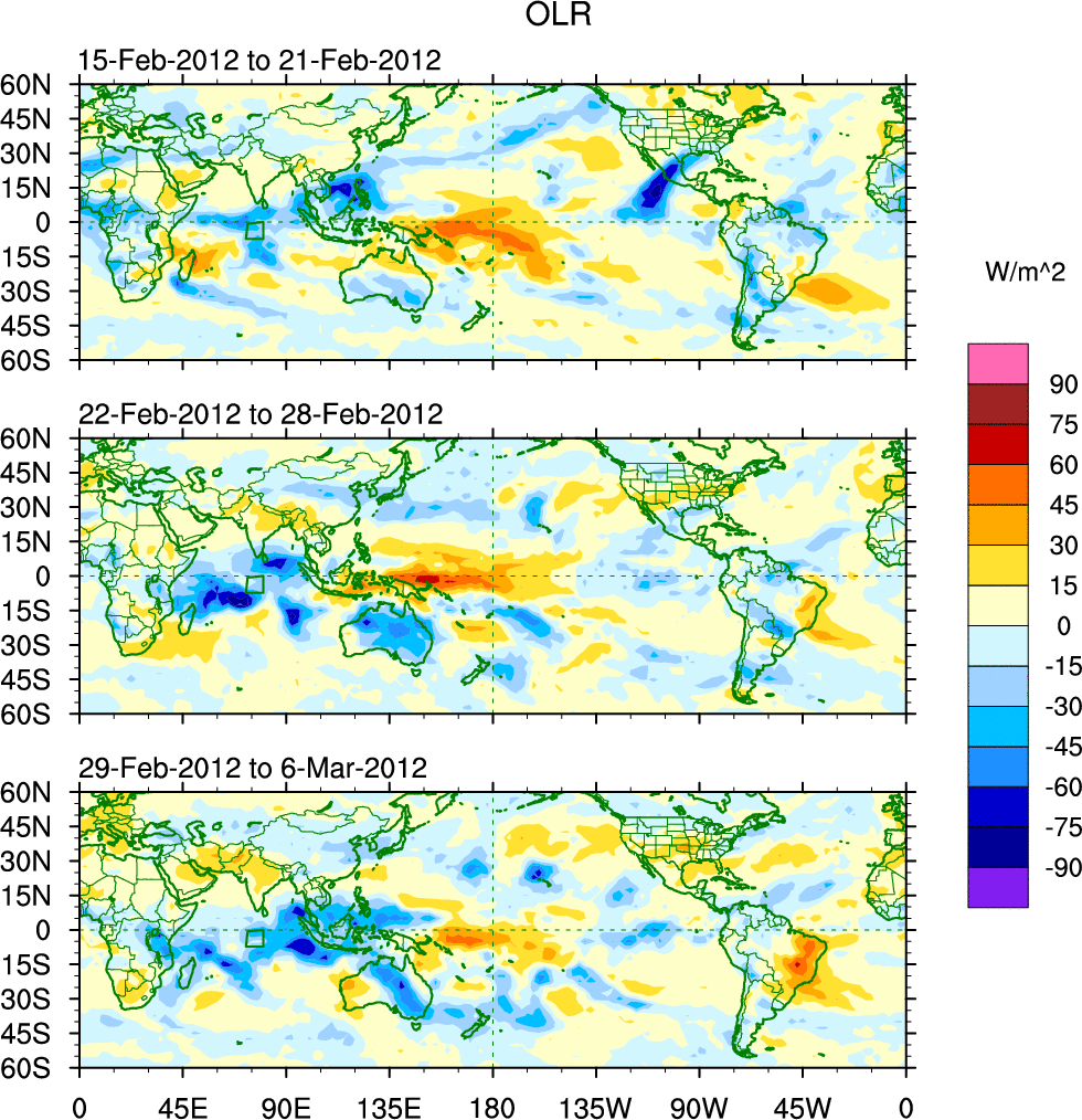 To identify tropical waves in near real-time, the OLR and UTWV data are filtered following Wheeler & Weickmann (2001 MWR). The daily anomalies are calculated using the first 3 harmonics of the seasonal cycle for 1979–2009. Missing values are then filled using linear interpolation in space and time. The most recent 365 days of anomalies are padded with 659 days of zeroes, and the result is filtered for each wave type.