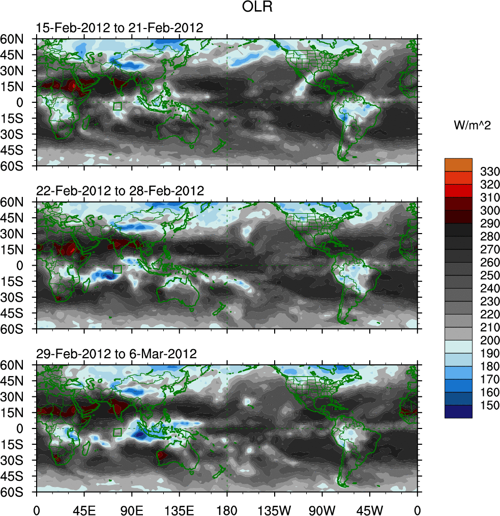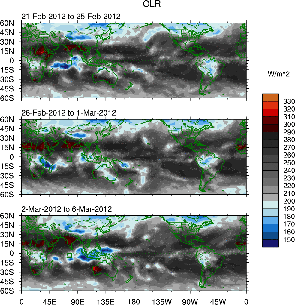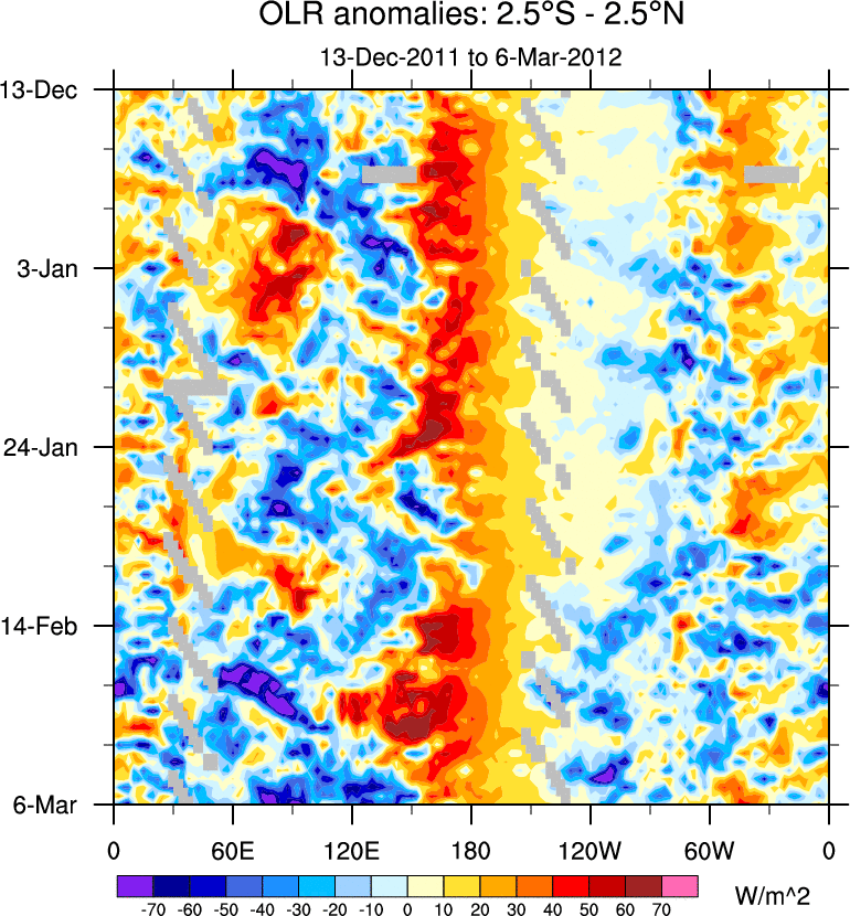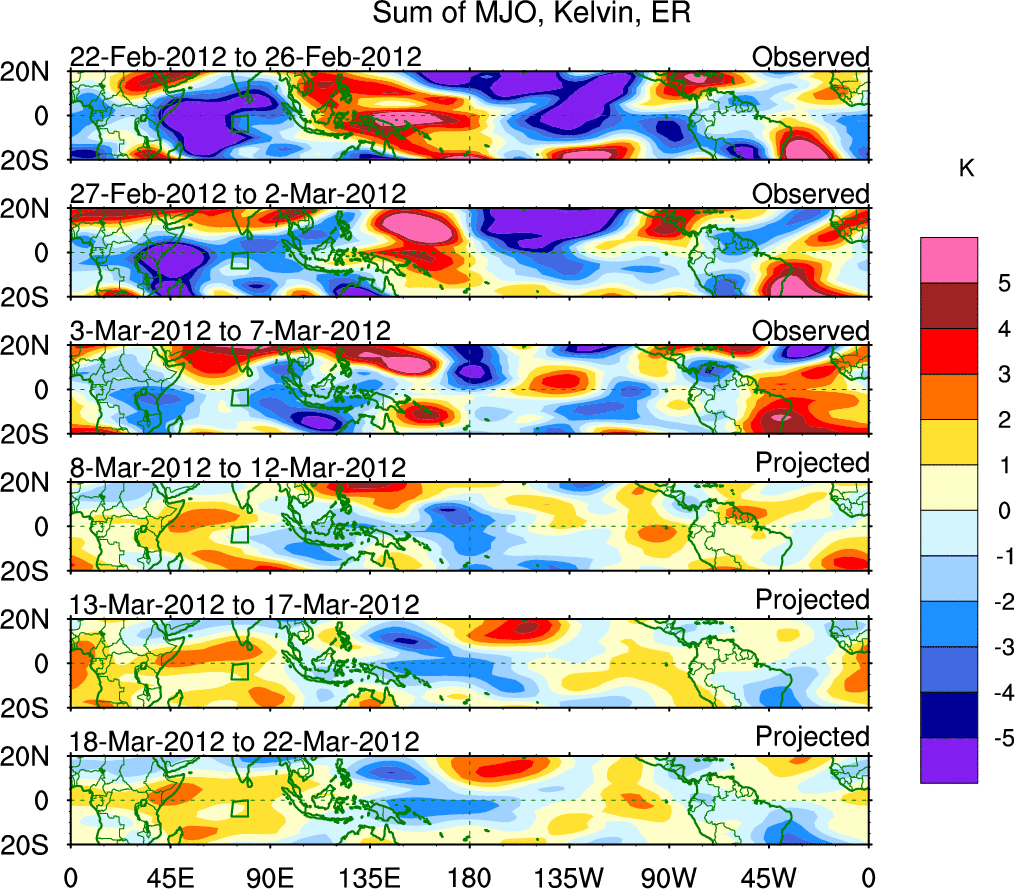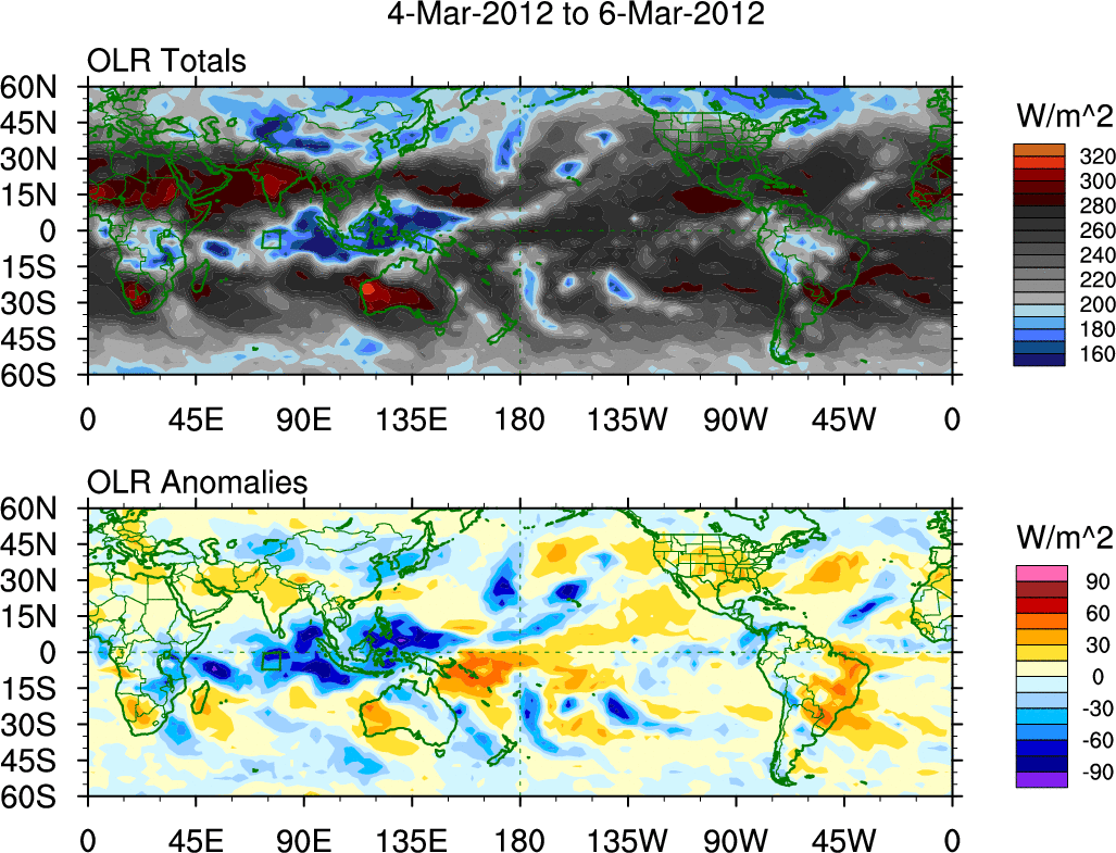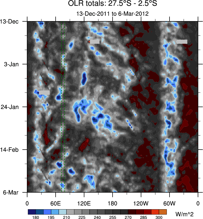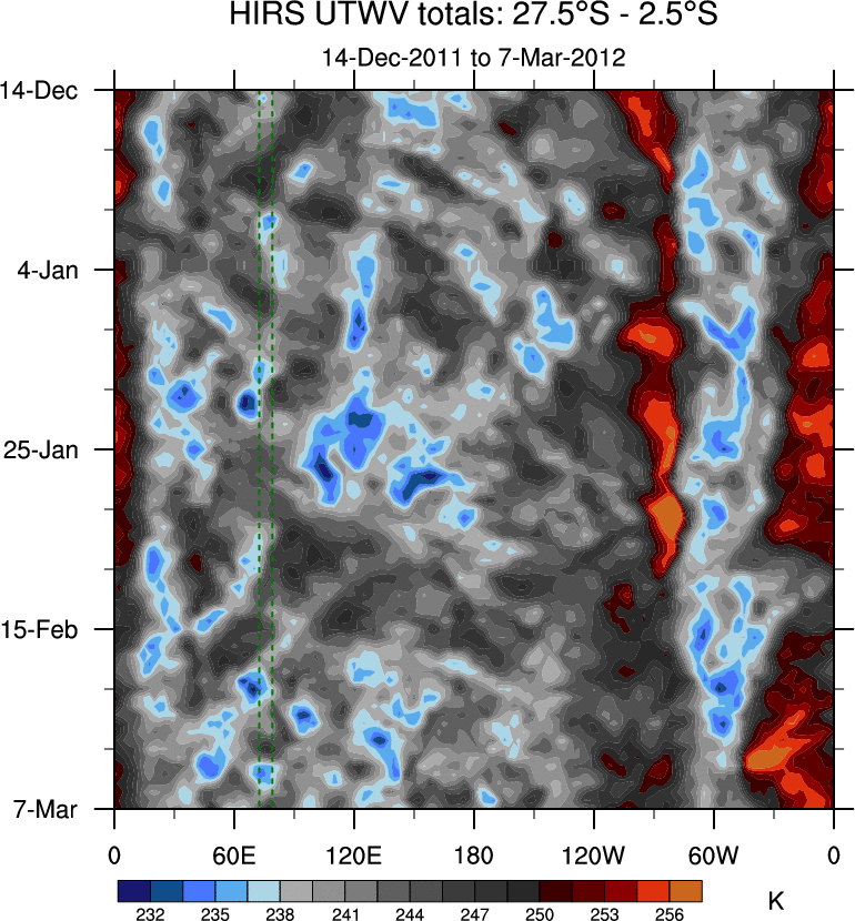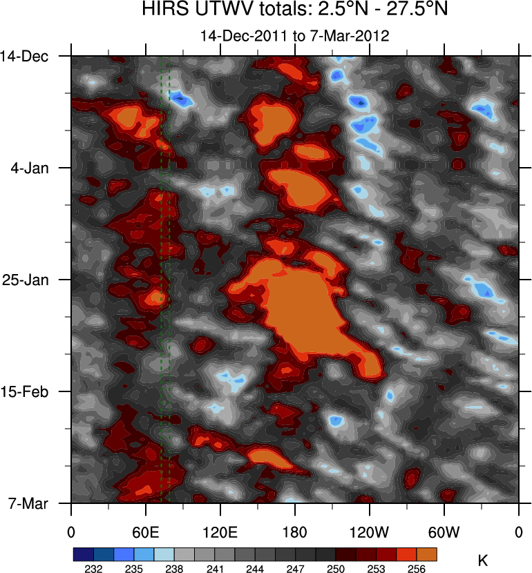 To identify tropical waves in near real-time, the OLR and UTWV data are filtered following Wheeler & Weickmann (2001 MWR). The daily anomalies are calculated using the first 3 harmonics of the seasonal cycle for 1979–2009. Missing values are then filled using linear interpolation in space and time. The most recent 365 days of anomalies are padded with 659 days of zeroes, and the result is filtered for each wave type.