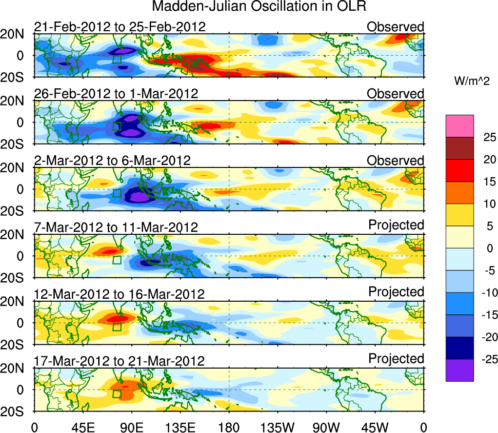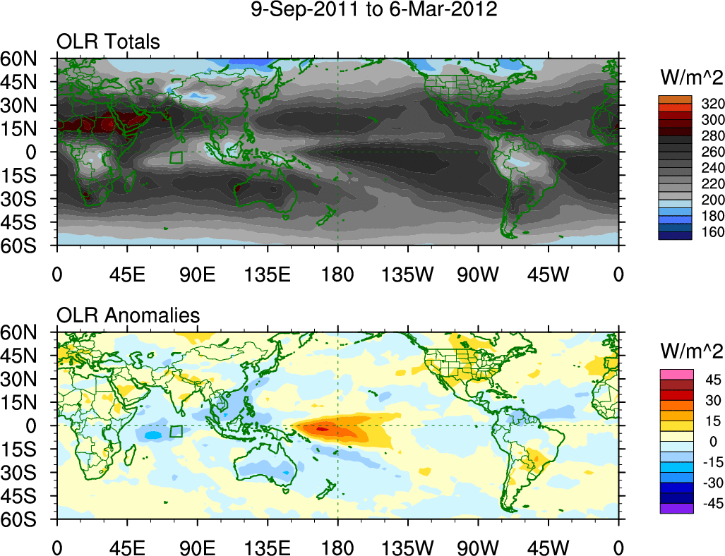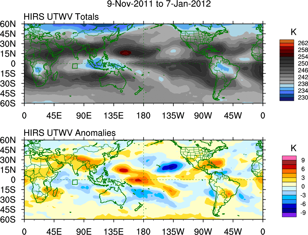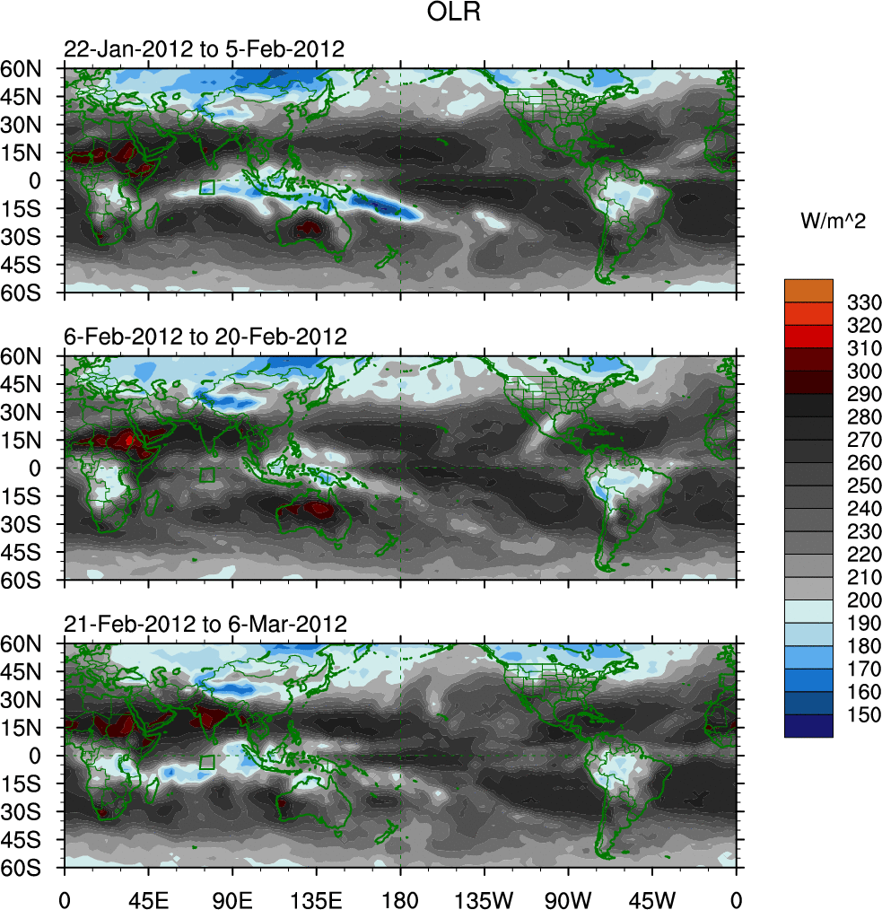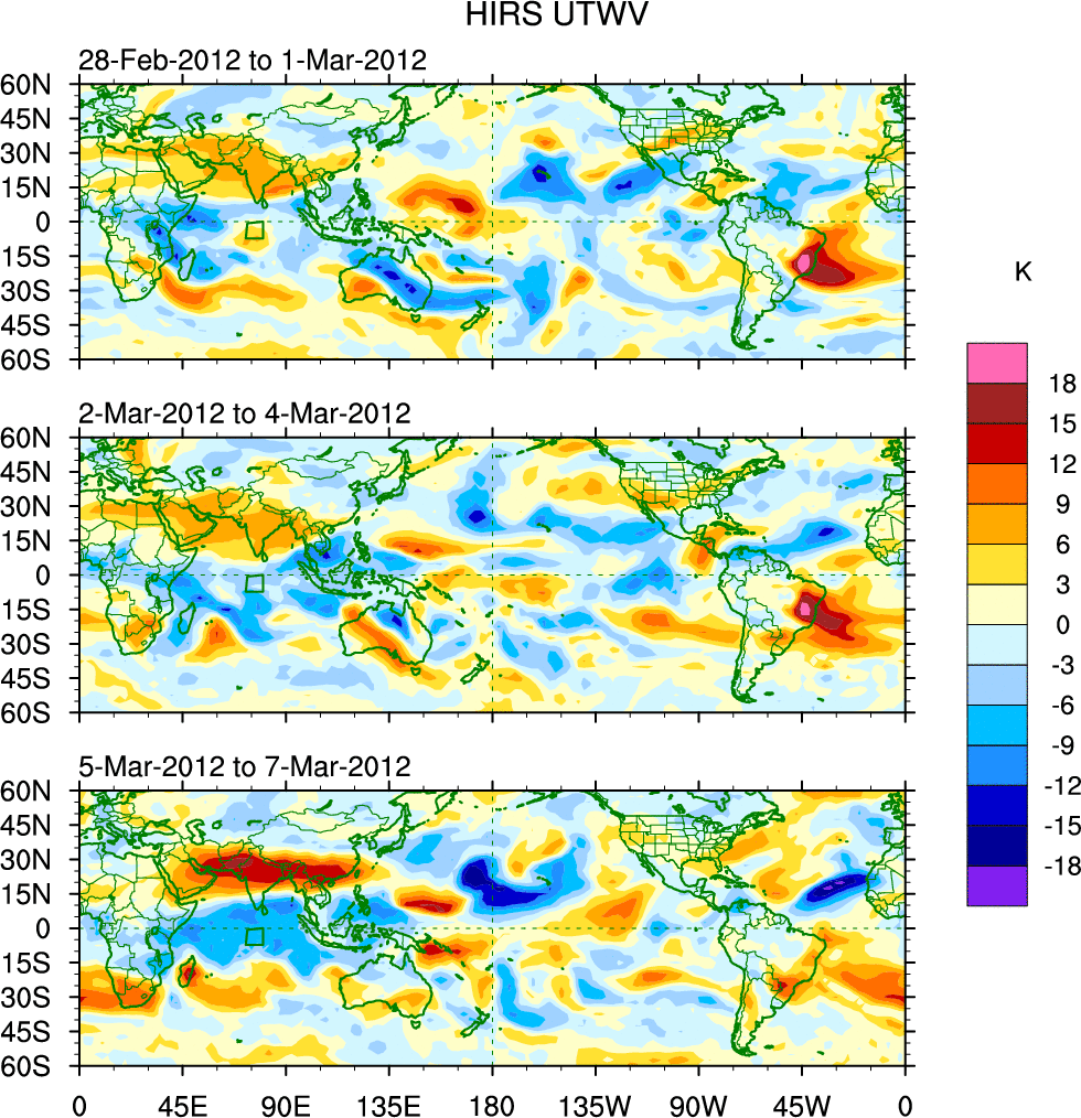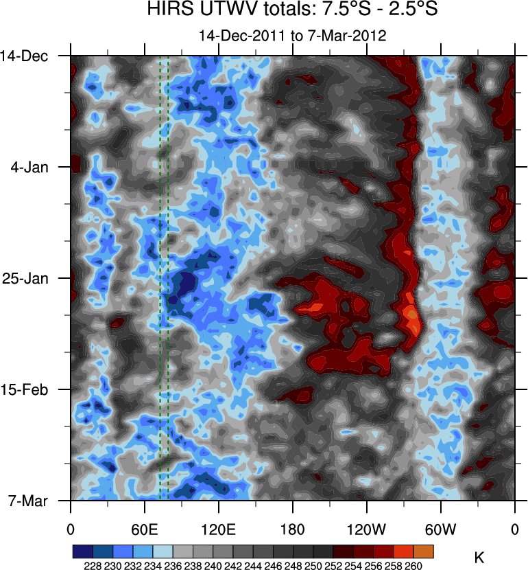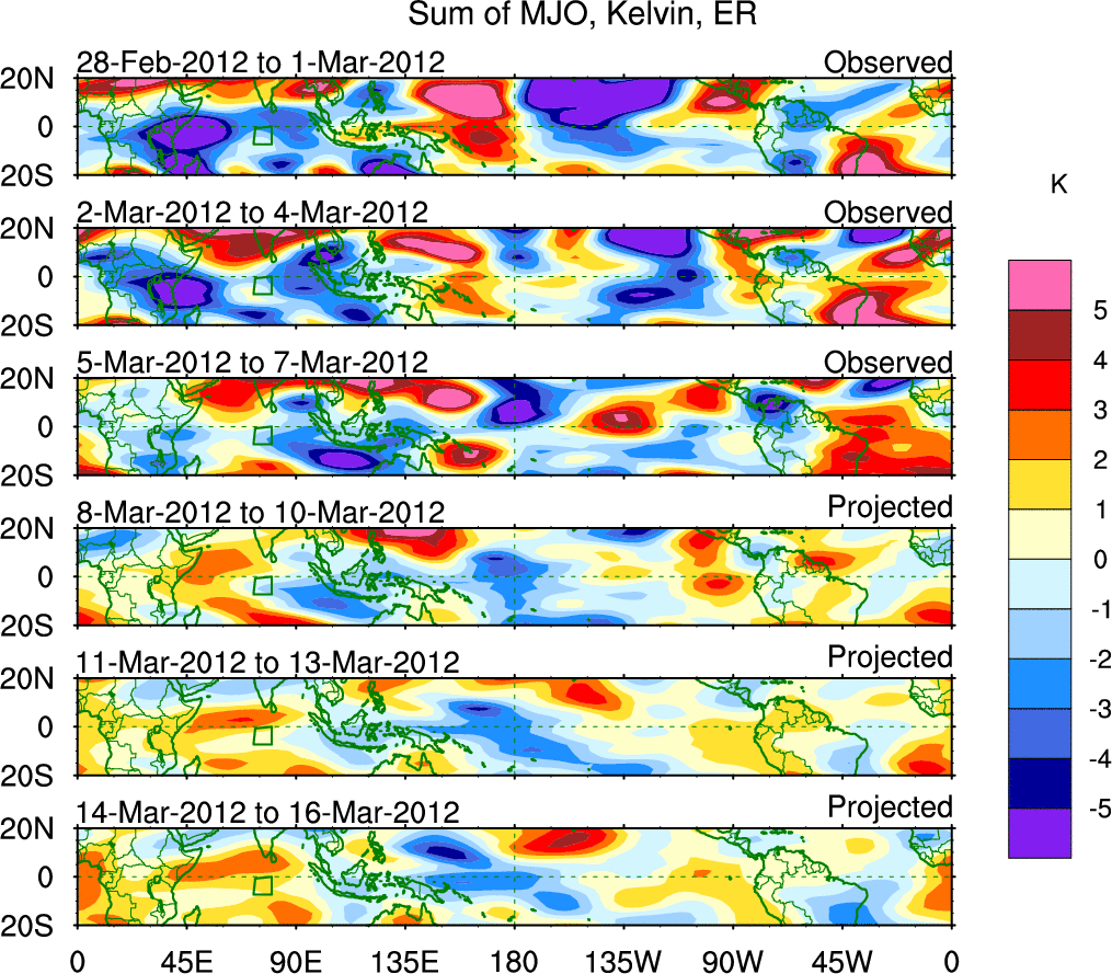 To identify tropical waves in near real-time, the OLR and UTWV data are filtered following Wheeler & Weickmann (2001 MWR). The daily anomalies are calculated using the first 3 harmonics of the seasonal cycle for 1979–2009. Missing values are then filled using linear interpolation in space and time. The most recent 365 days of anomalies are padded with 659 days of zeroes, and the result is filtered for each wave type.