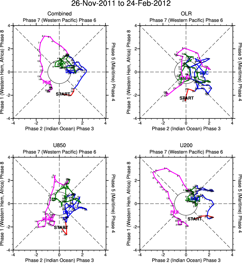 Wheeler and Hendon (2004) constructed the RMM index for monitoring the MJO. This index consists of the first two principal components (PCs) of OLR, 850-hPa zonal wind, and 200-hPa zonal wind averaged 15S-15N.