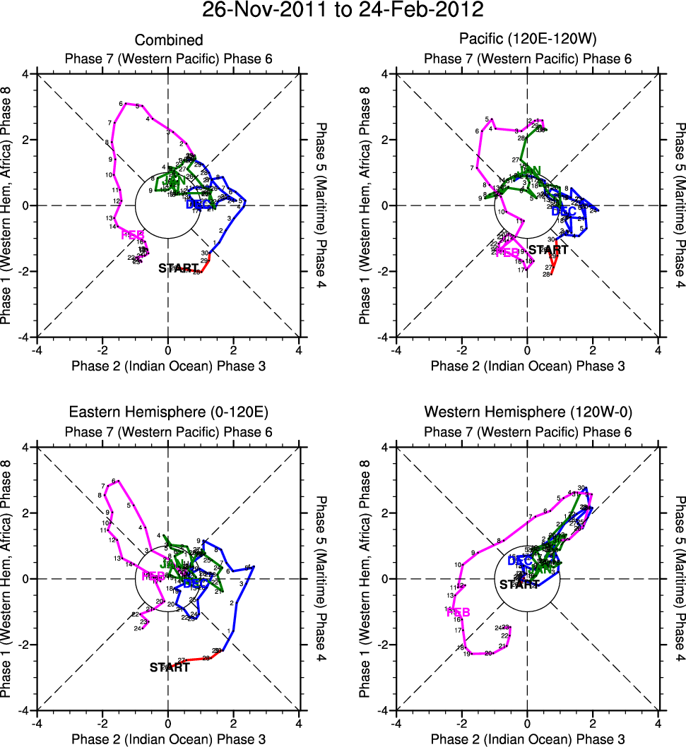 Wheeler and Hendon (2004) constructed the RMM index for monitoring the MJO. This index consists of the first two principal components (PCs) of OLR, 850-hPa zonal wind, and 200-hPa zonal wind averaged 15S-15N.