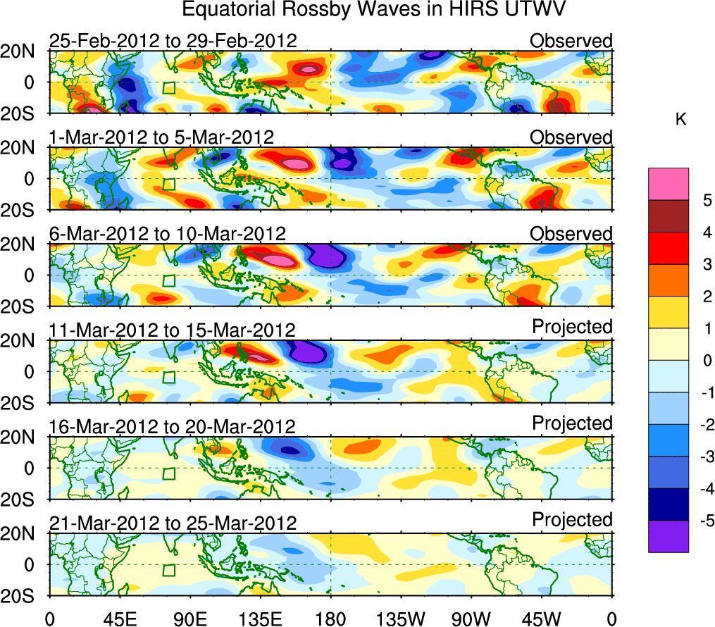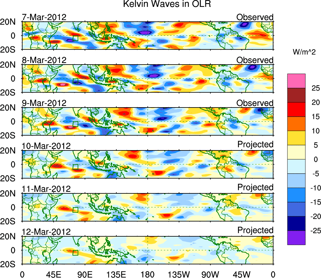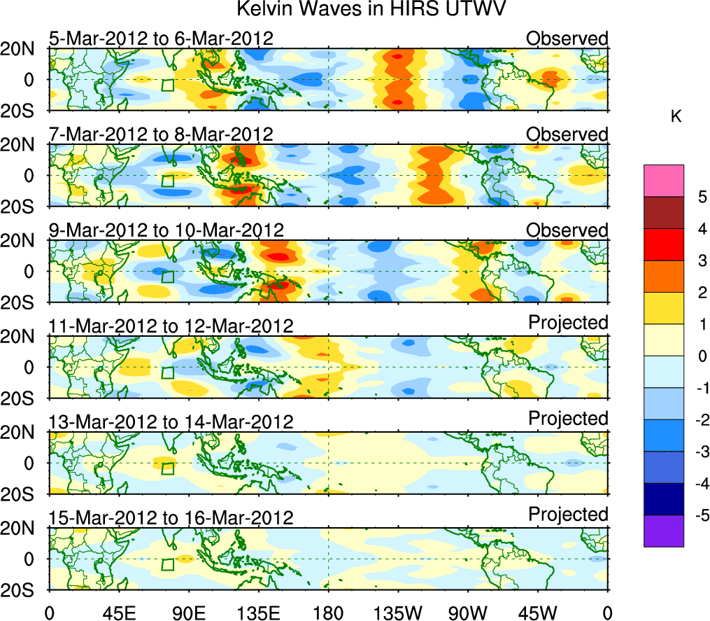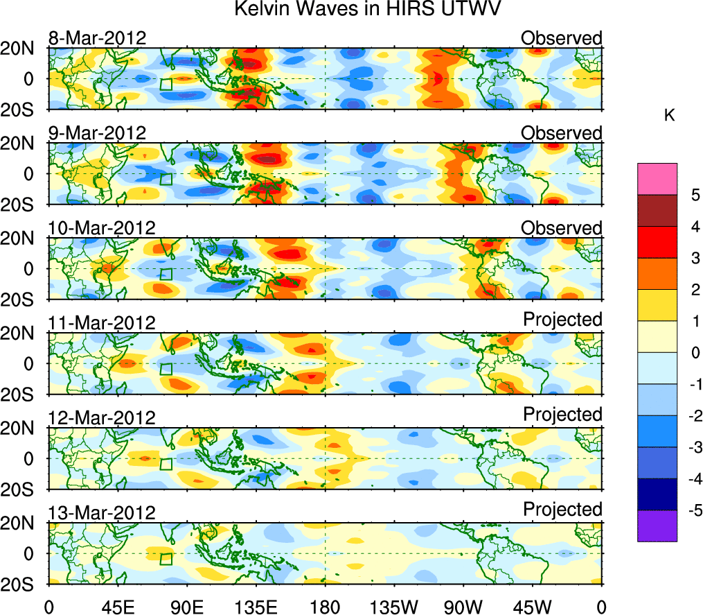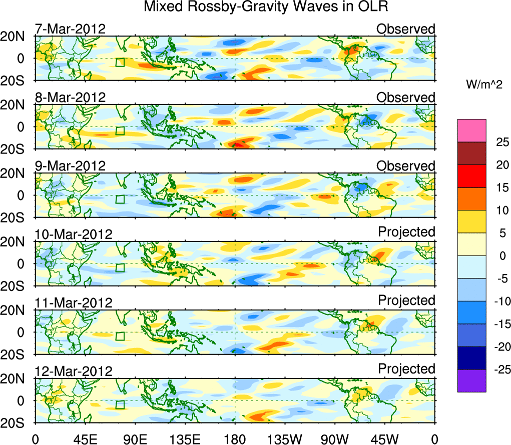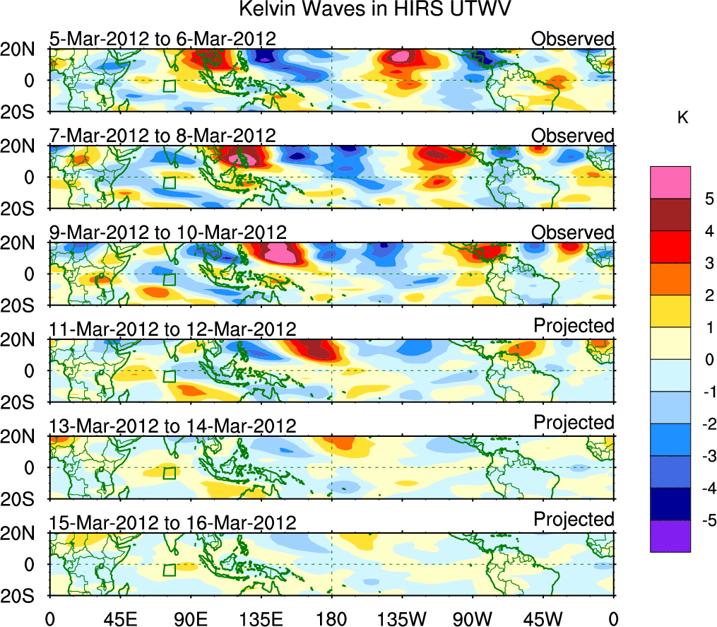 To identify tropical waves in near real-time, the OLR and UTWV data are filtered following Wheeler & Weickmann (2001 MWR). The daily anomalies are calculated using the first 3 harmonics of the seasonal cycle for 1979–2009. Missing values are then filled using linear interpolation in space and time. The most recent 365 days of anomalies are padded with 659 days of zeroes, and the result is filtered for each wave type.