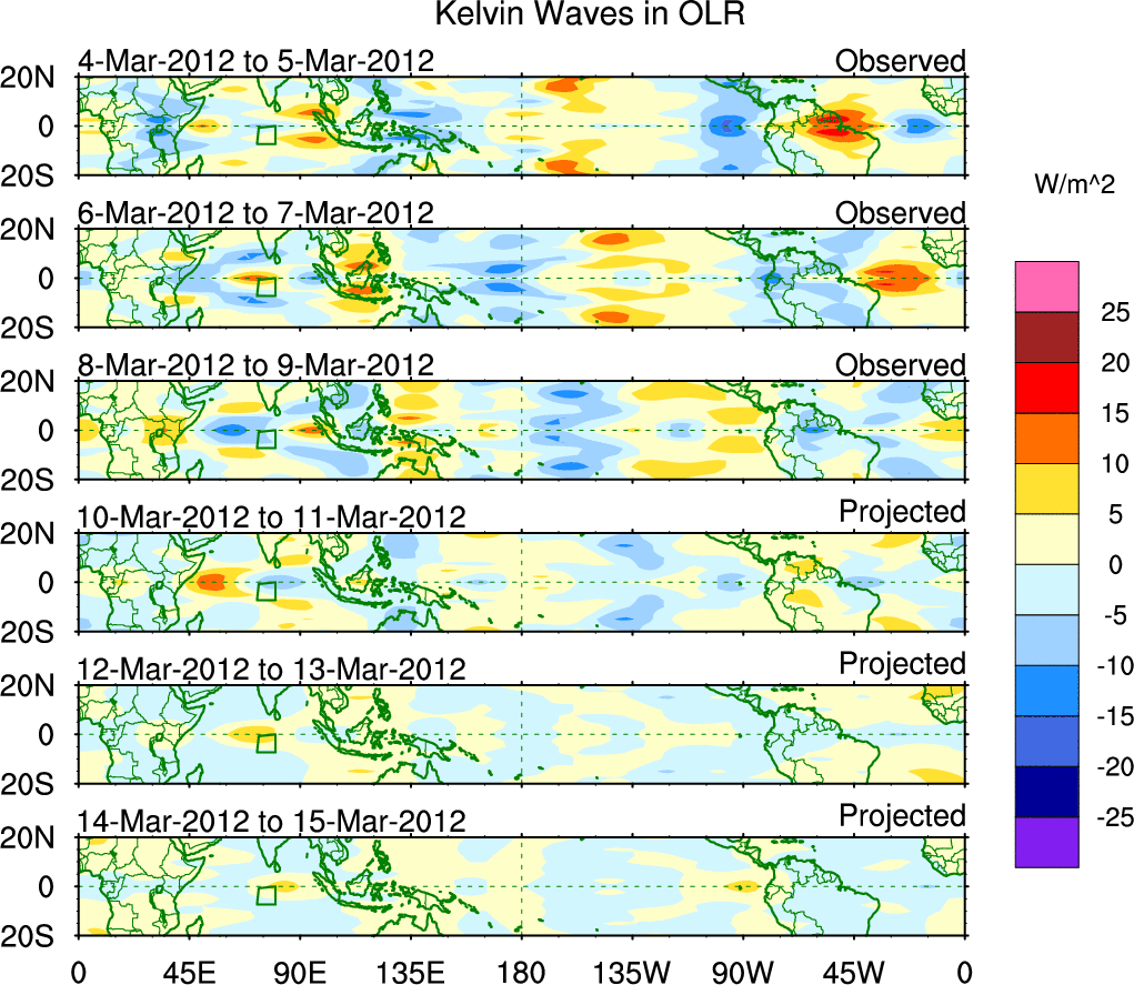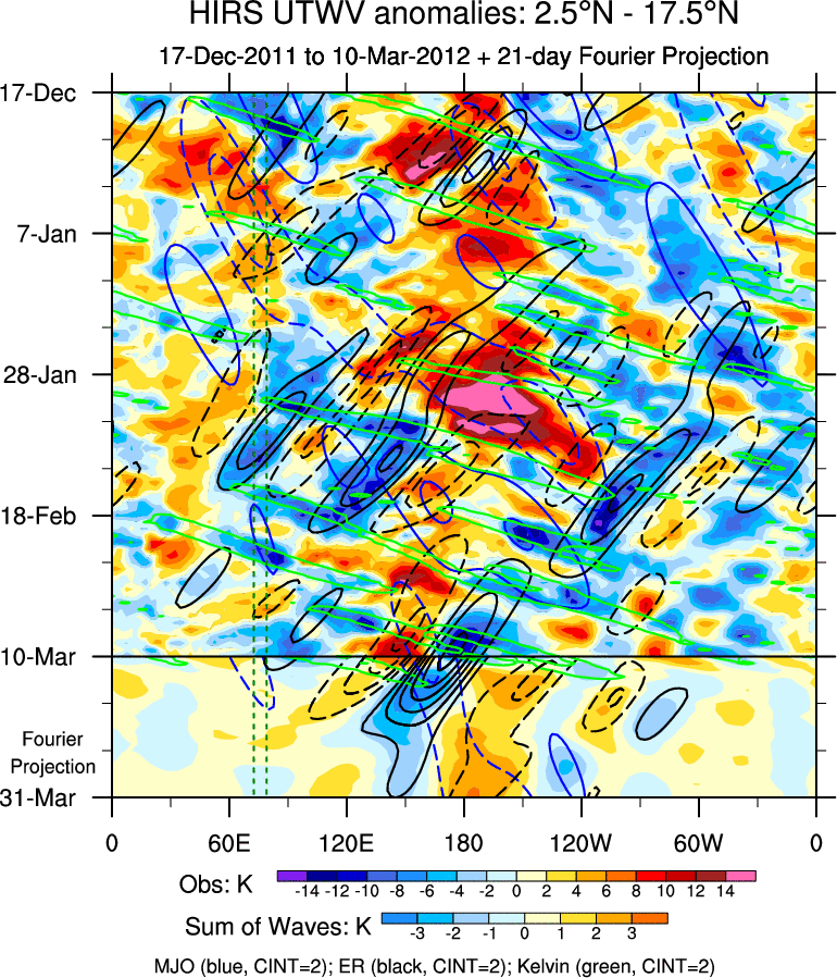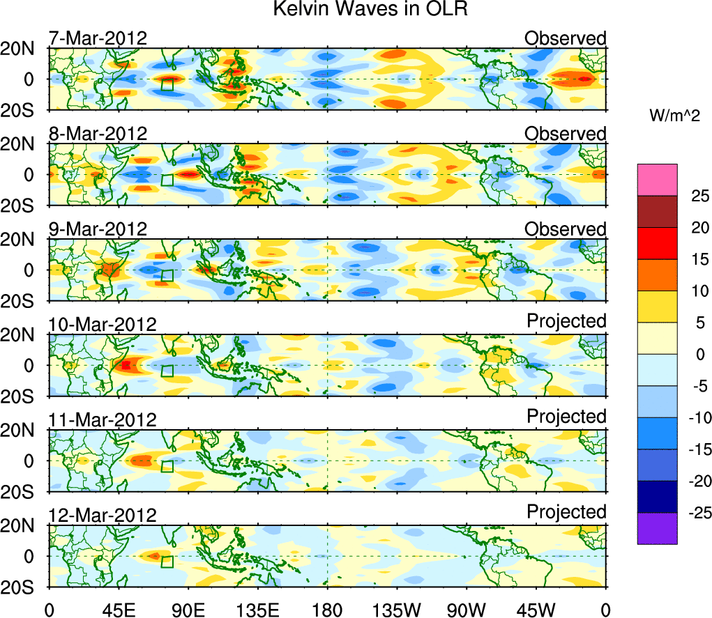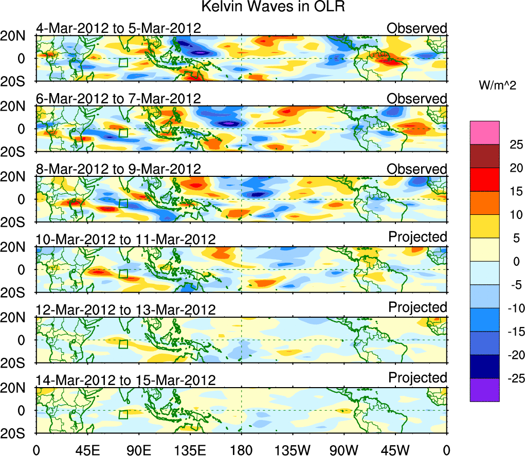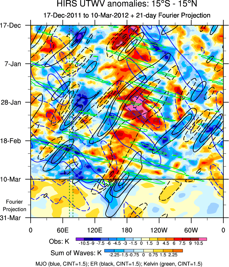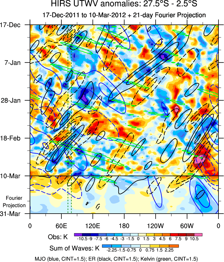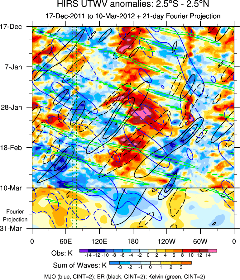 To identify tropical waves in near real-time, the OLR and UTWV data are filtered following Wheeler & Weickmann (2001 MWR). The daily anomalies are calculated using the first 3 harmonics of the seasonal cycle for 1979–2009. Missing values are then filled using linear interpolation in space and time. The most recent 365 days of anomalies are padded with 659 days of zeroes, and the result is filtered for each wave type.