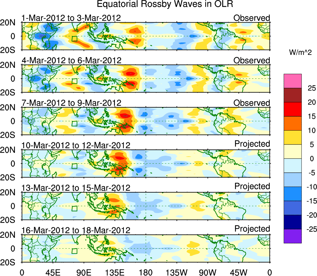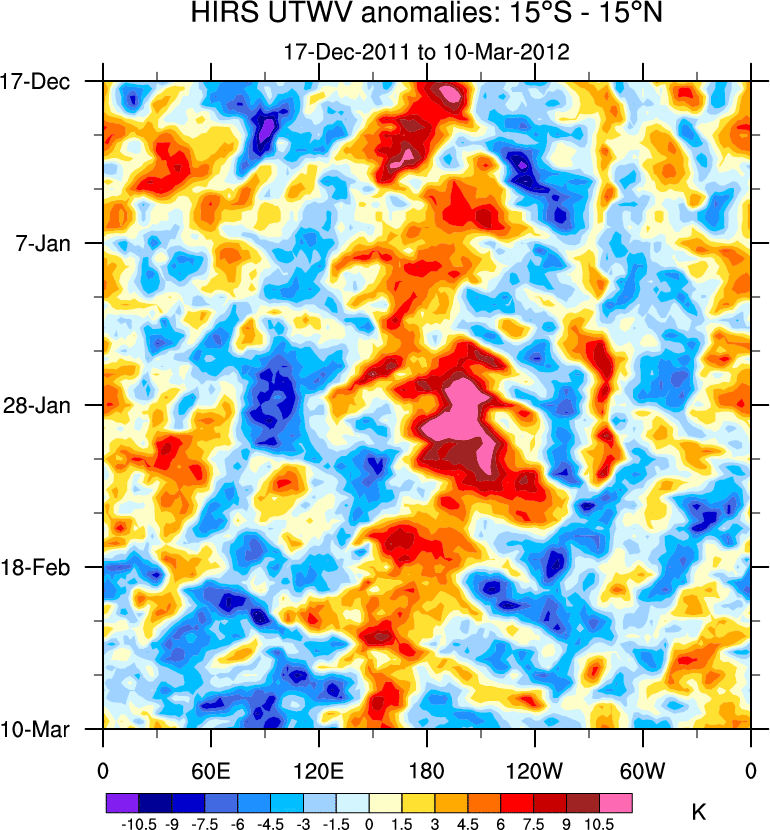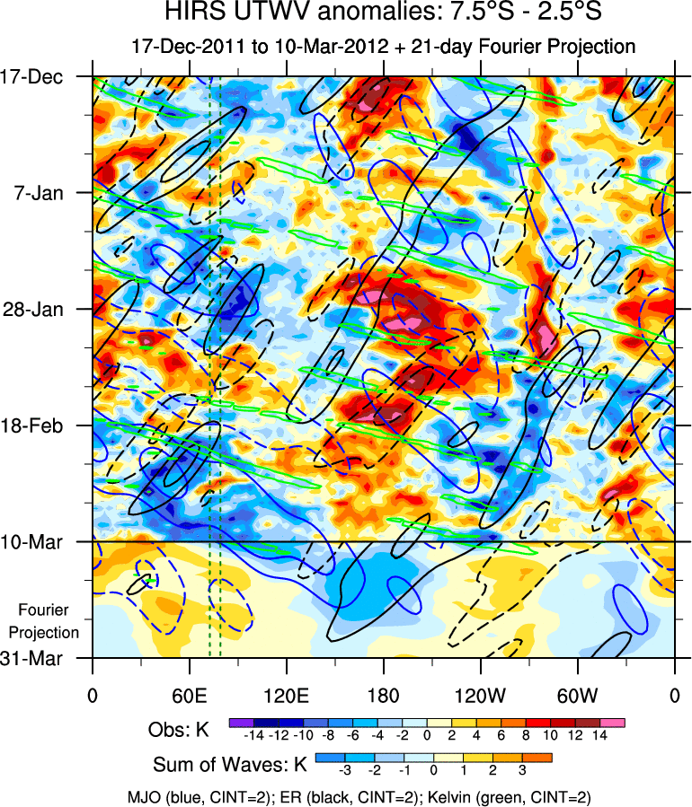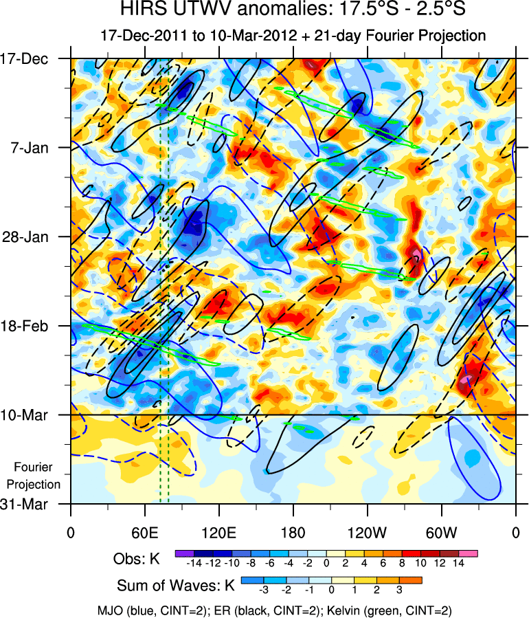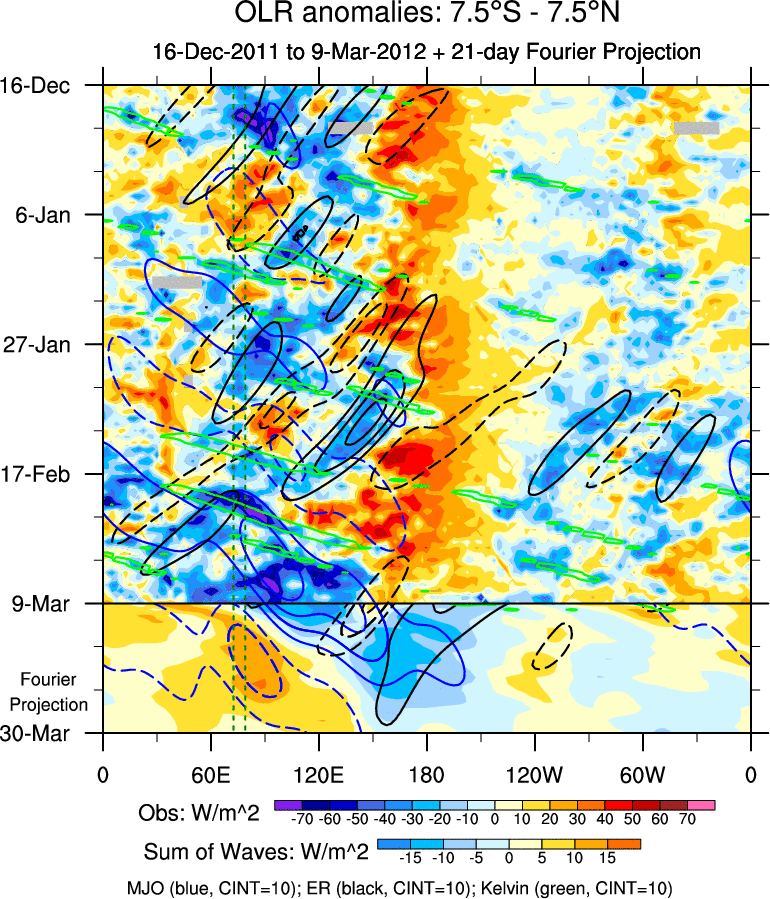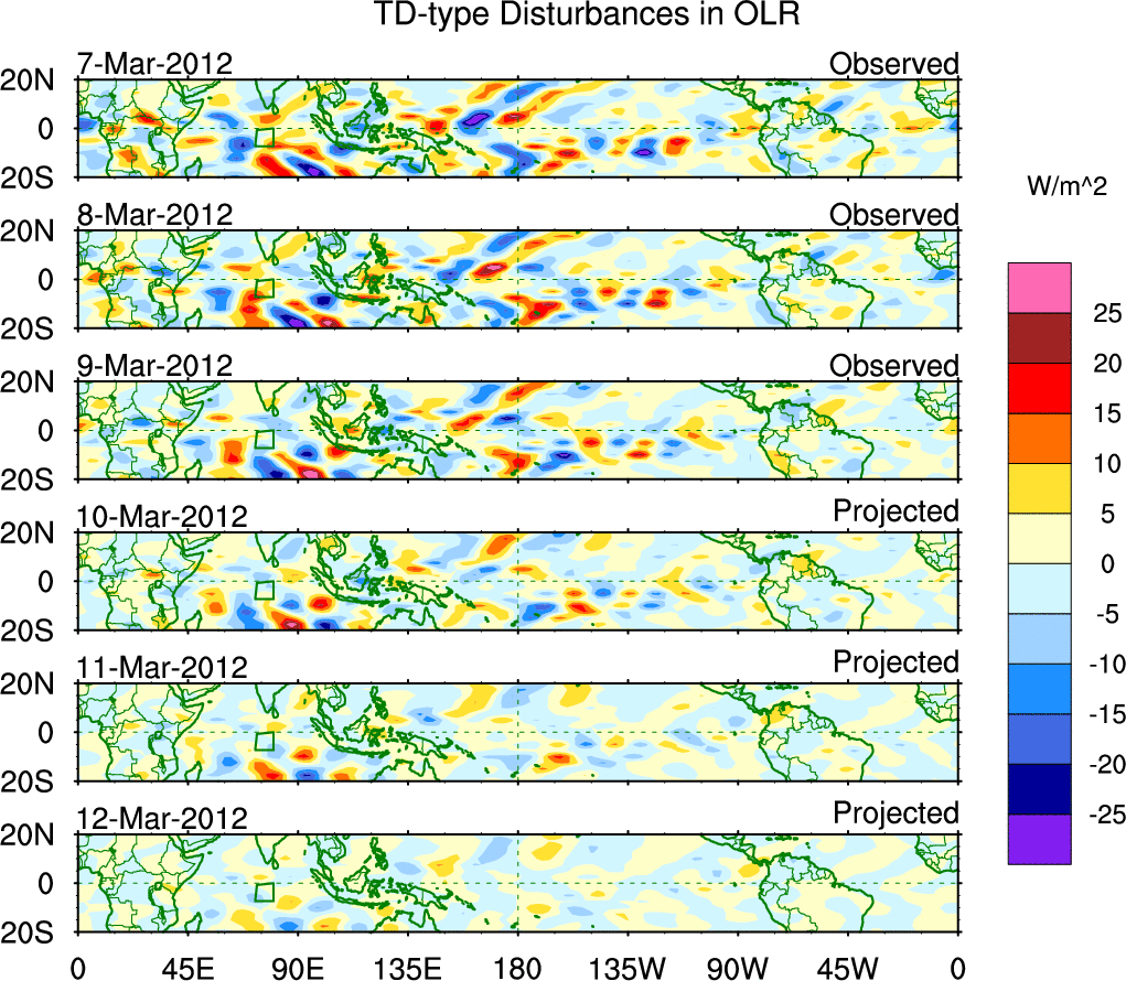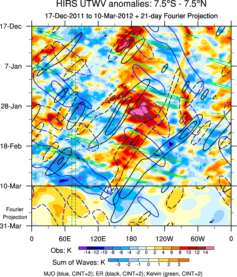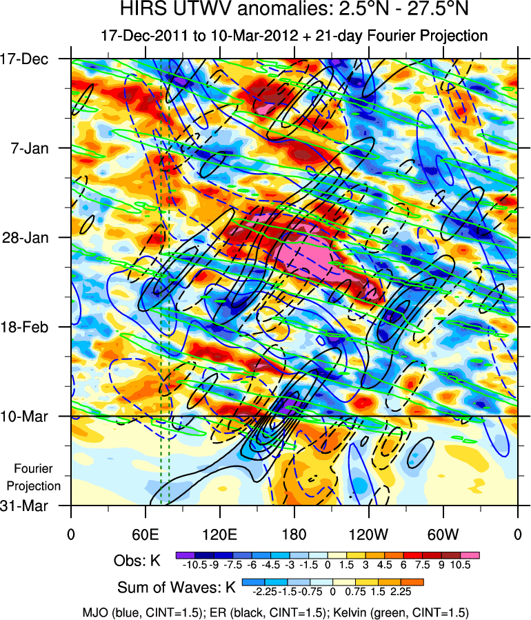 To identify tropical waves in near real-time, the OLR and UTWV data are filtered following Wheeler & Weickmann (2001 MWR). The daily anomalies are calculated using the first 3 harmonics of the seasonal cycle for 1979–2009. Missing values are then filled using linear interpolation in space and time. The most recent 365 days of anomalies are padded with 659 days of zeroes, and the result is filtered for each wave type.