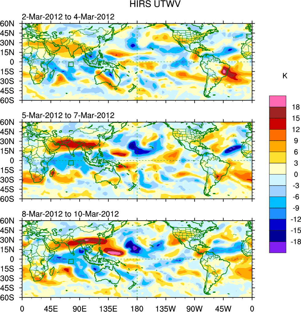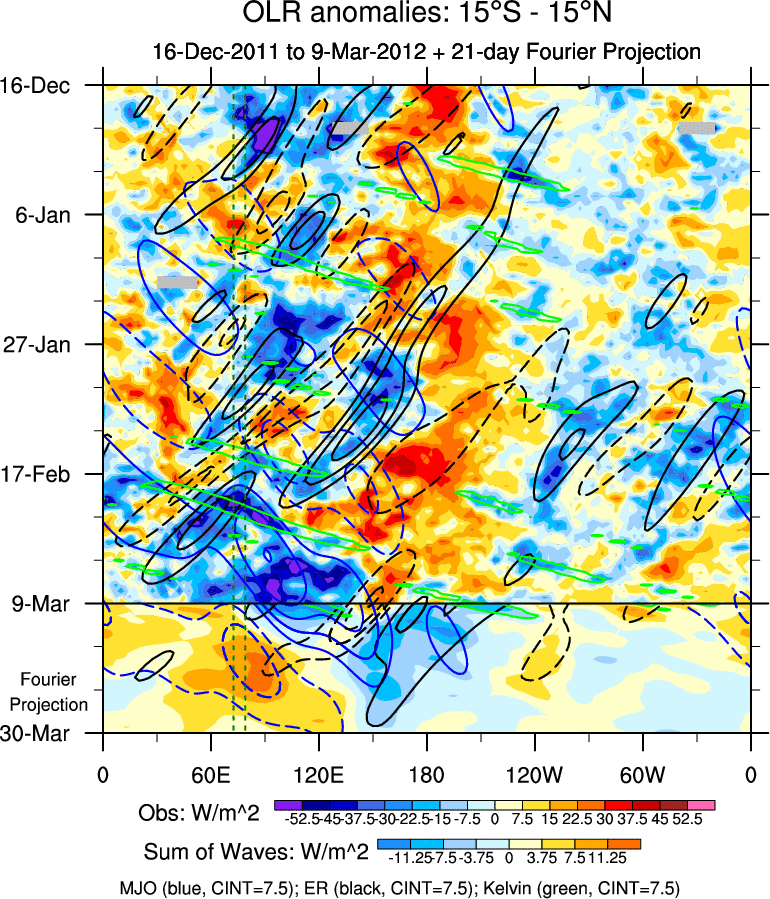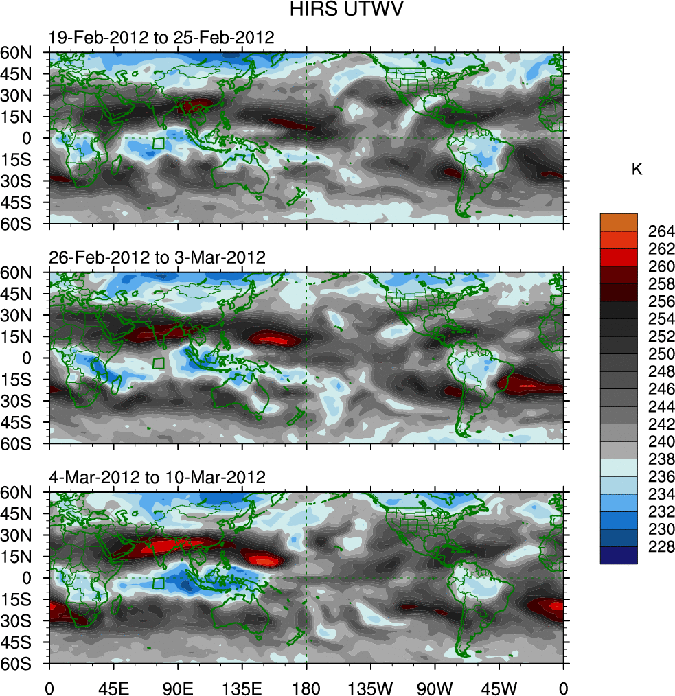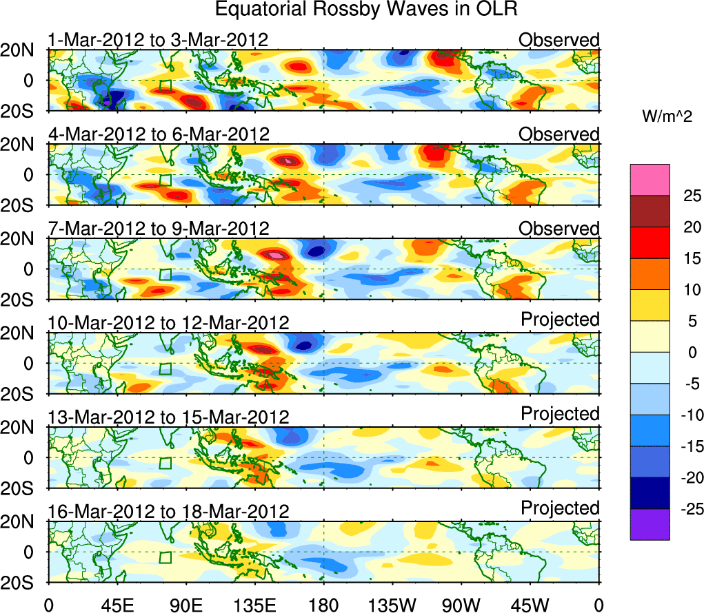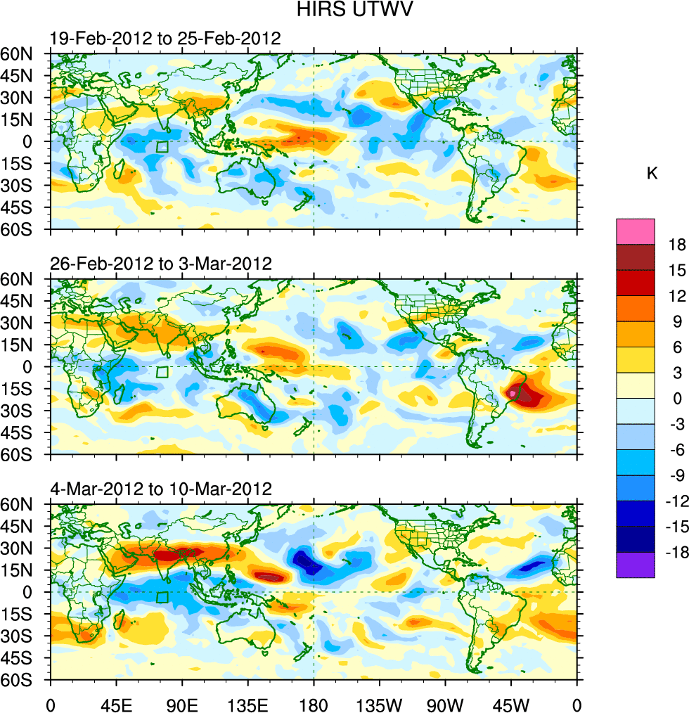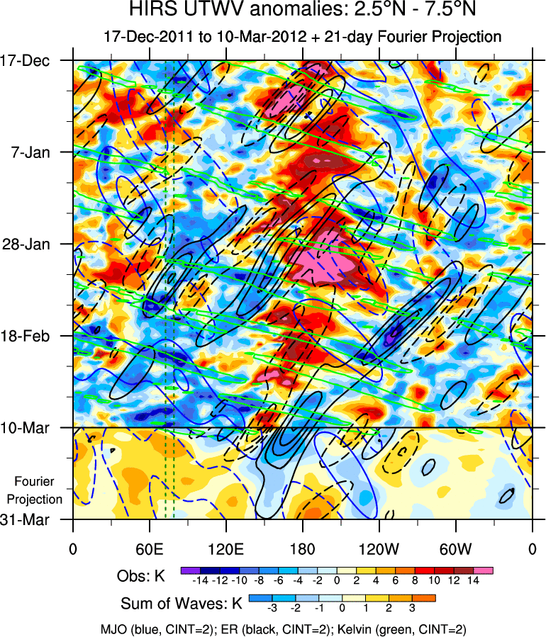To identify tropical waves in near real-time, the OLR and UTWV data are filtered following Wheeler & Weickmann (2001 MWR). The daily anomalies are calculated using the first 3 harmonics of the seasonal cycle for 1979–2009. Missing values are then filled using linear interpolation in space and time. The most recent 365 days of anomalies are padded with 659 days of zeroes, and the result is filtered for each wave type.