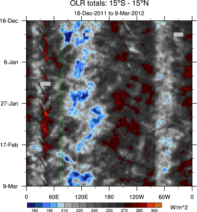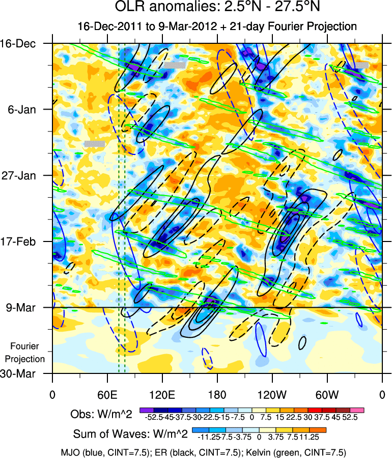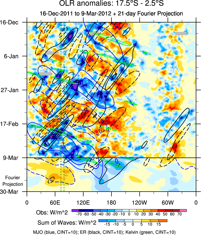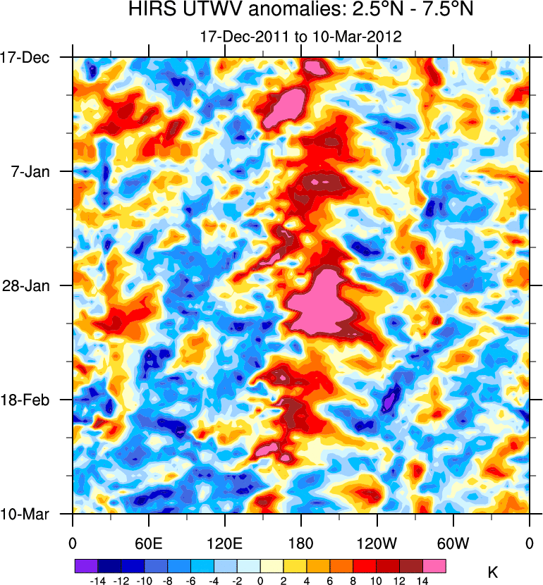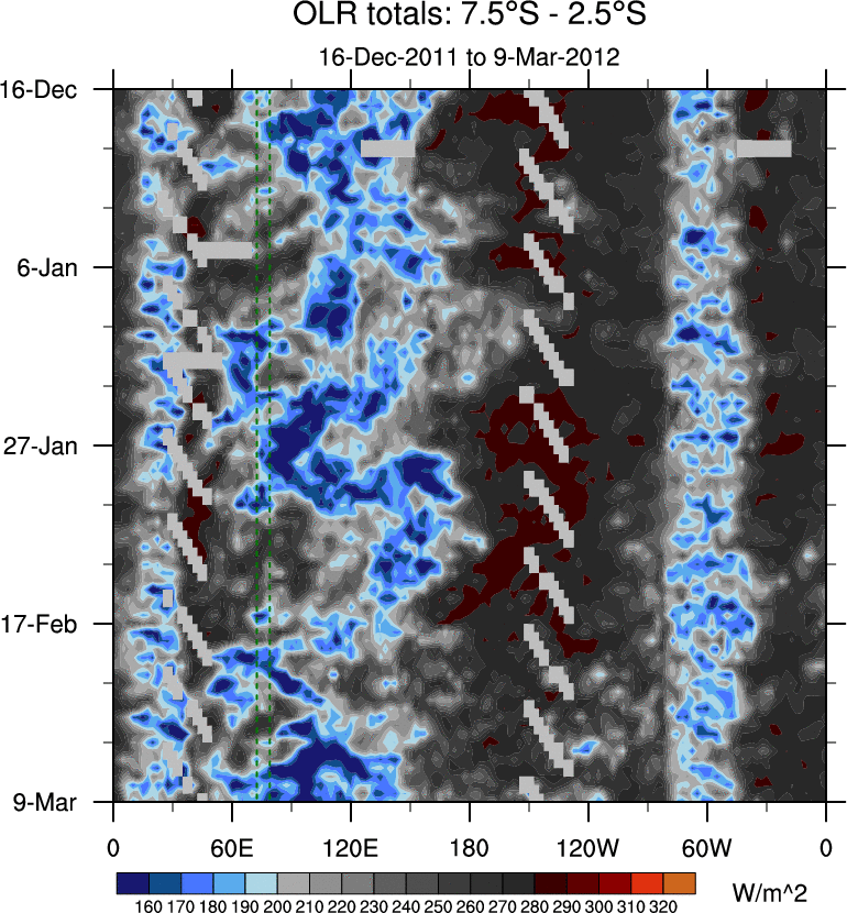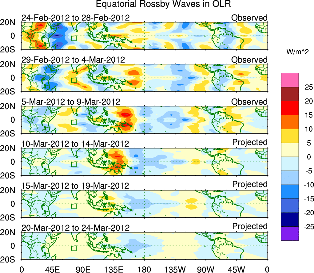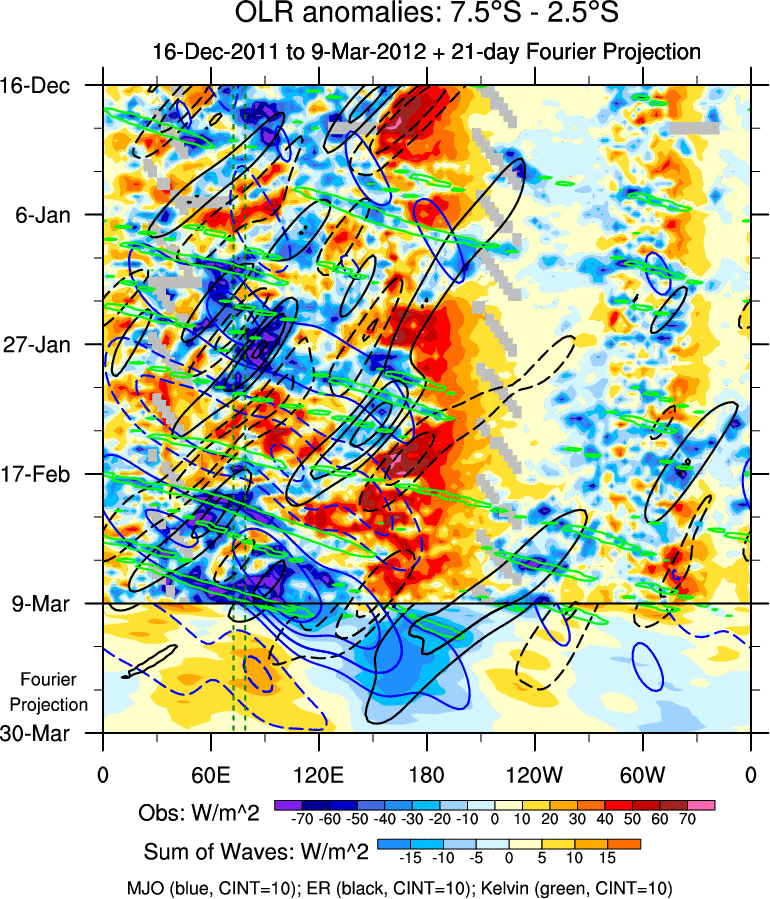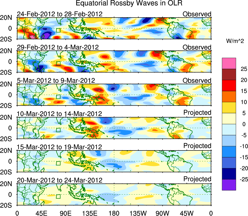 To identify tropical waves in near real-time, the OLR and UTWV data are filtered following Wheeler & Weickmann (2001 MWR). The daily anomalies are calculated using the first 3 harmonics of the seasonal cycle for 1979–2009. Missing values are then filled using linear interpolation in space and time. The most recent 365 days of anomalies are padded with 659 days of zeroes, and the result is filtered for each wave type.