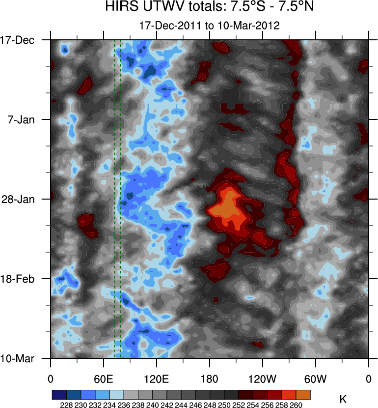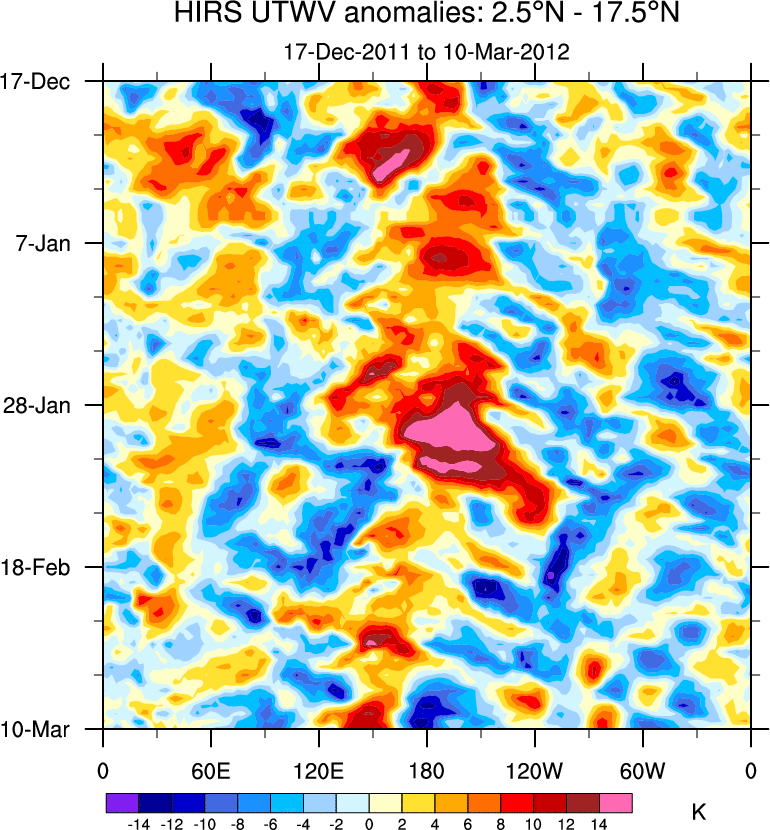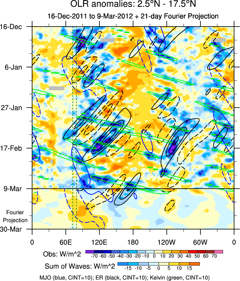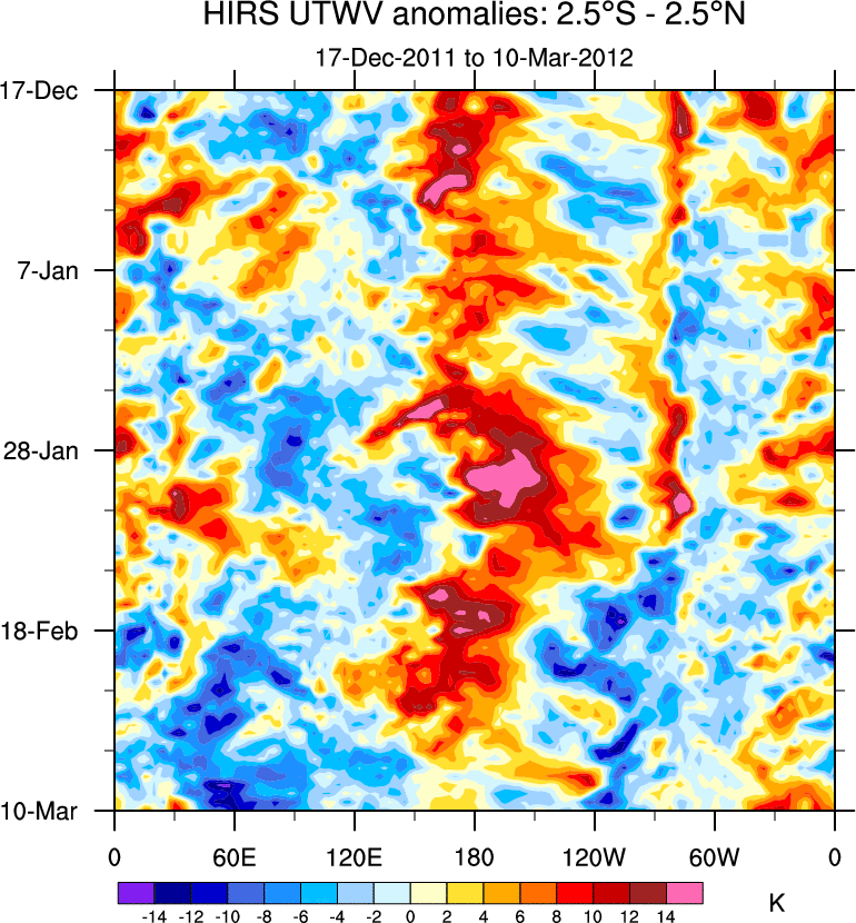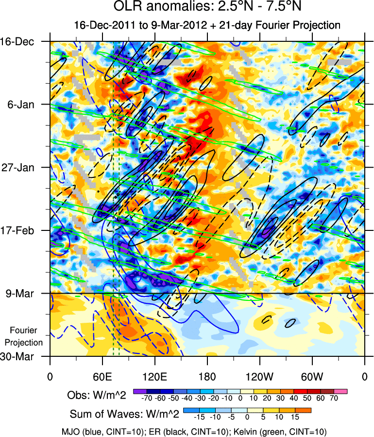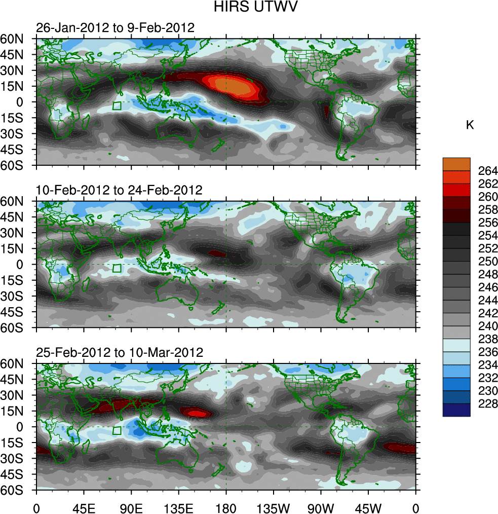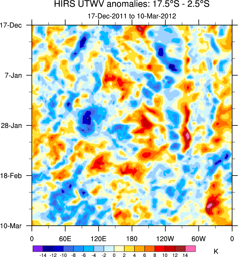 To identify tropical waves in near real-time, the OLR and UTWV data are filtered following Wheeler & Weickmann (2001 MWR). The daily anomalies are calculated using the first 3 harmonics of the seasonal cycle for 1979–2009. Missing values are then filled using linear interpolation in space and time. The most recent 365 days of anomalies are padded with 659 days of zeroes, and the result is filtered for each wave type.