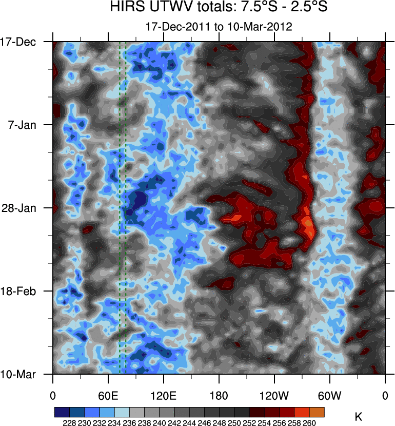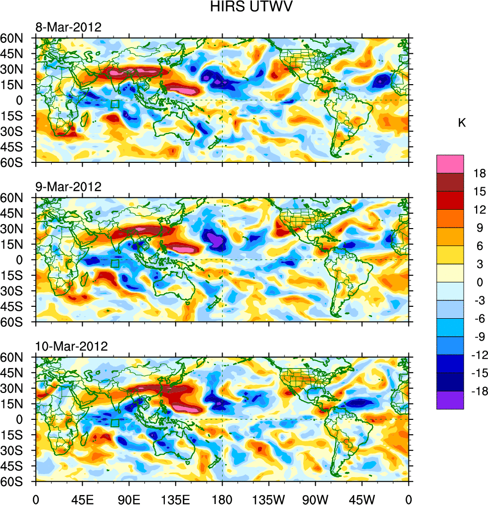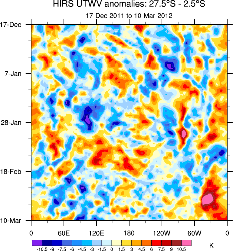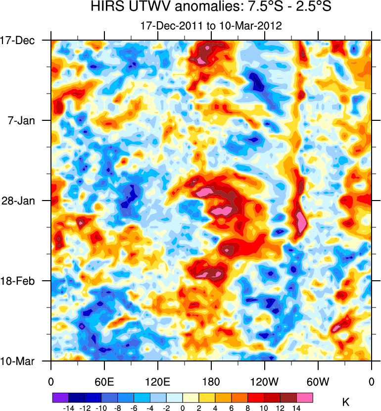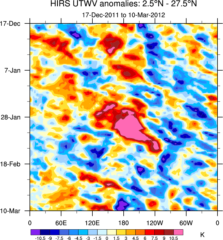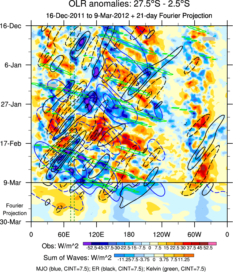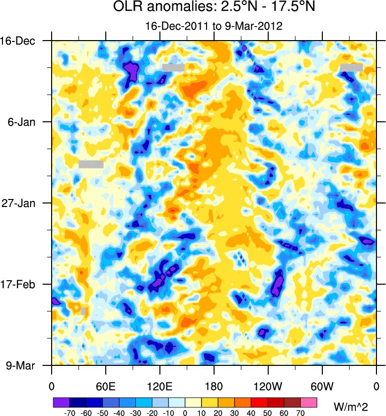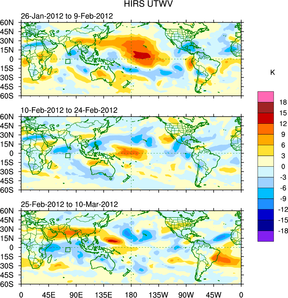 To identify tropical waves in near real-time, the OLR and UTWV data are filtered following Wheeler & Weickmann (2001 MWR). The daily anomalies are calculated using the first 3 harmonics of the seasonal cycle for 1979–2009. Missing values are then filled using linear interpolation in space and time. The most recent 365 days of anomalies are padded with 659 days of zeroes, and the result is filtered for each wave type.