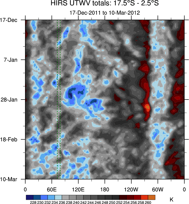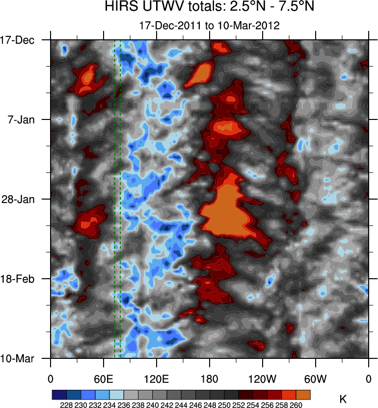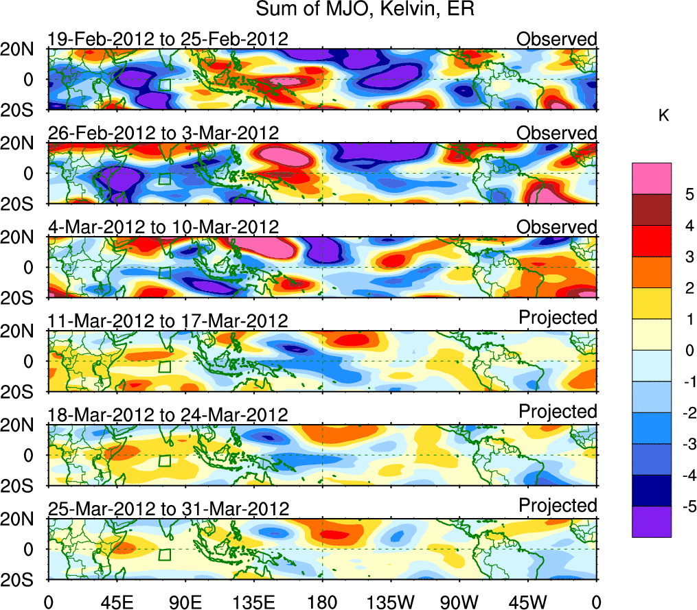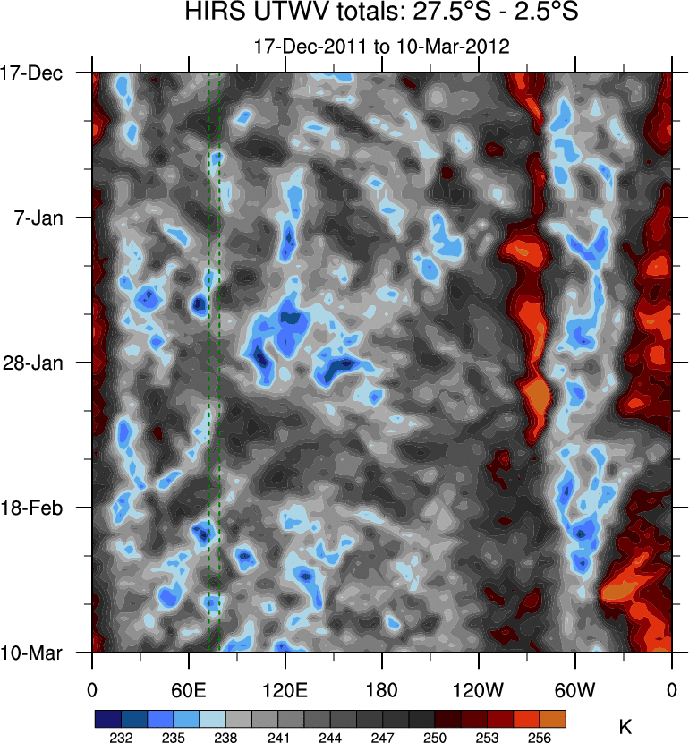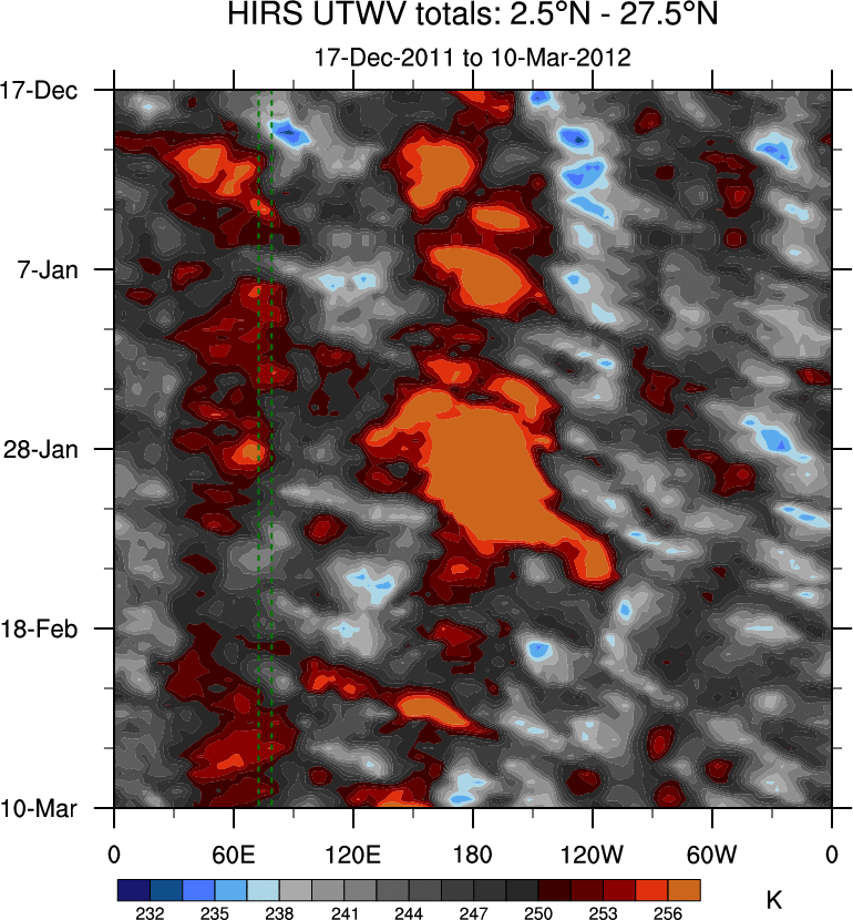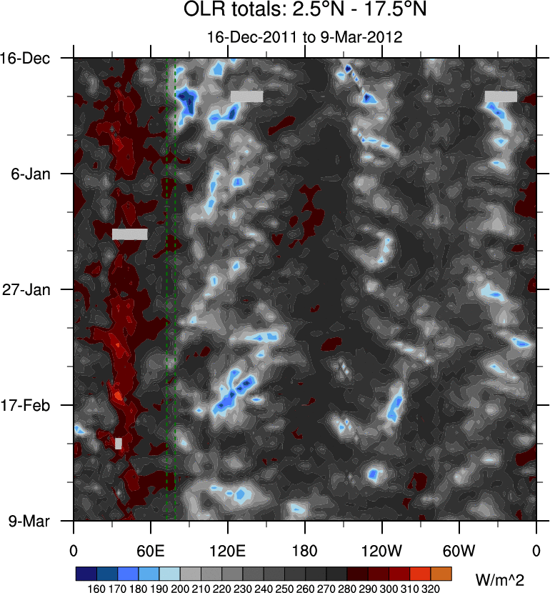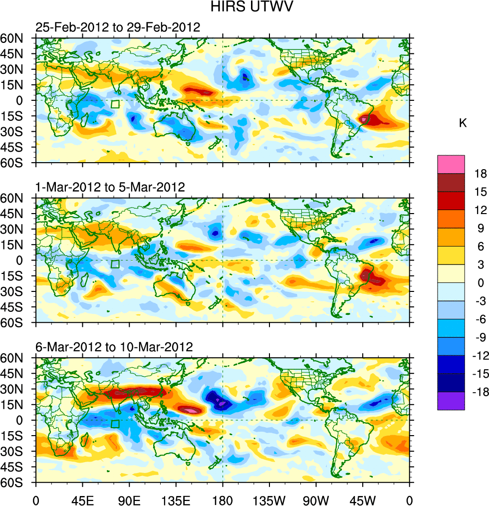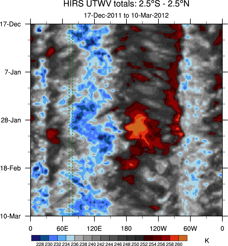 To identify tropical waves in near real-time, the OLR and UTWV data are filtered following Wheeler & Weickmann (2001 MWR). The daily anomalies are calculated using the first 3 harmonics of the seasonal cycle for 1979–2009. Missing values are then filled using linear interpolation in space and time. The most recent 365 days of anomalies are padded with 659 days of zeroes, and the result is filtered for each wave type.