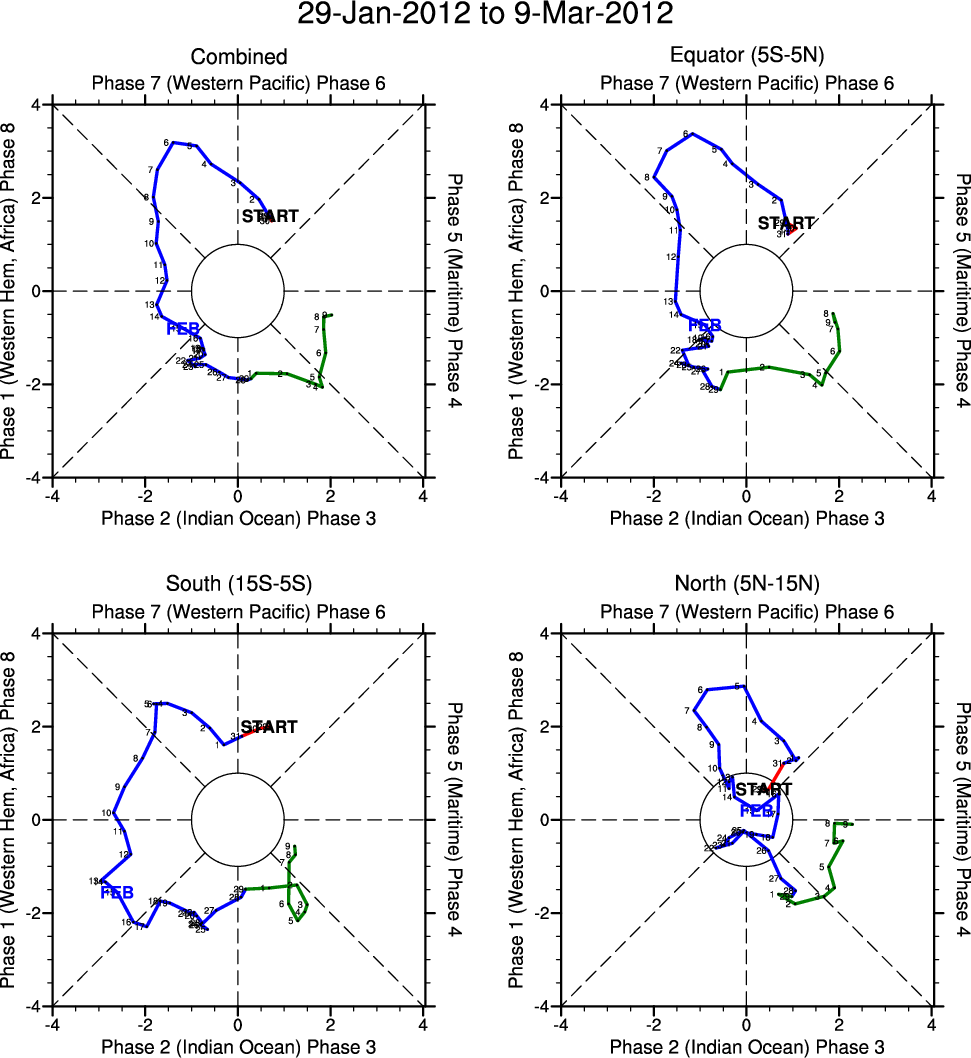 Wheeler and Hendon (2004) constructed the RMM index for monitoring the MJO. This index consists of the first two principal components (PCs) of OLR, 850-hPa zonal wind, and 200-hPa zonal wind averaged 15S-15N.