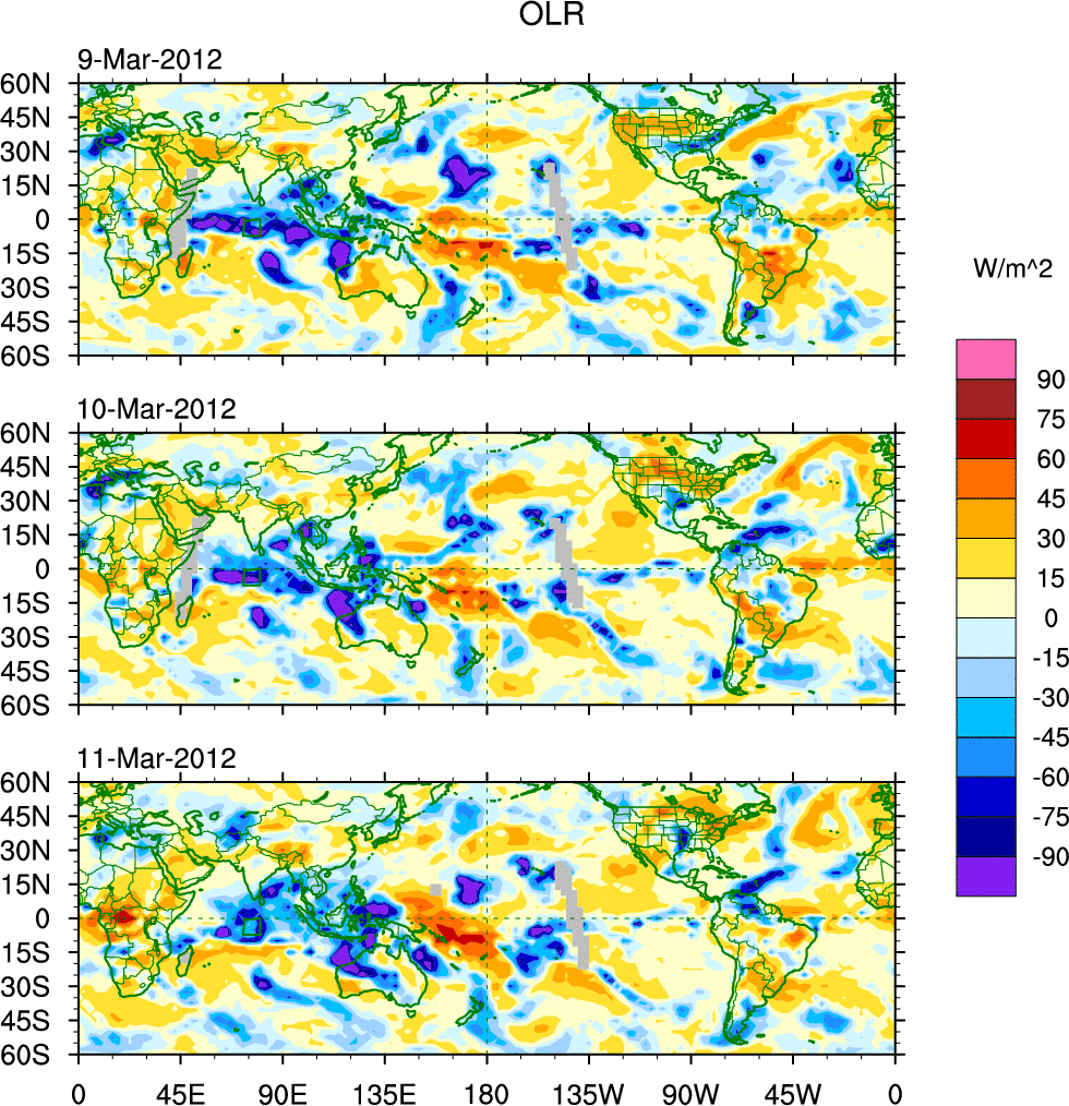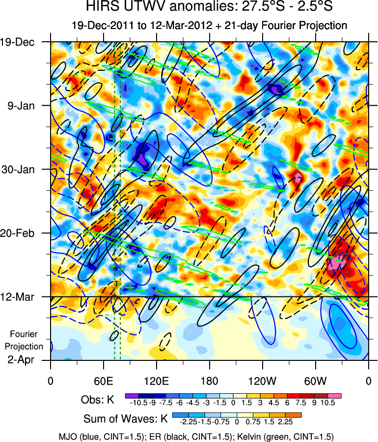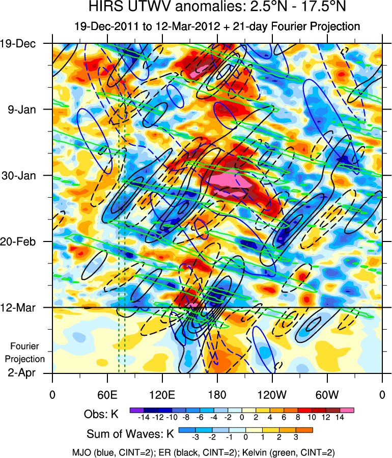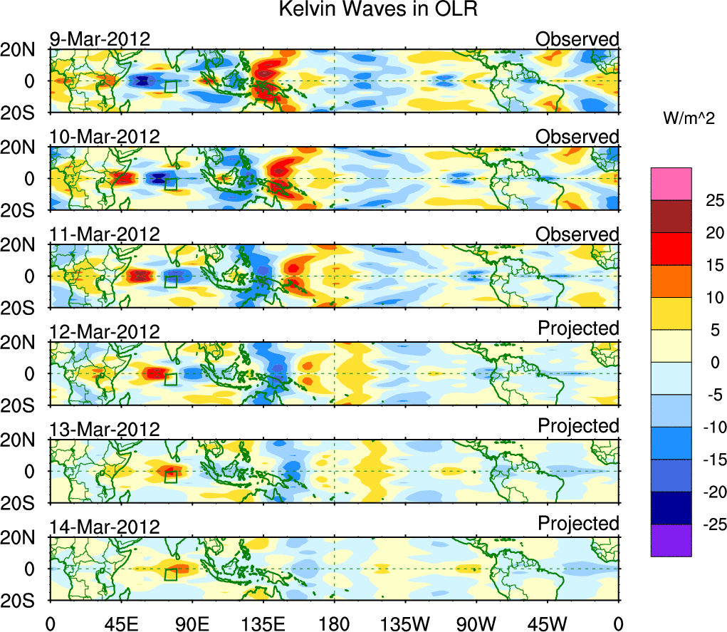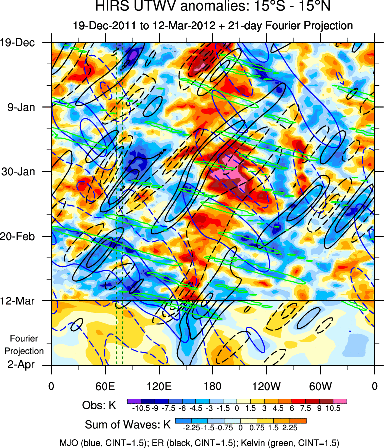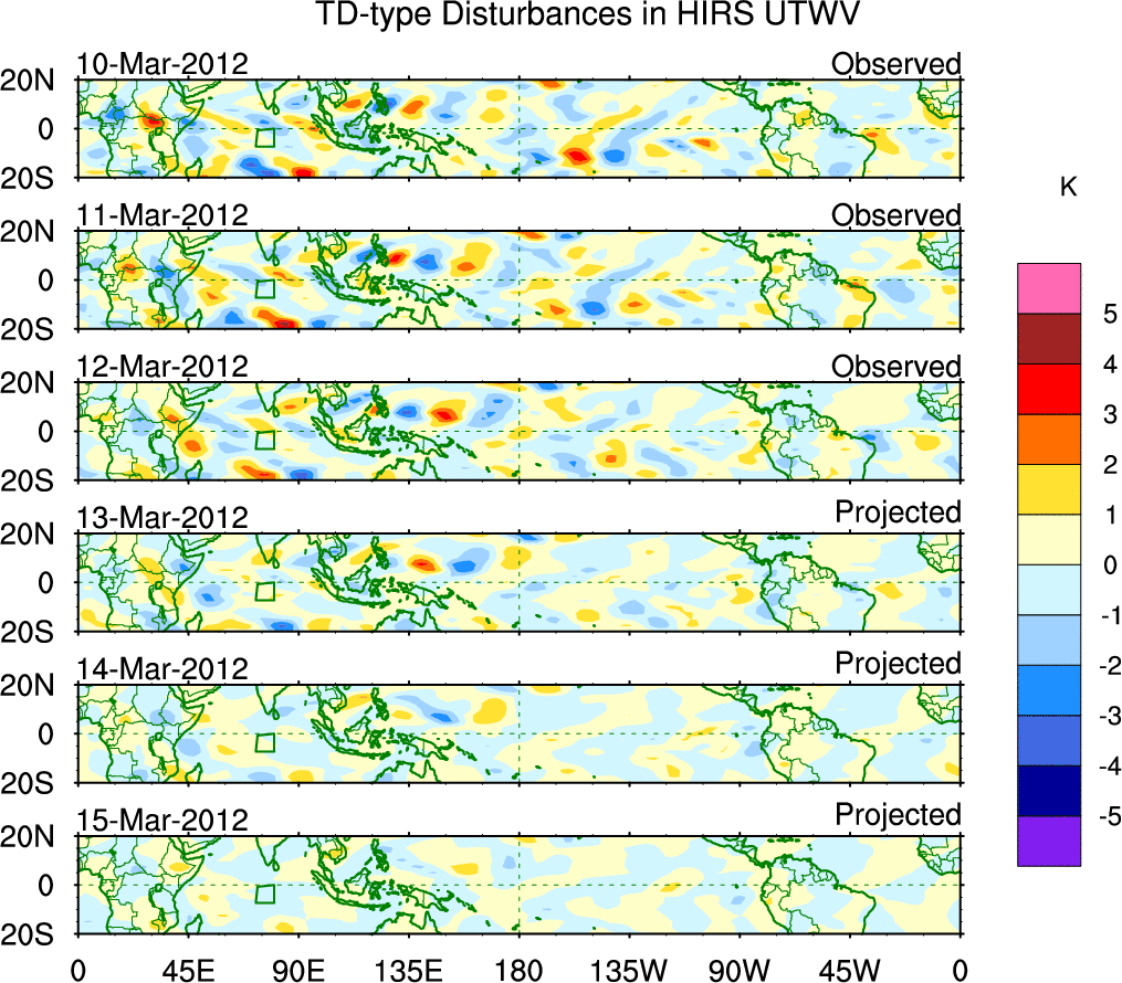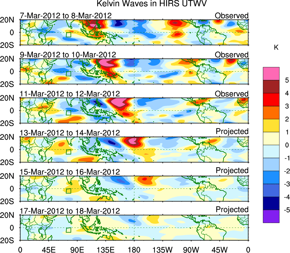 To identify tropical waves in near real-time, the OLR and UTWV data are filtered following Wheeler & Weickmann (2001 MWR). The daily anomalies are calculated using the first 3 harmonics of the seasonal cycle for 1979–2009. Missing values are then filled using linear interpolation in space and time. The most recent 365 days of anomalies are padded with 659 days of zeroes, and the result is filtered for each wave type.