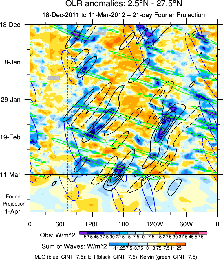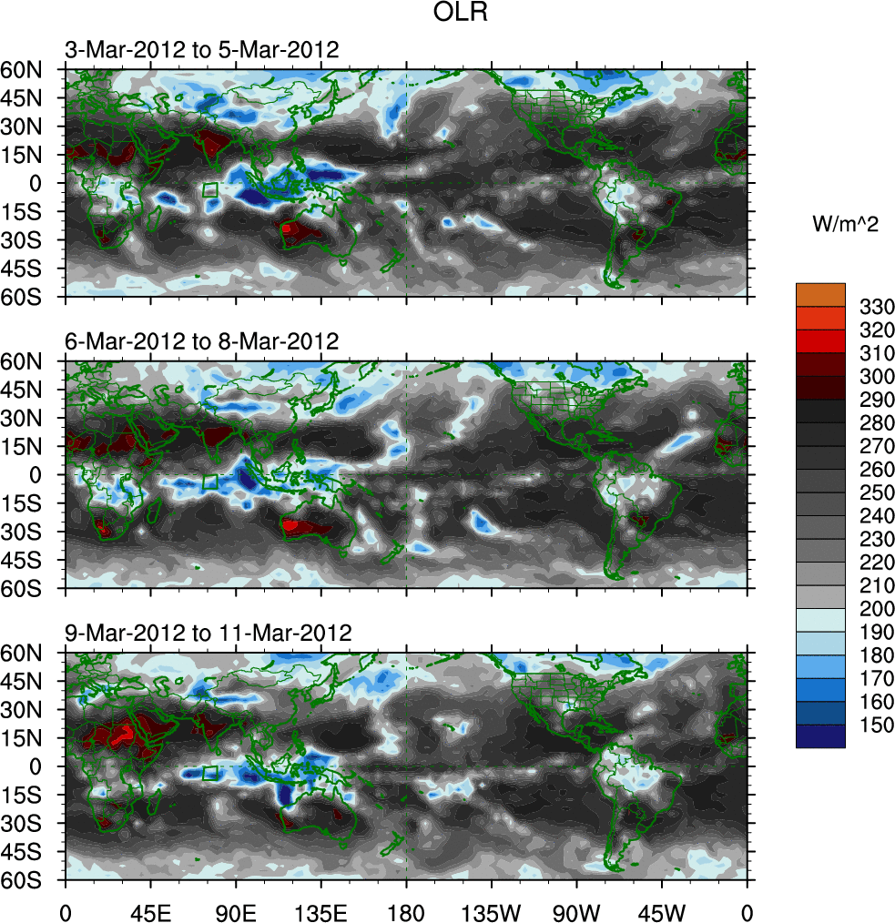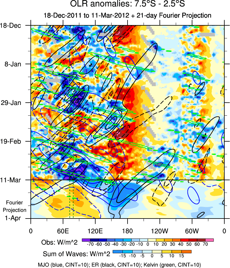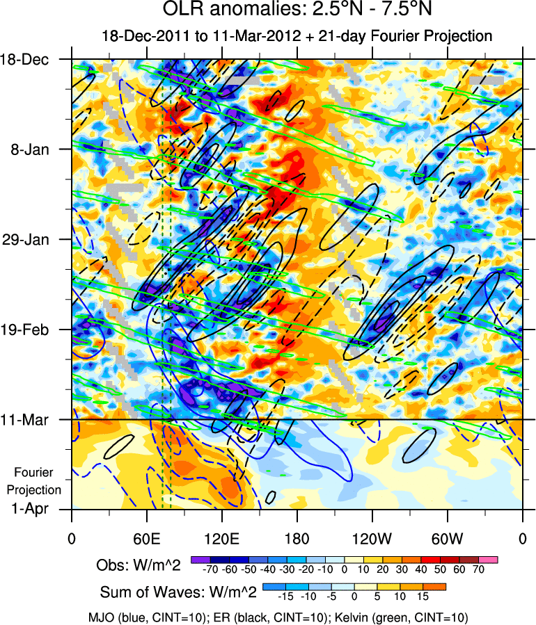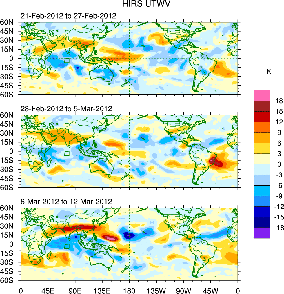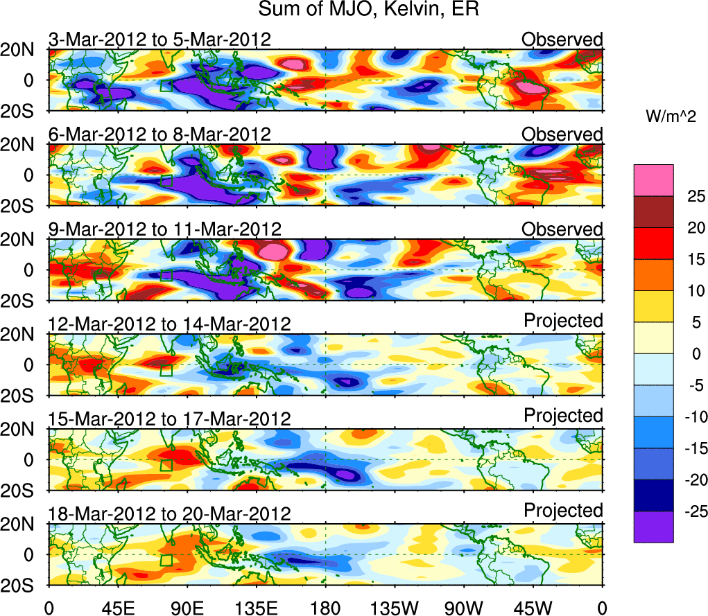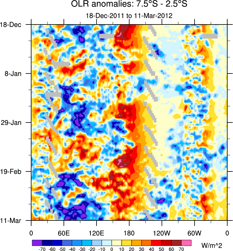 To identify tropical waves in near real-time, the OLR and UTWV data are filtered following Wheeler & Weickmann (2001 MWR). The daily anomalies are calculated using the first 3 harmonics of the seasonal cycle for 1979–2009. Missing values are then filled using linear interpolation in space and time. The most recent 365 days of anomalies are padded with 659 days of zeroes, and the result is filtered for each wave type.