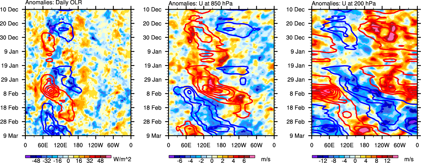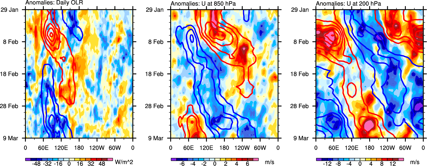 The Hovmollers show longitude-time plots for OLR, U-850, and U-200. The shading indicates the observed anomalies, while the contours are the projection of those anomalies onto the RMM EOFs.