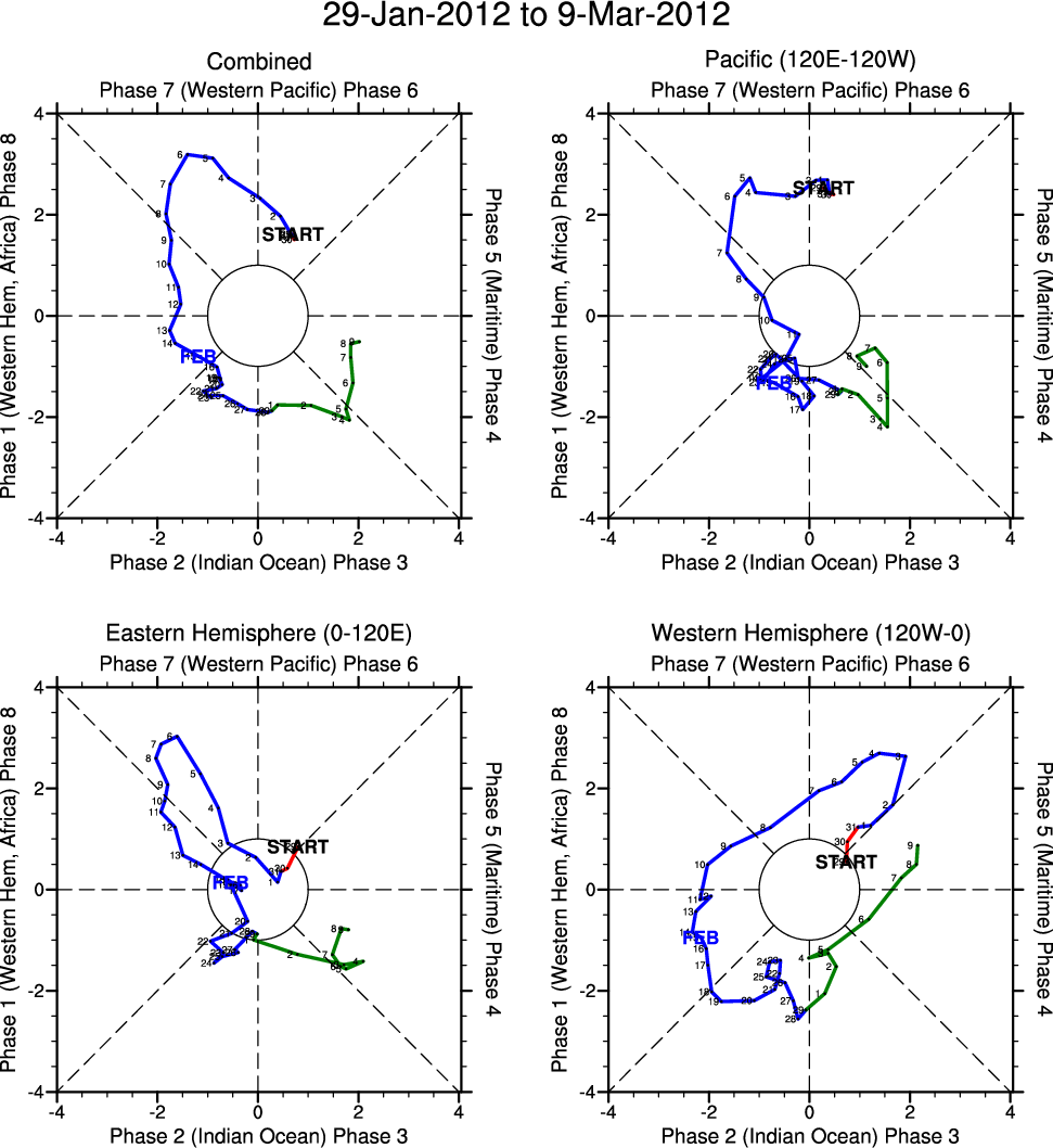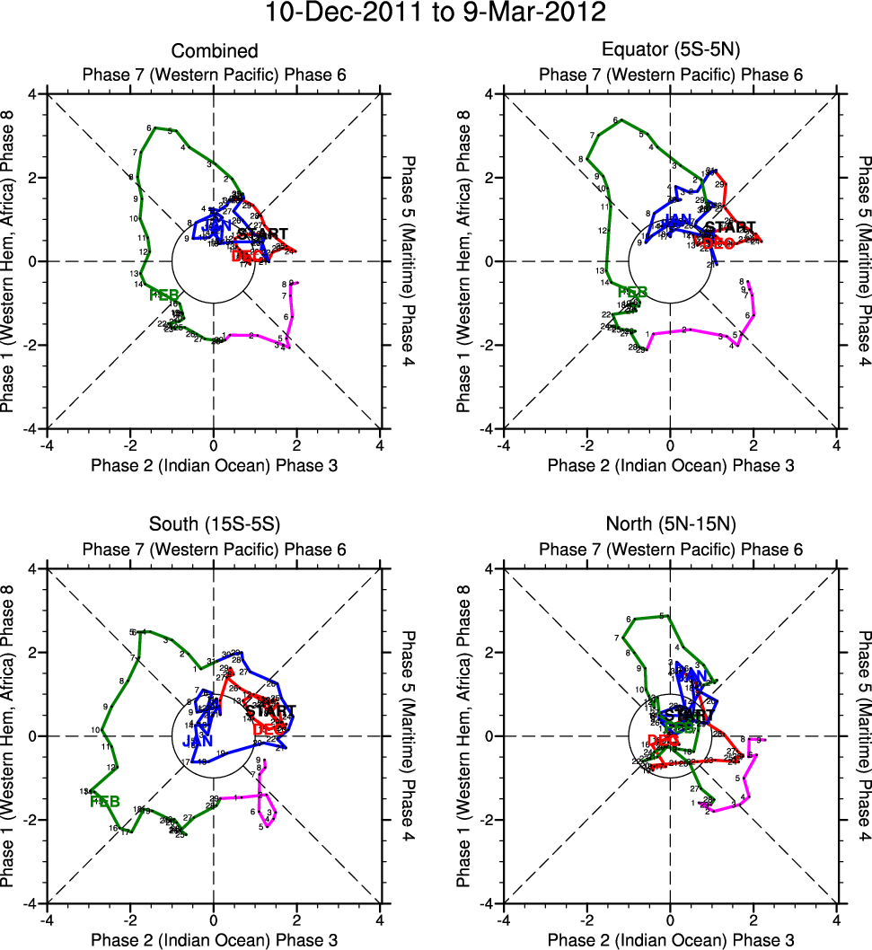 Wheeler and Hendon (2004) constructed the RMM index for monitoring the MJO. This index consists of the first two principal components (PCs) of OLR, 850-hPa zonal wind, and 200-hPa zonal wind averaged 15S-15N.