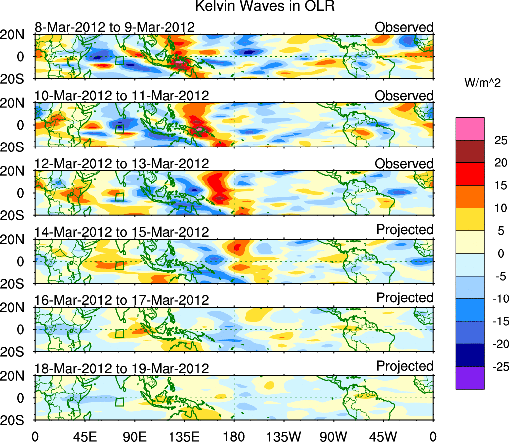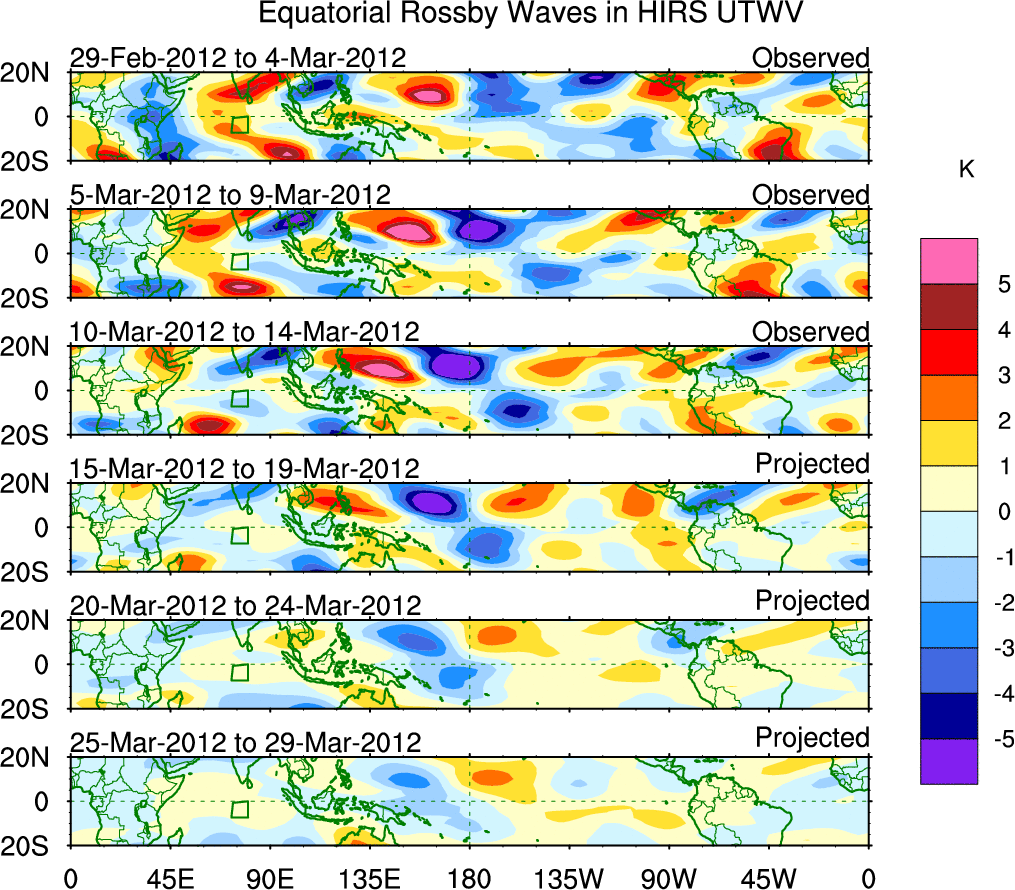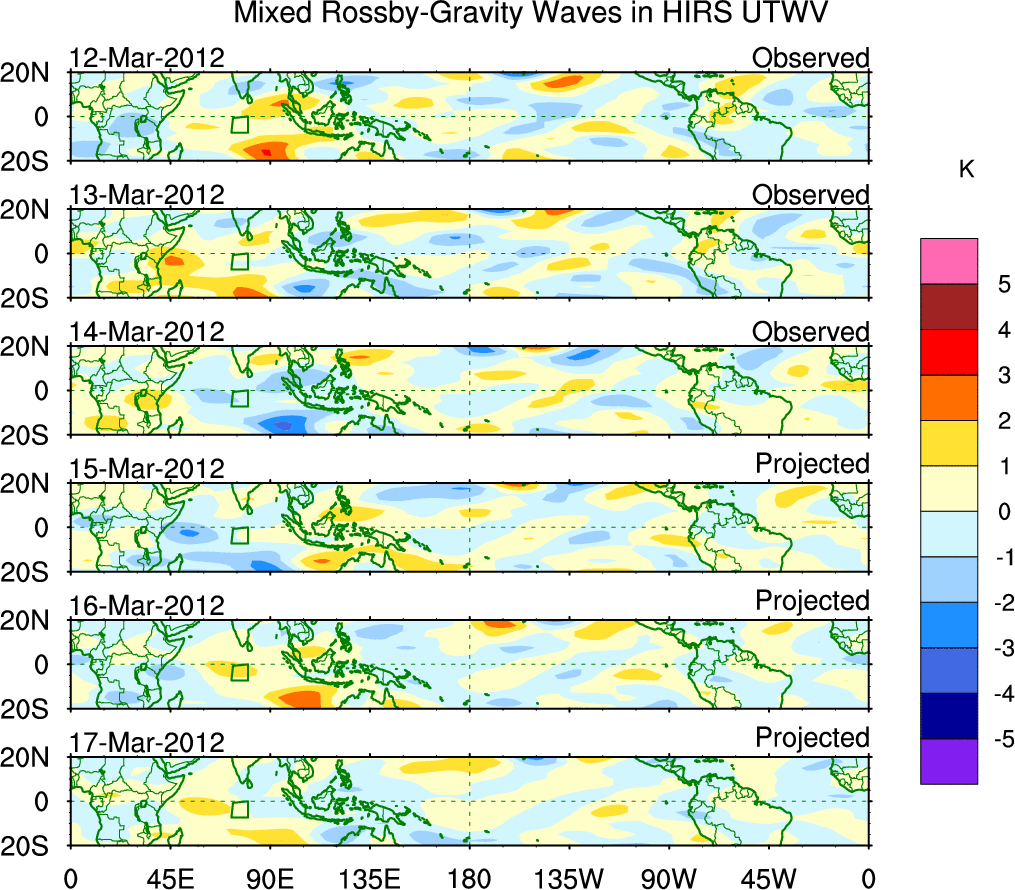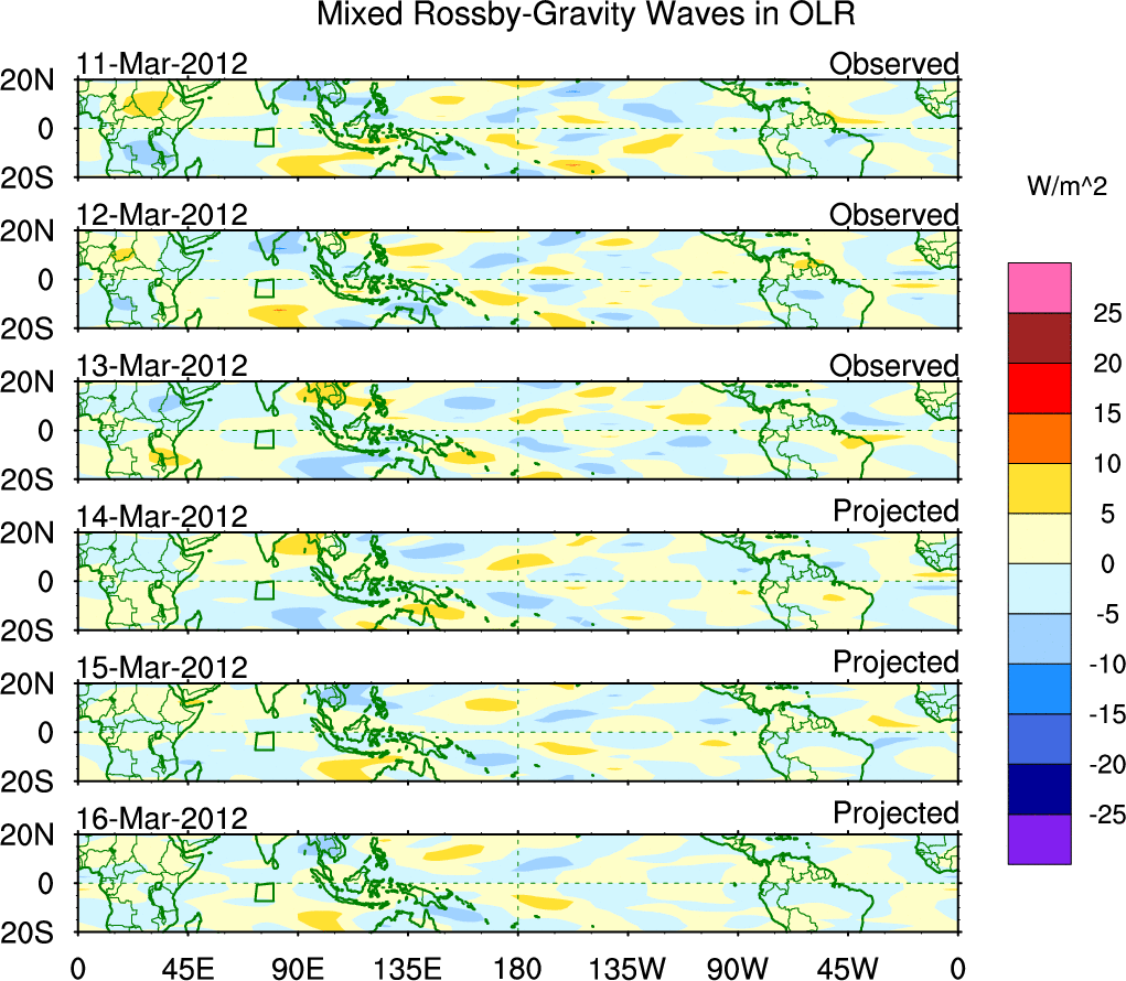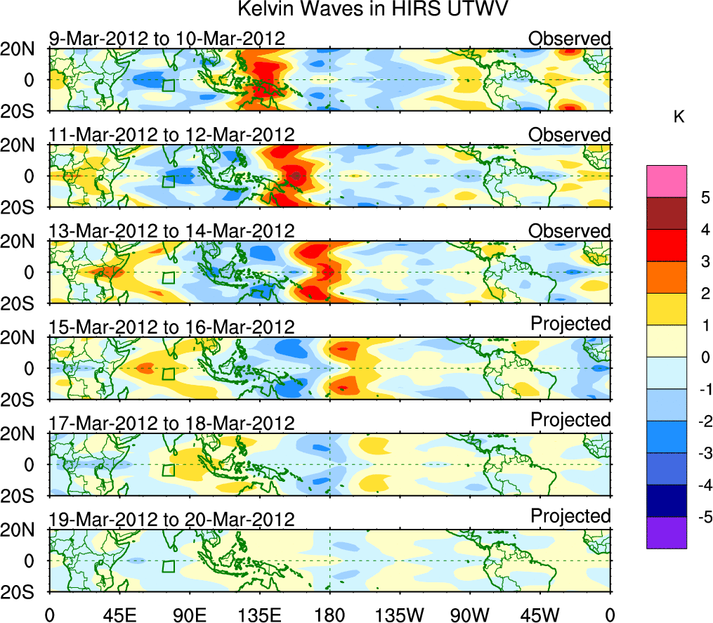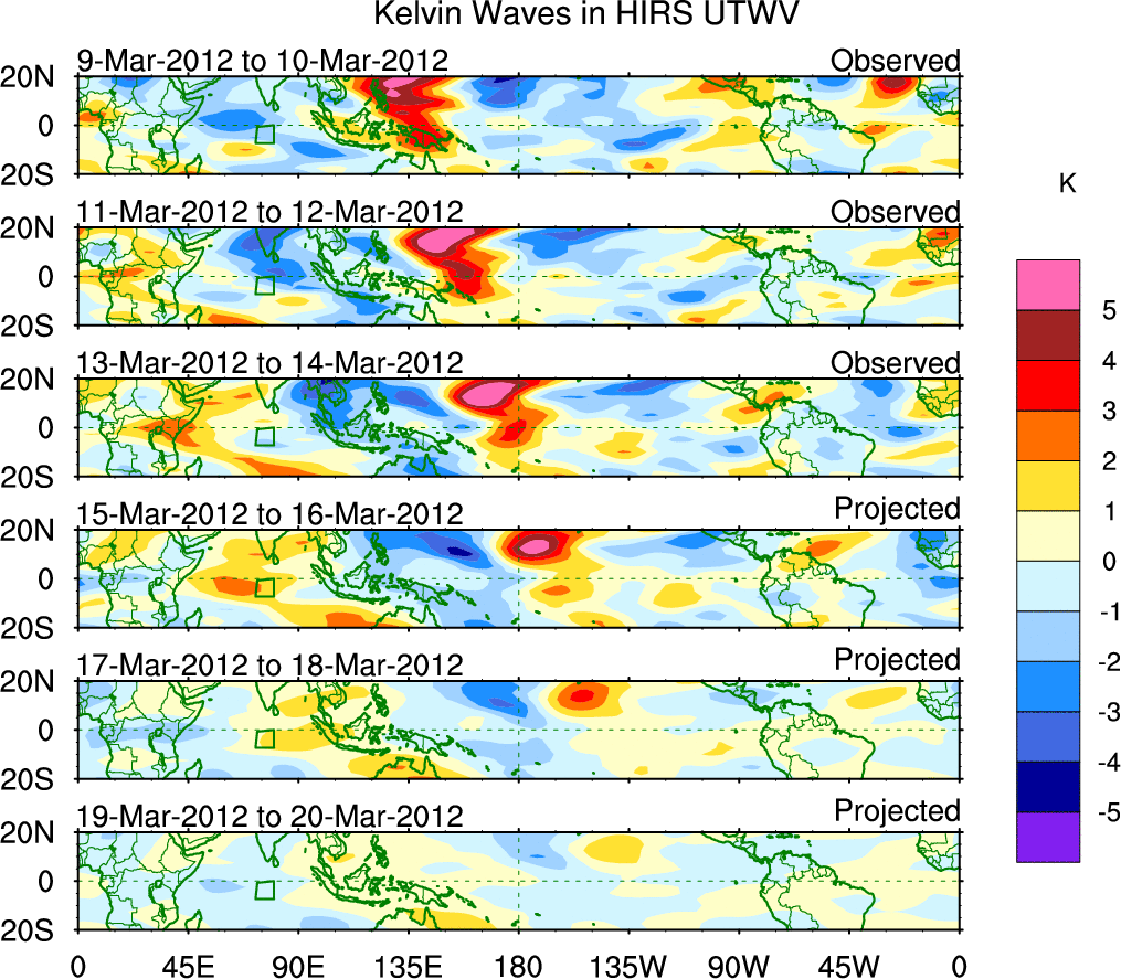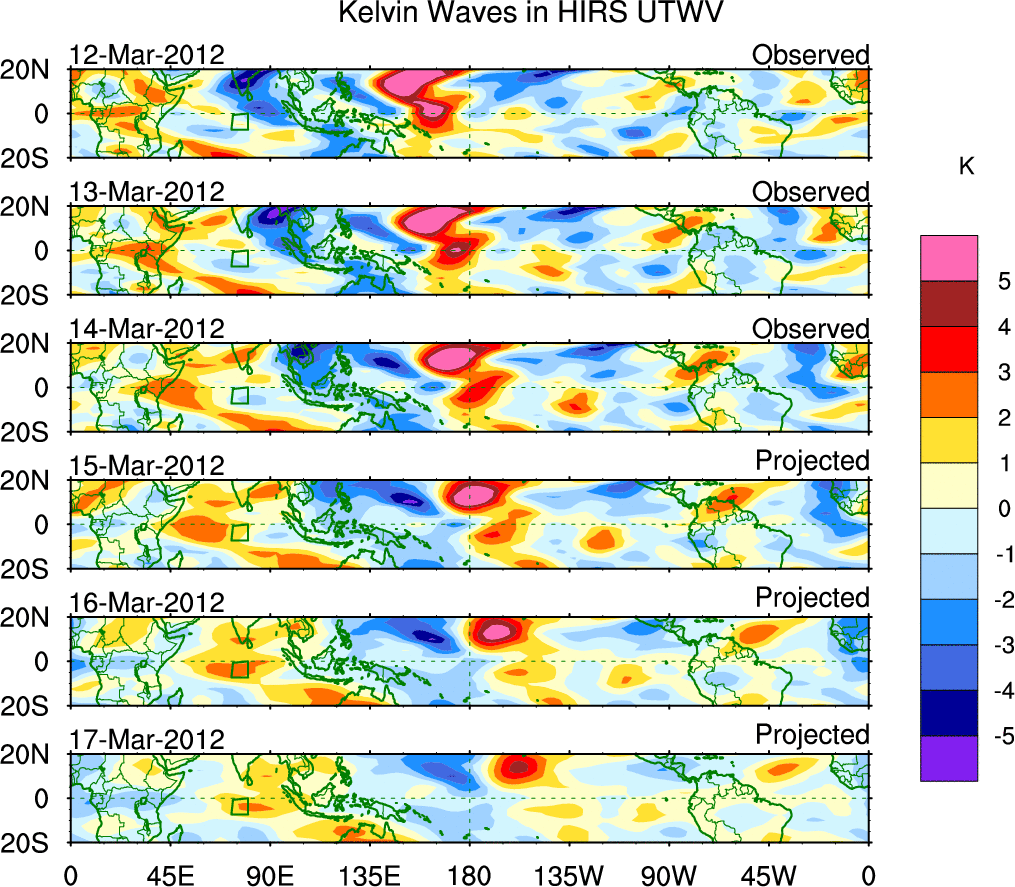 To identify tropical waves in near real-time, the OLR and UTWV data are filtered following Wheeler & Weickmann (2001 MWR). The daily anomalies are calculated using the first 3 harmonics of the seasonal cycle for 1979–2009. Missing values are then filled using linear interpolation in space and time. The most recent 365 days of anomalies are padded with 659 days of zeroes, and the result is filtered for each wave type.
