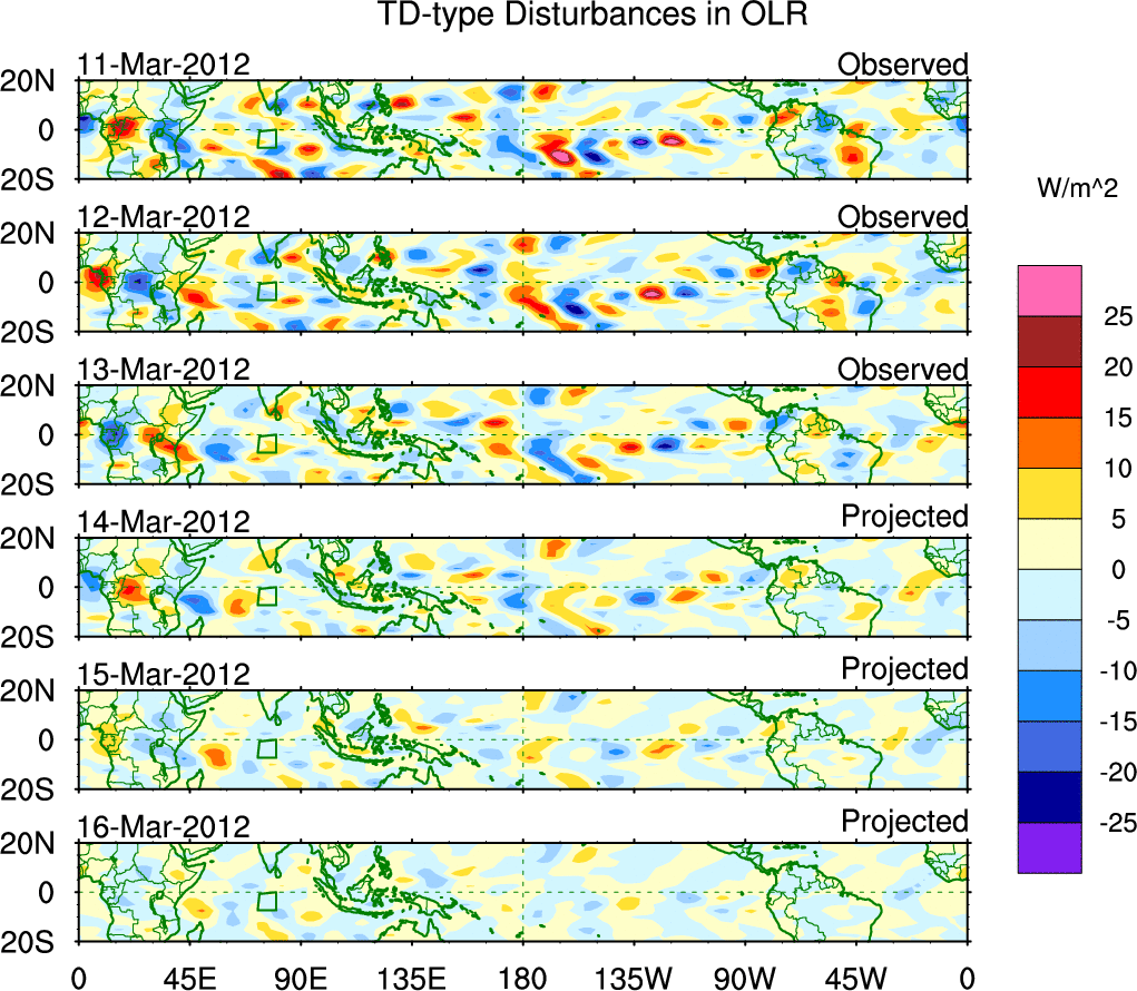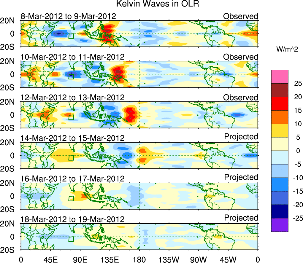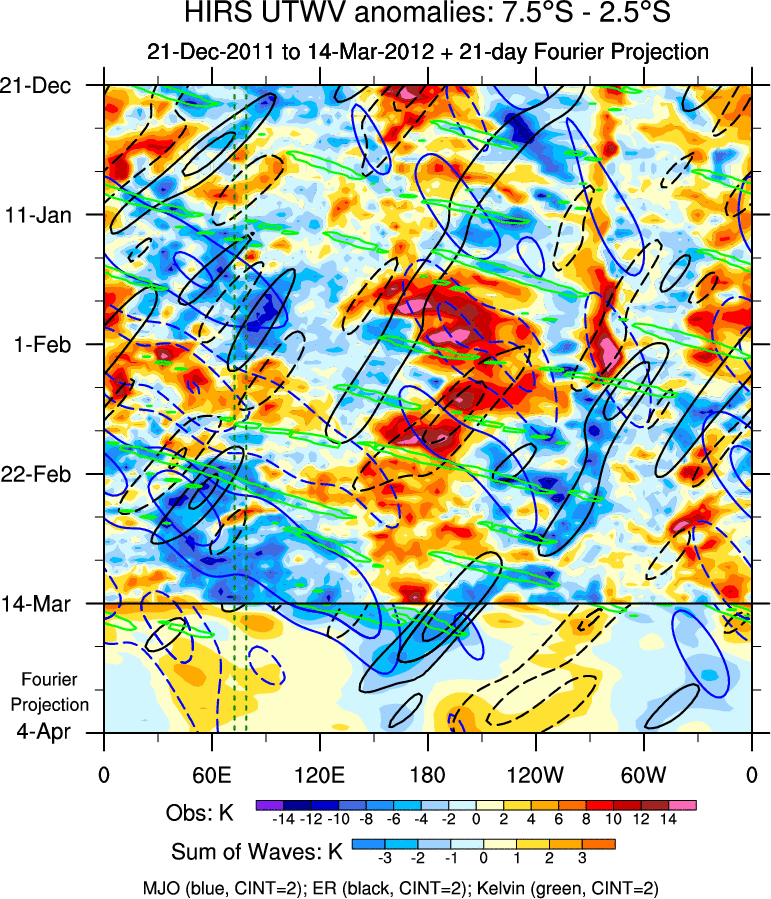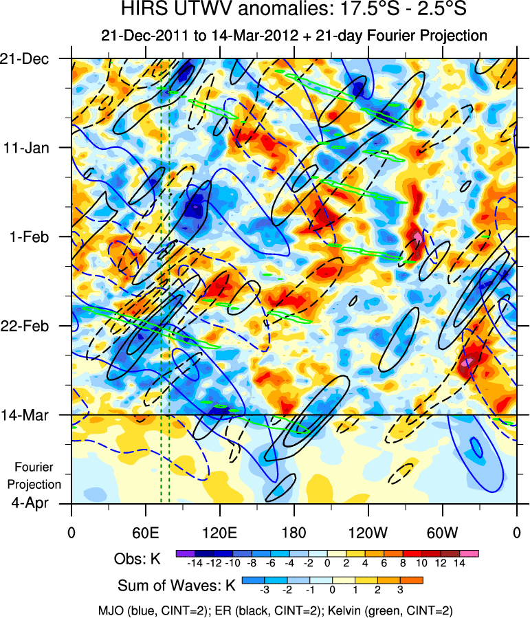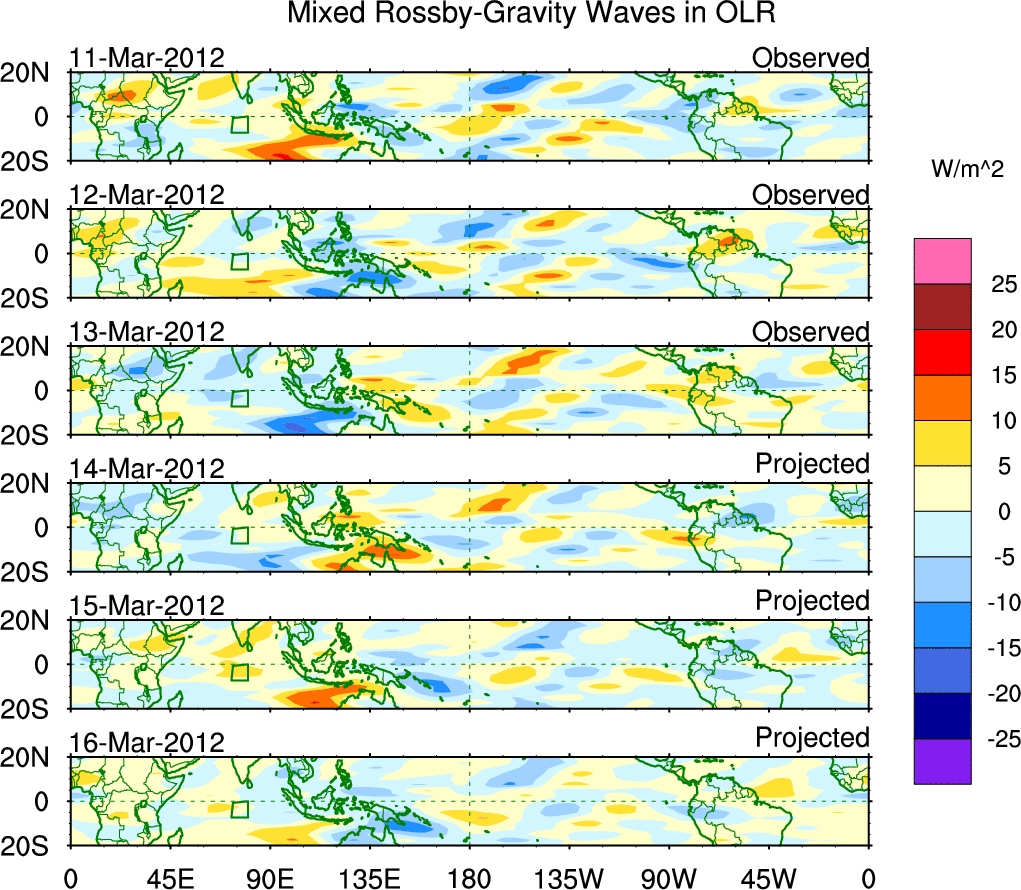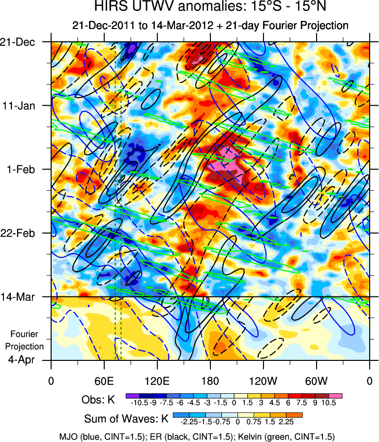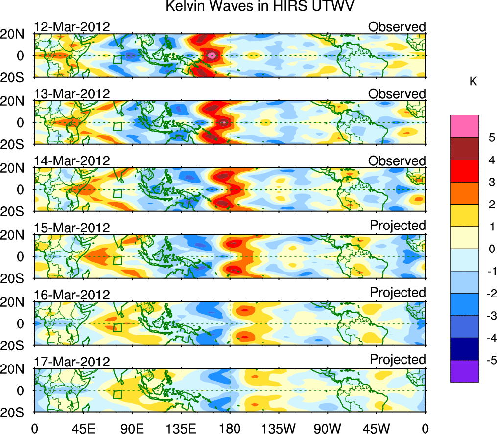 To identify tropical waves in near real-time, the OLR and UTWV data are filtered following Wheeler & Weickmann (2001 MWR). The daily anomalies are calculated using the first 3 harmonics of the seasonal cycle for 1979–2009. Missing values are then filled using linear interpolation in space and time. The most recent 365 days of anomalies are padded with 659 days of zeroes, and the result is filtered for each wave type.
