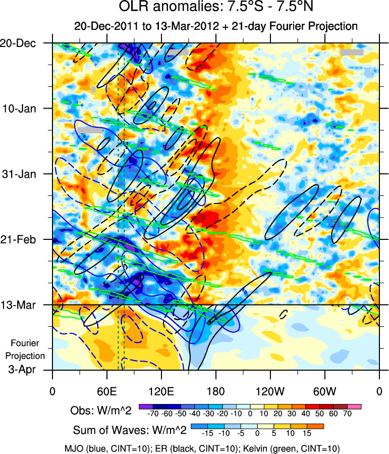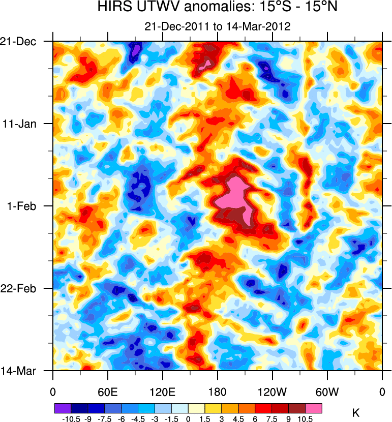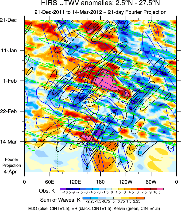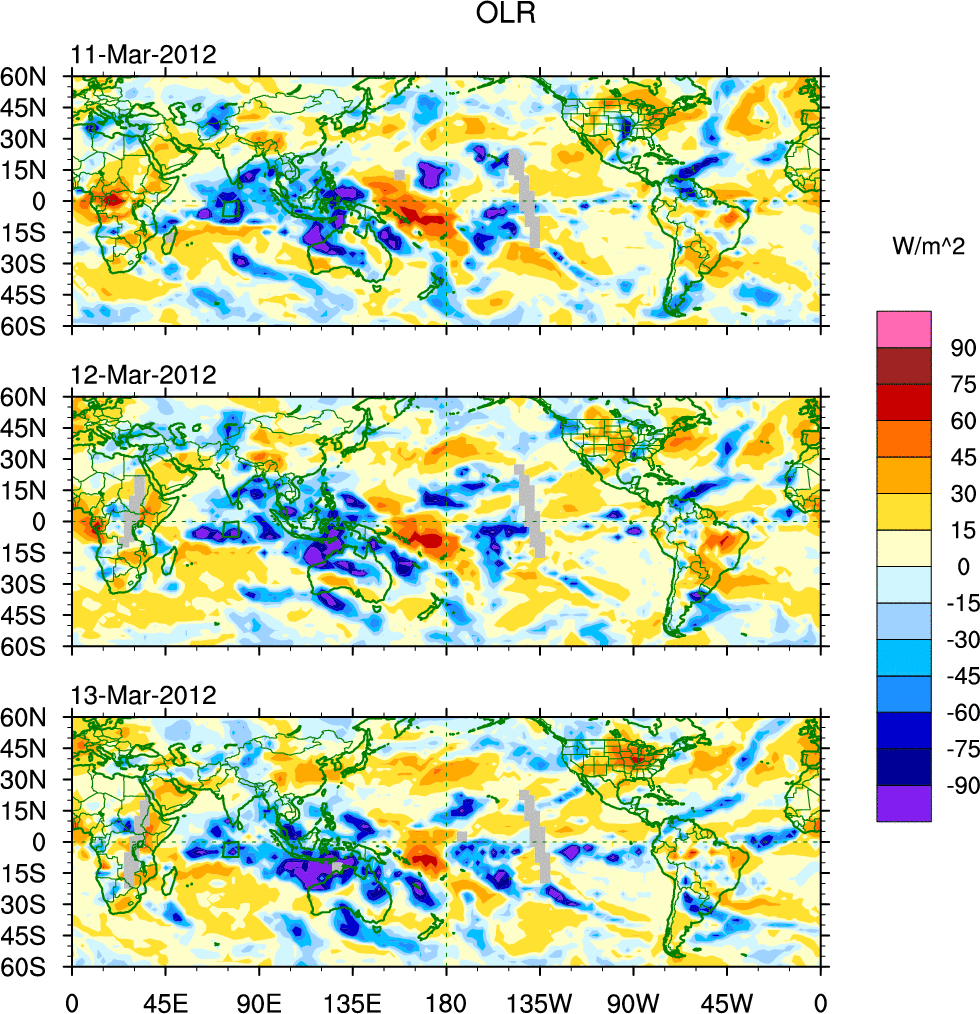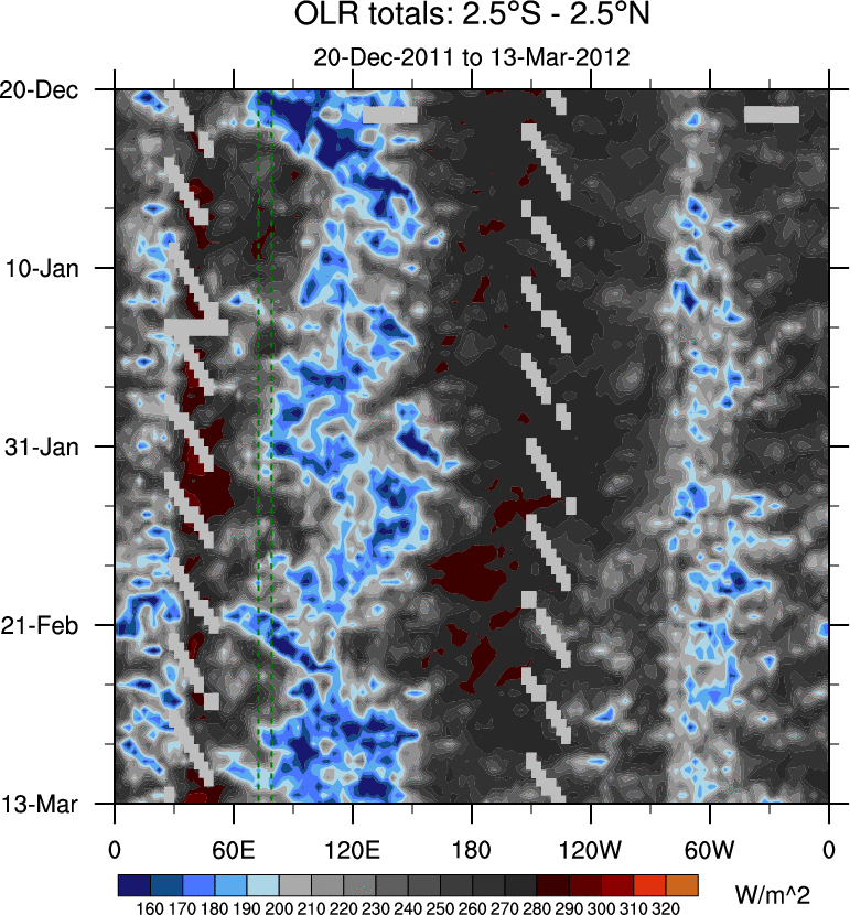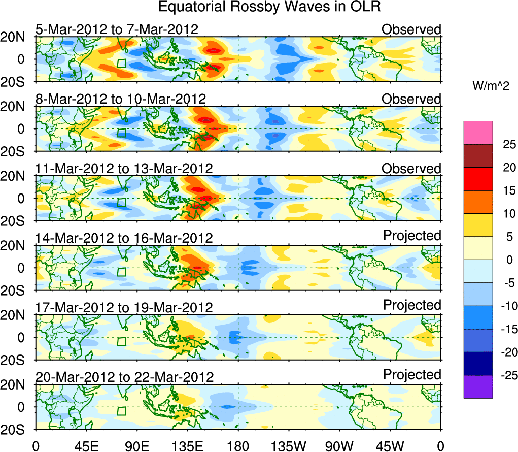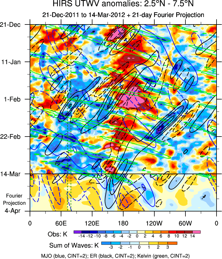 To identify tropical waves in near real-time, the OLR and UTWV data are filtered following Wheeler & Weickmann (2001 MWR). The daily anomalies are calculated using the first 3 harmonics of the seasonal cycle for 1979–2009. Missing values are then filled using linear interpolation in space and time. The most recent 365 days of anomalies are padded with 659 days of zeroes, and the result is filtered for each wave type.