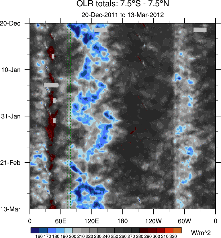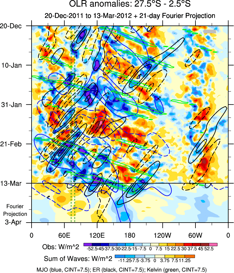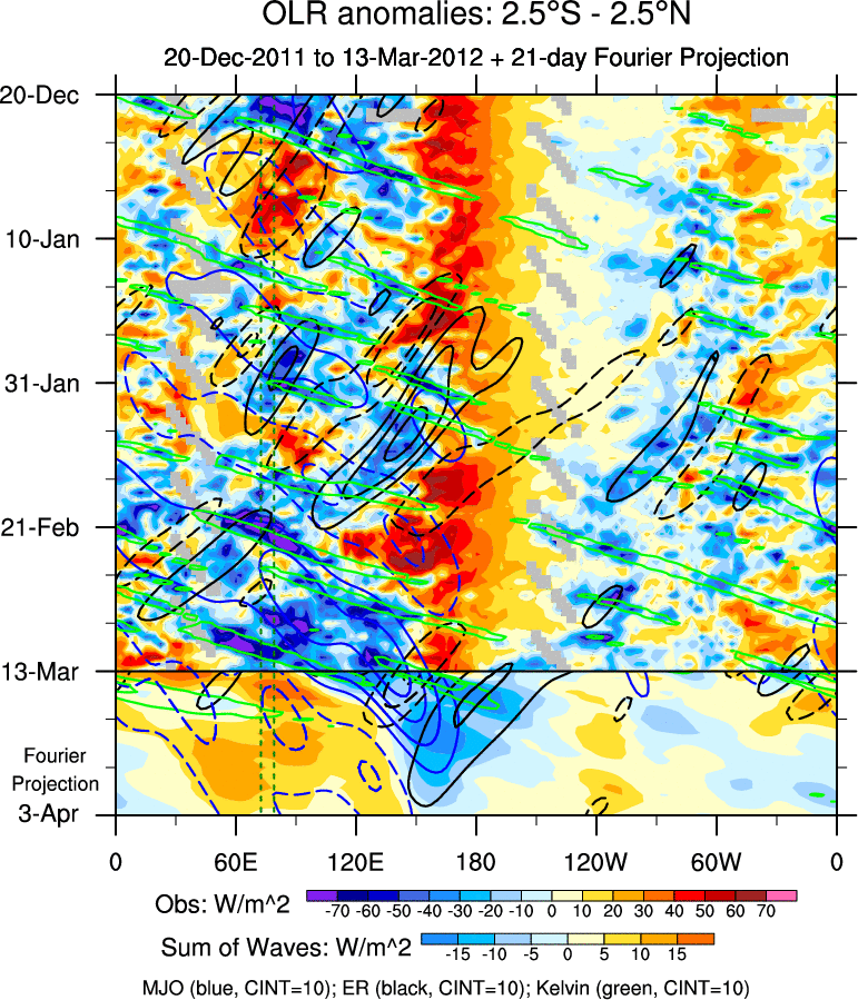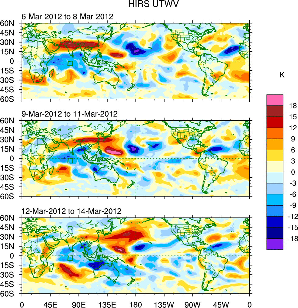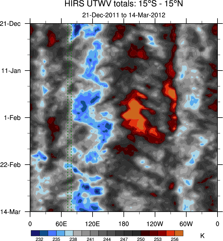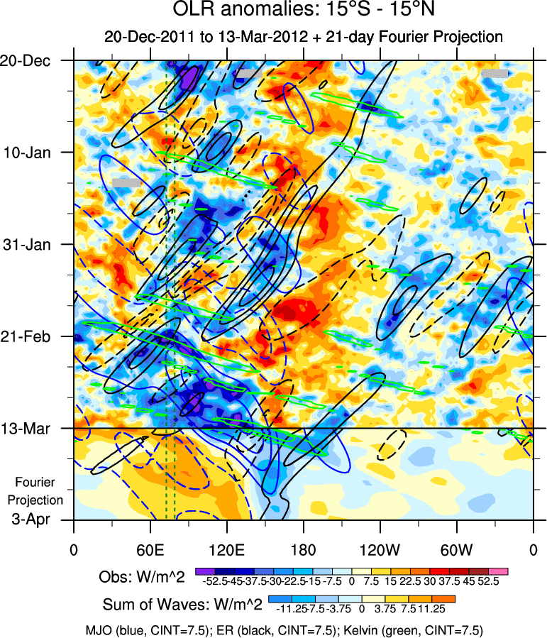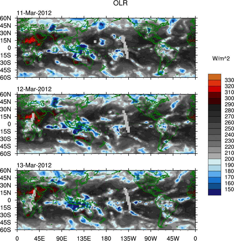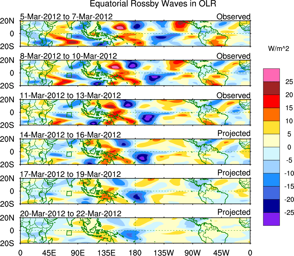 To identify tropical waves in near real-time, the OLR and UTWV data are filtered following Wheeler & Weickmann (2001 MWR). The daily anomalies are calculated using the first 3 harmonics of the seasonal cycle for 1979–2009. Missing values are then filled using linear interpolation in space and time. The most recent 365 days of anomalies are padded with 659 days of zeroes, and the result is filtered for each wave type.