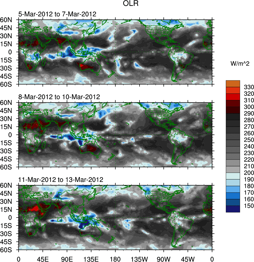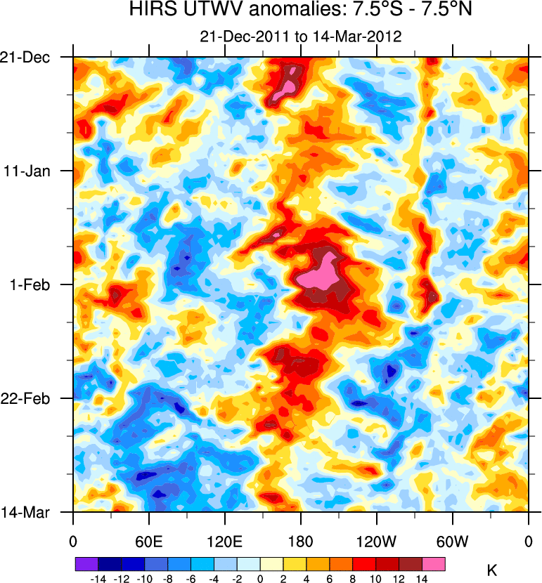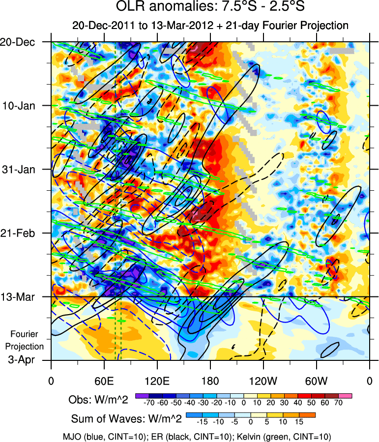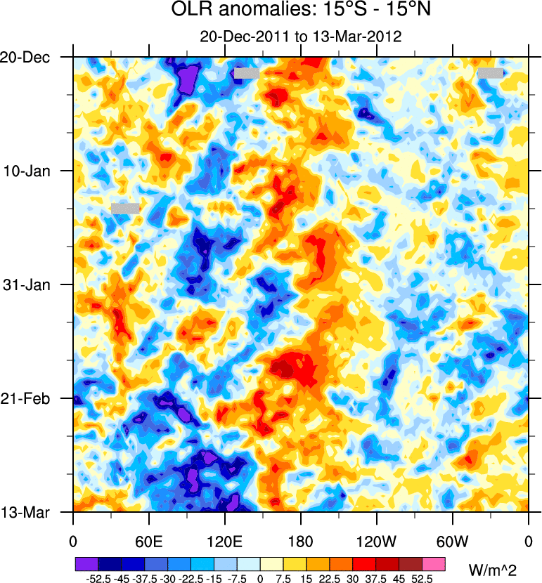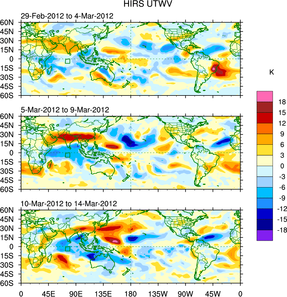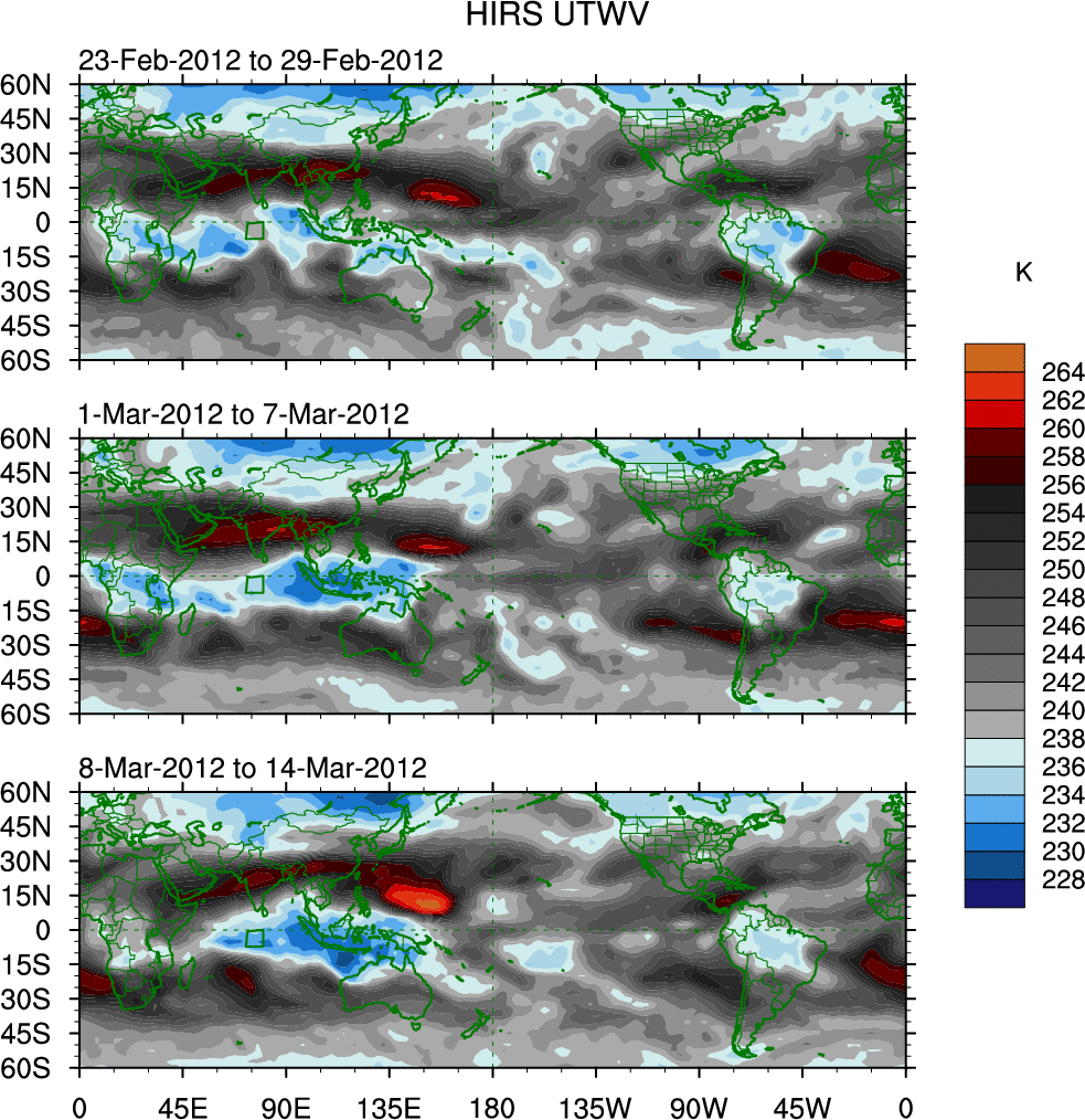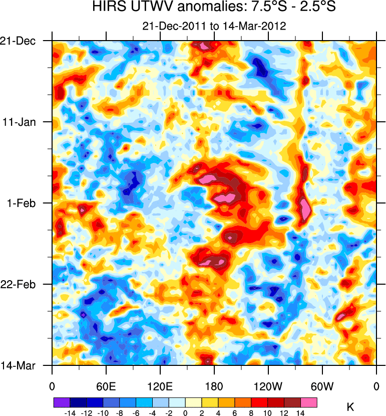To identify tropical waves in near real-time, the OLR and UTWV data are filtered following Wheeler & Weickmann (2001 MWR). The daily anomalies are calculated using the first 3 harmonics of the seasonal cycle for 1979–2009. Missing values are then filled using linear interpolation in space and time. The most recent 365 days of anomalies are padded with 659 days of zeroes, and the result is filtered for each wave type.