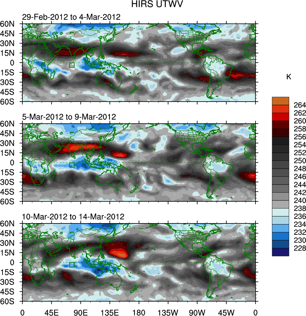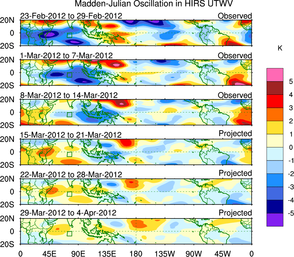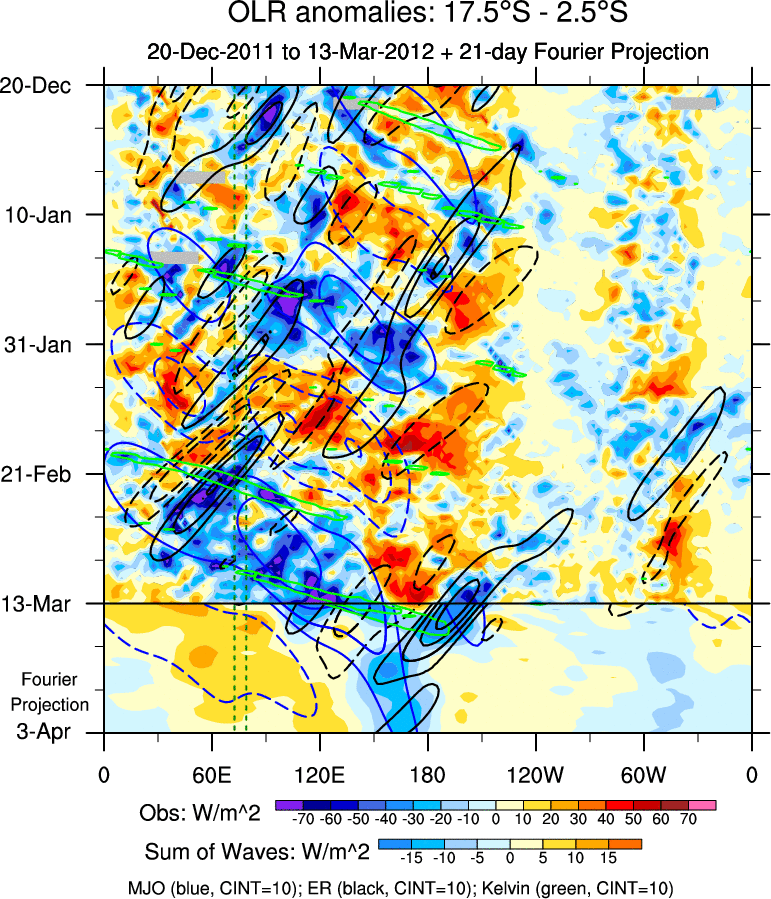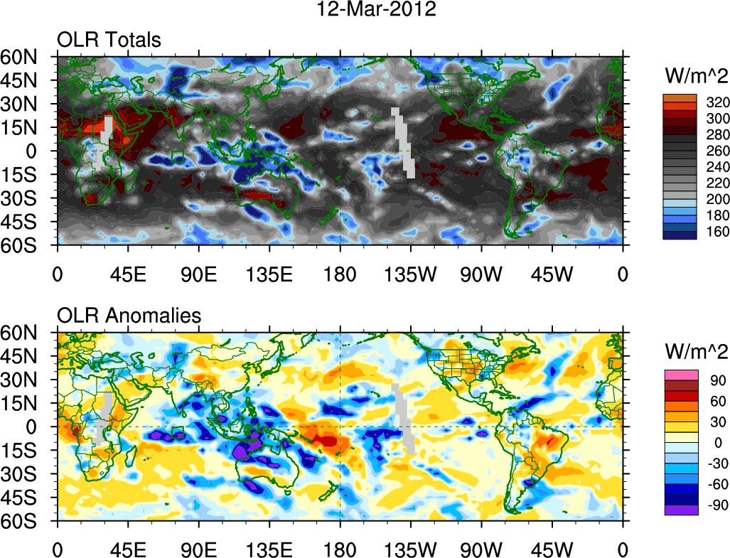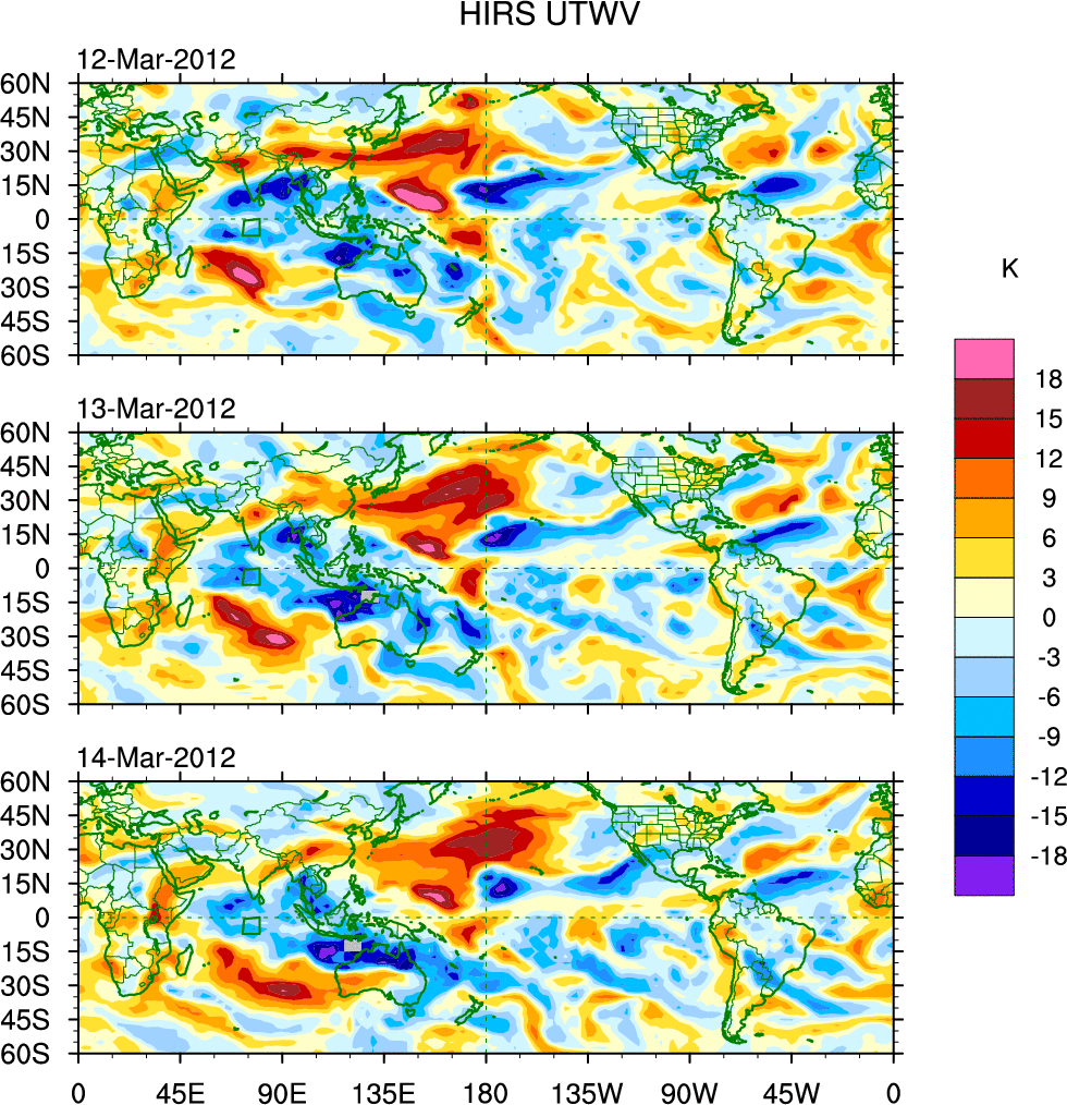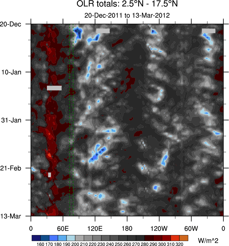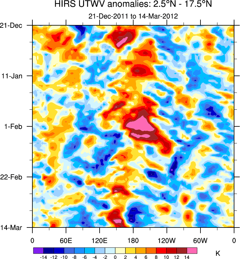 To identify tropical waves in near real-time, the OLR and UTWV data are filtered following Wheeler & Weickmann (2001 MWR). The daily anomalies are calculated using the first 3 harmonics of the seasonal cycle for 1979–2009. Missing values are then filled using linear interpolation in space and time. The most recent 365 days of anomalies are padded with 659 days of zeroes, and the result is filtered for each wave type.