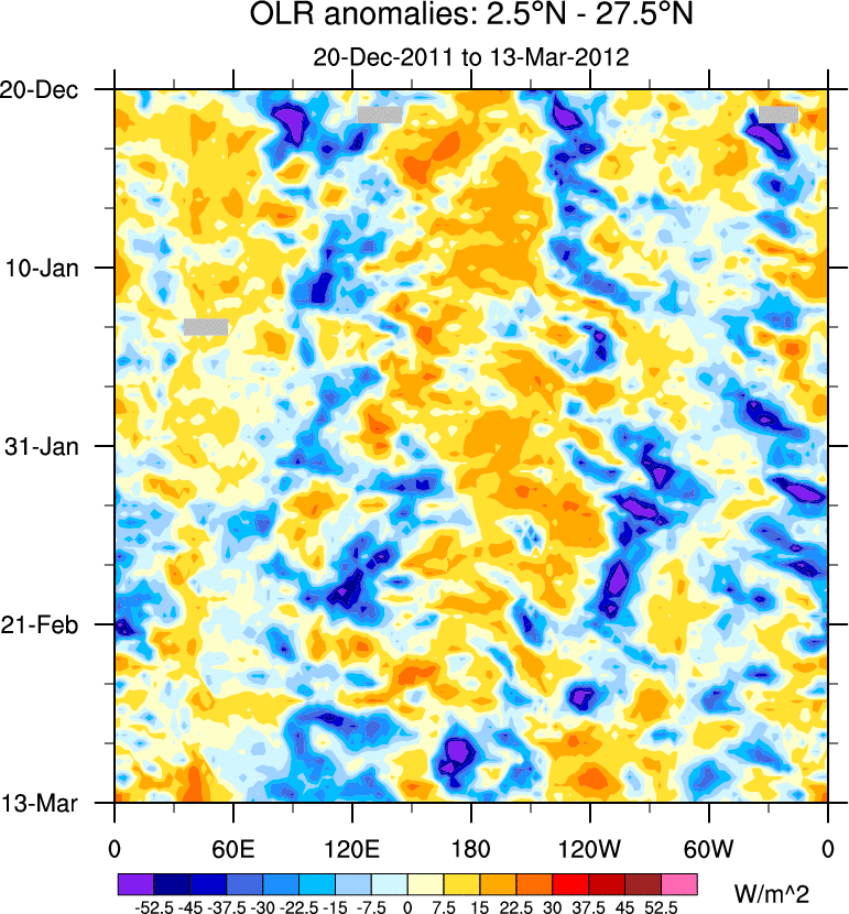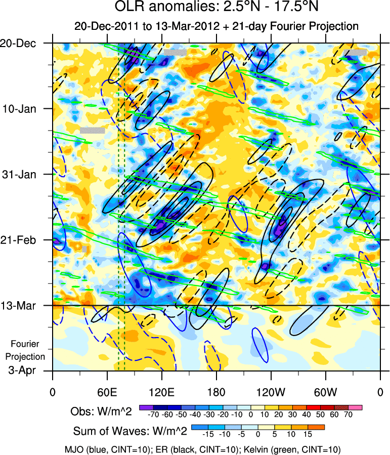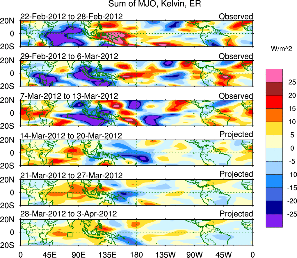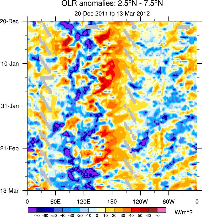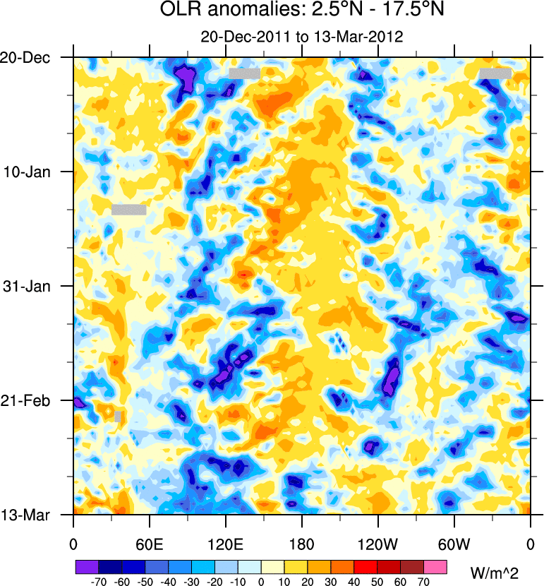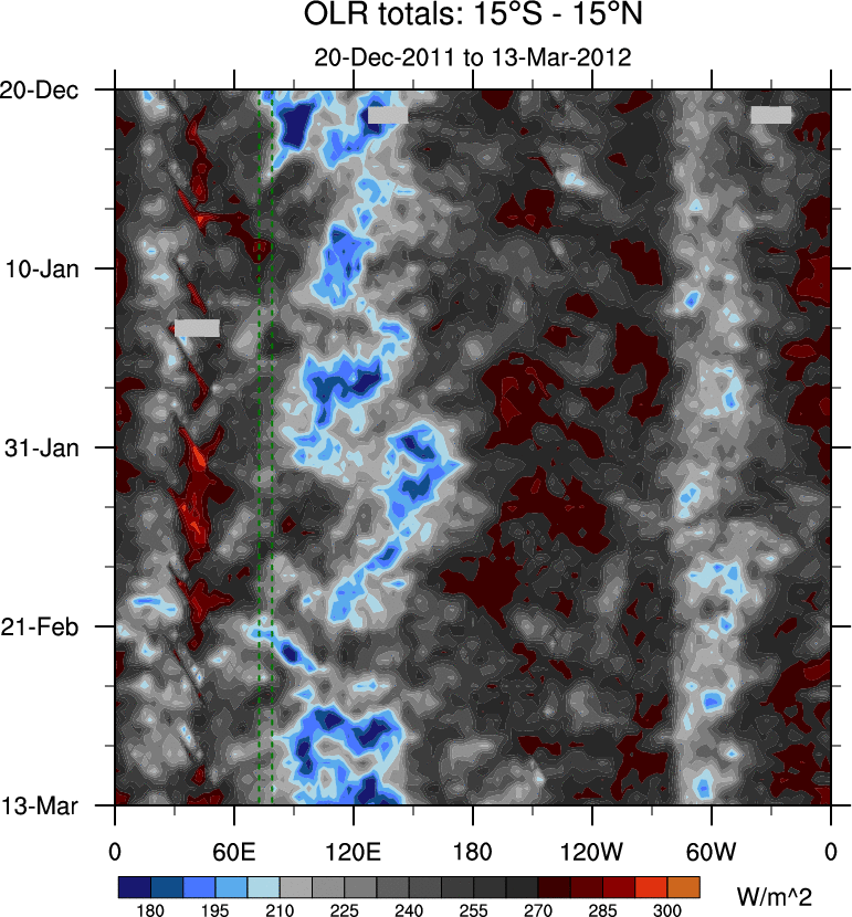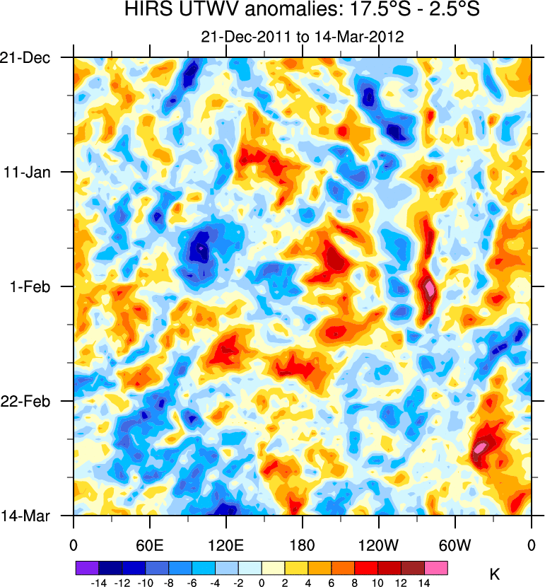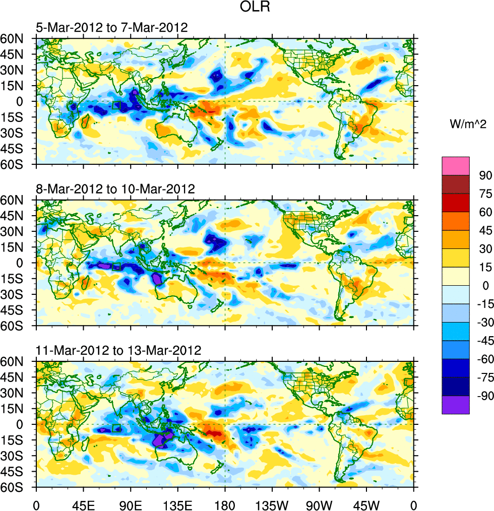 To identify tropical waves in near real-time, the OLR and UTWV data are filtered following Wheeler & Weickmann (2001 MWR). The daily anomalies are calculated using the first 3 harmonics of the seasonal cycle for 1979–2009. Missing values are then filled using linear interpolation in space and time. The most recent 365 days of anomalies are padded with 659 days of zeroes, and the result is filtered for each wave type.