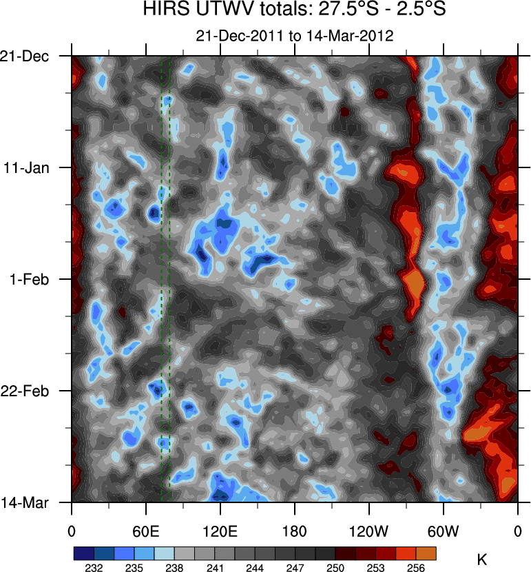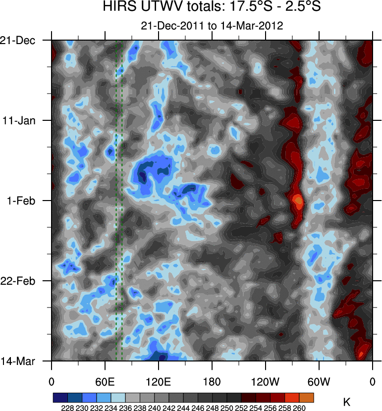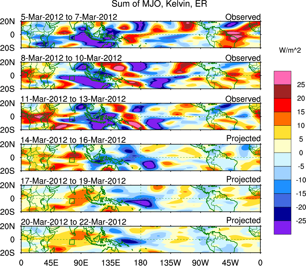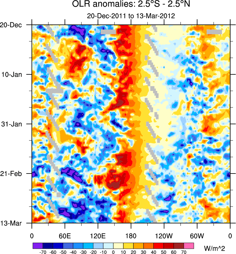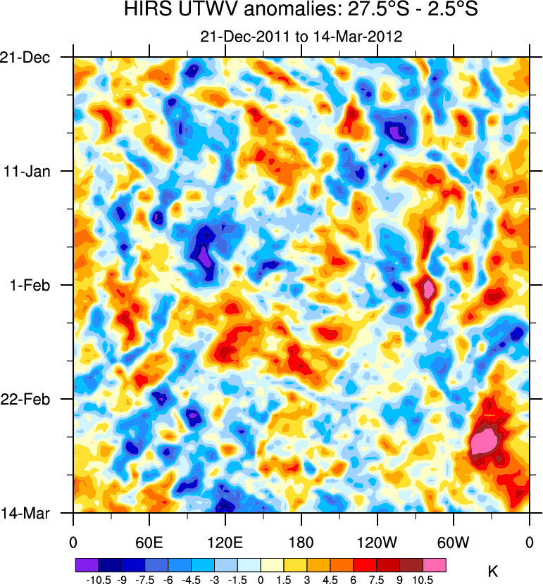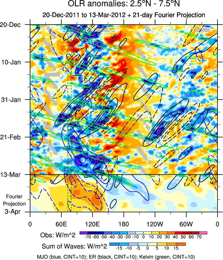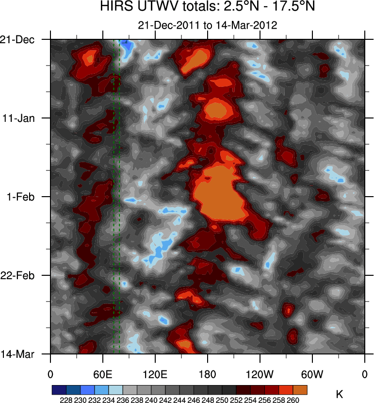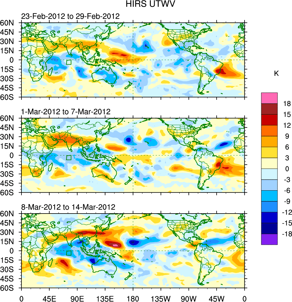 To identify tropical waves in near real-time, the OLR and UTWV data are filtered following Wheeler & Weickmann (2001 MWR). The daily anomalies are calculated using the first 3 harmonics of the seasonal cycle for 1979–2009. Missing values are then filled using linear interpolation in space and time. The most recent 365 days of anomalies are padded with 659 days of zeroes, and the result is filtered for each wave type.