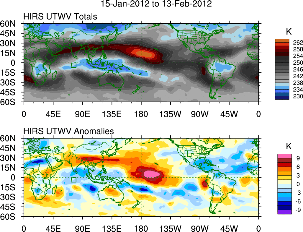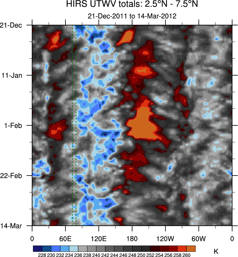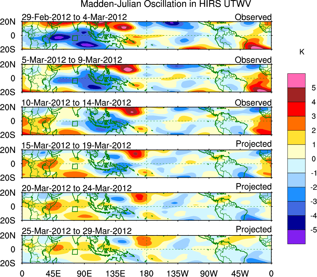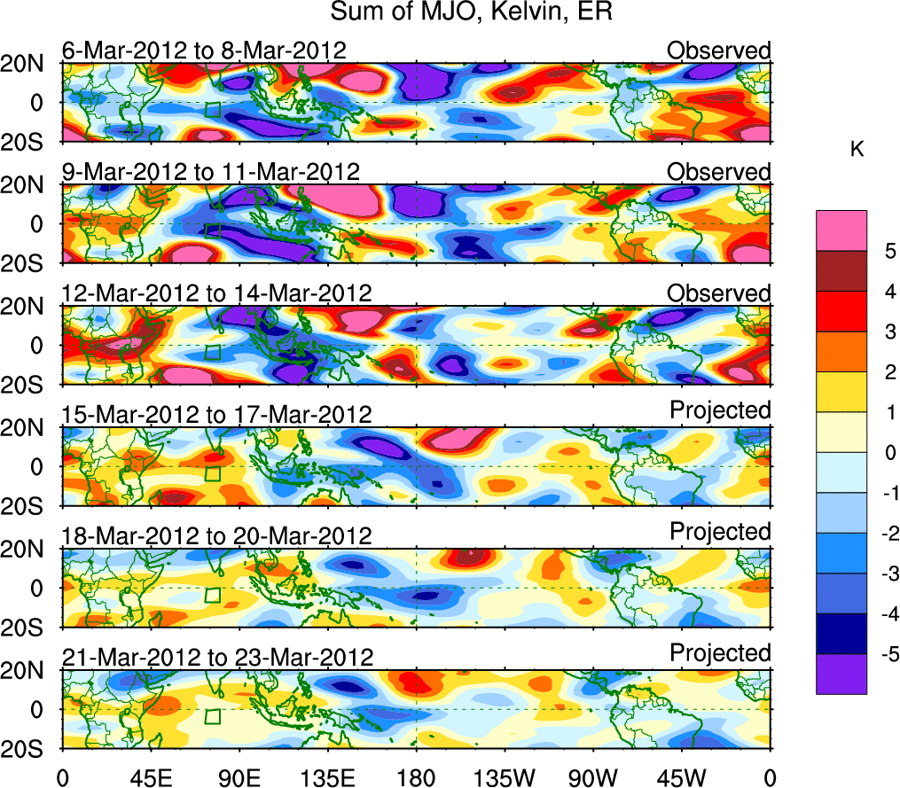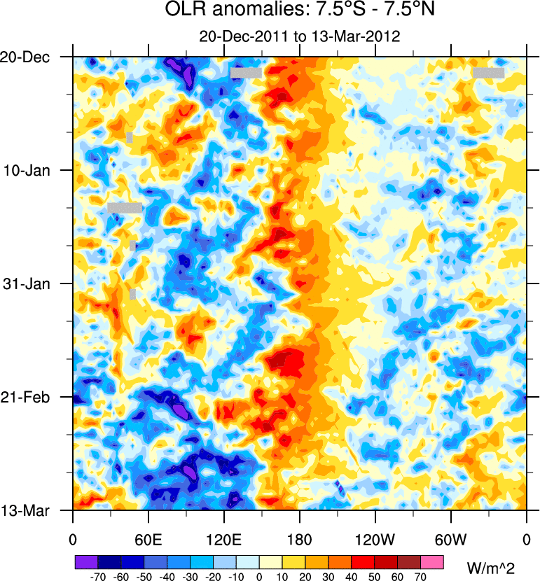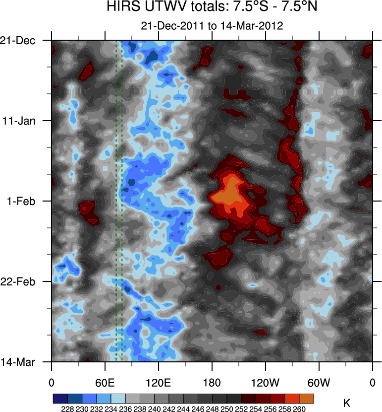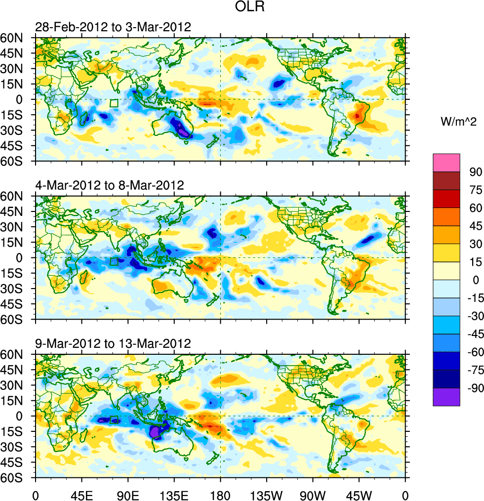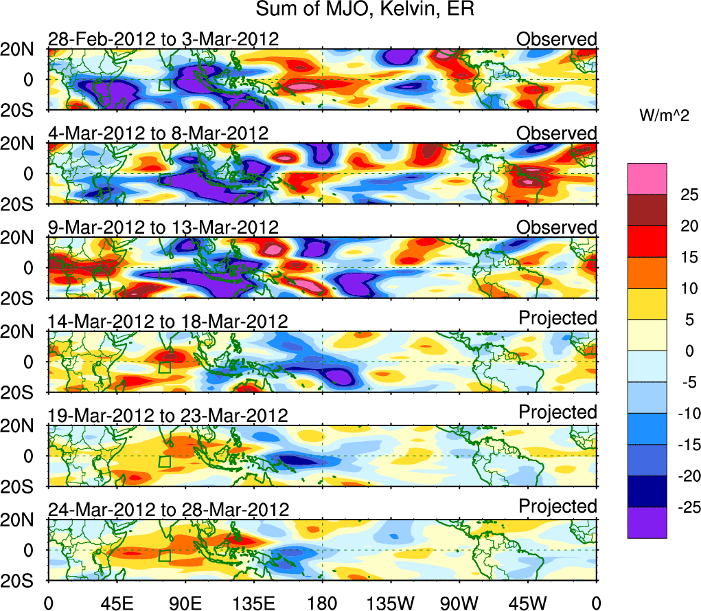 To identify tropical waves in near real-time, the OLR and UTWV data are filtered following Wheeler & Weickmann (2001 MWR). The daily anomalies are calculated using the first 3 harmonics of the seasonal cycle for 1979–2009. Missing values are then filled using linear interpolation in space and time. The most recent 365 days of anomalies are padded with 659 days of zeroes, and the result is filtered for each wave type.