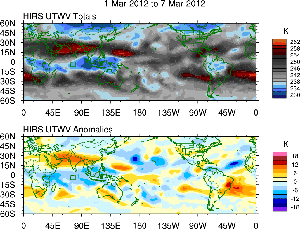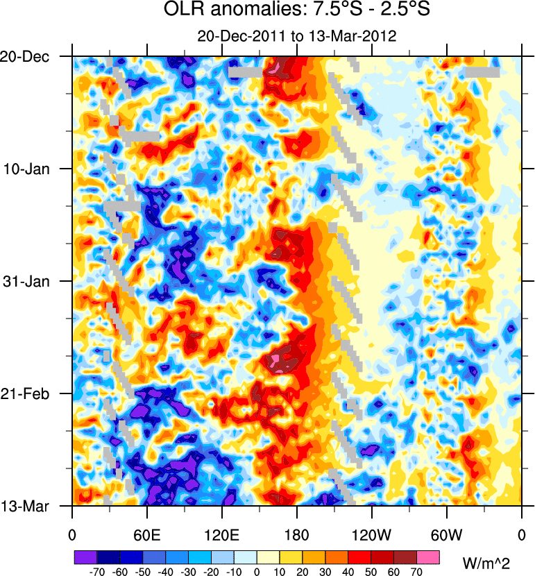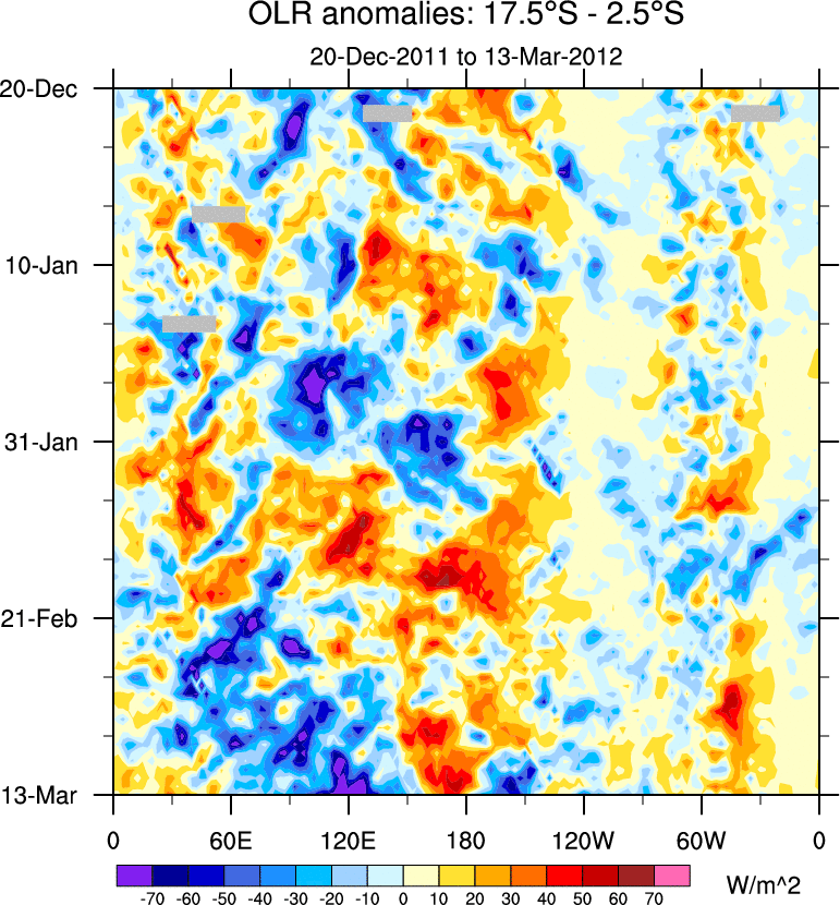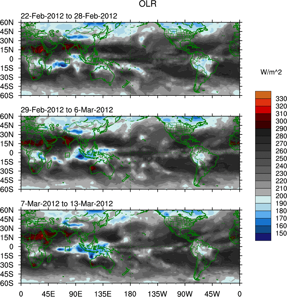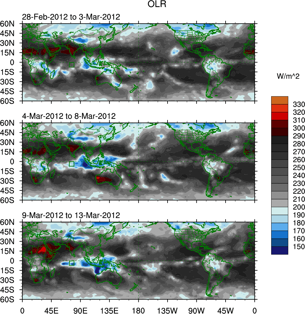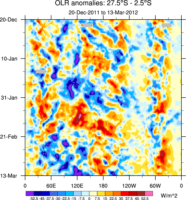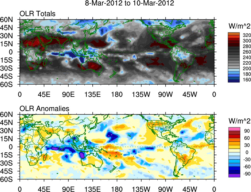 To identify tropical waves in near real-time, the OLR and UTWV data are filtered following Wheeler & Weickmann (2001 MWR). The daily anomalies are calculated using the first 3 harmonics of the seasonal cycle for 1979–2009. Missing values are then filled using linear interpolation in space and time. The most recent 365 days of anomalies are padded with 659 days of zeroes, and the result is filtered for each wave type.