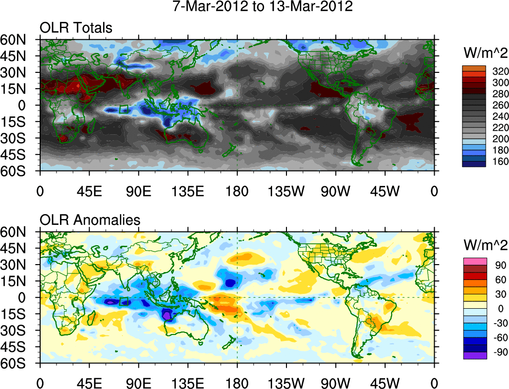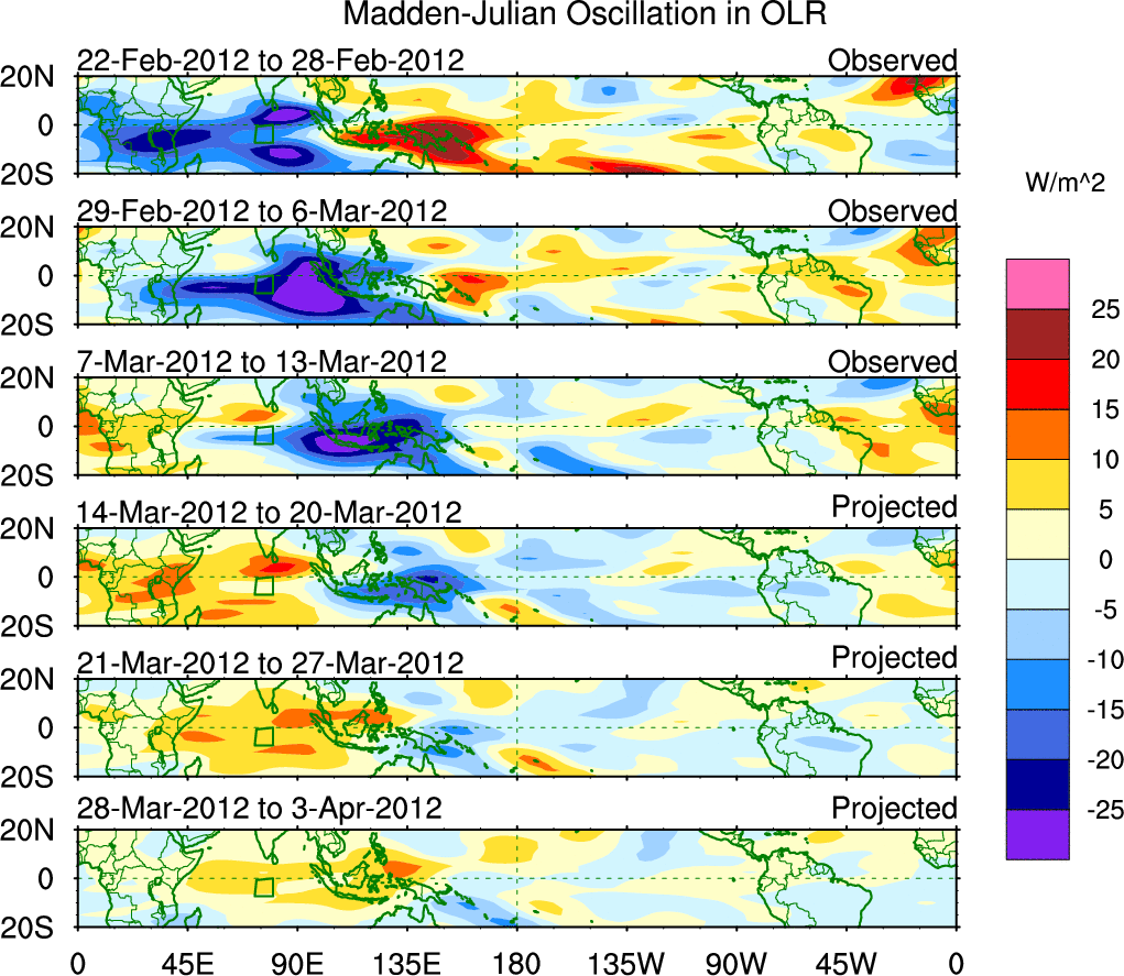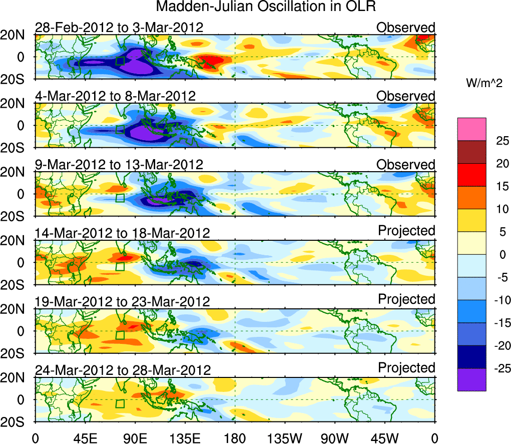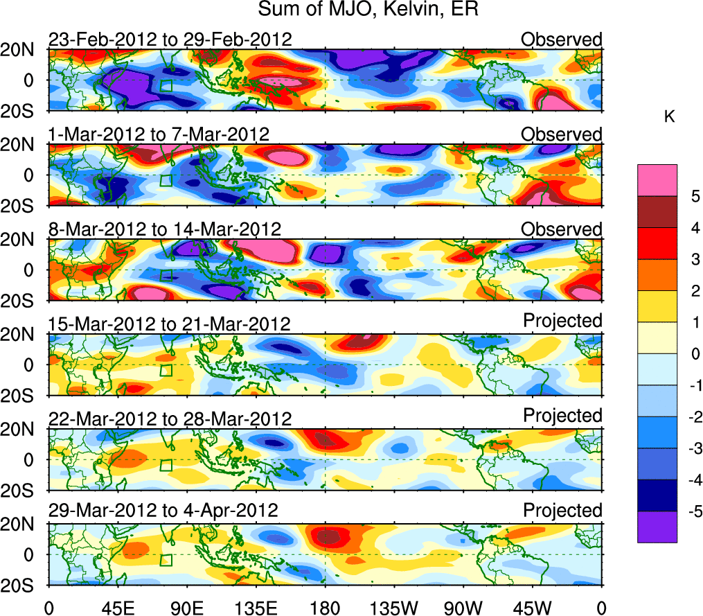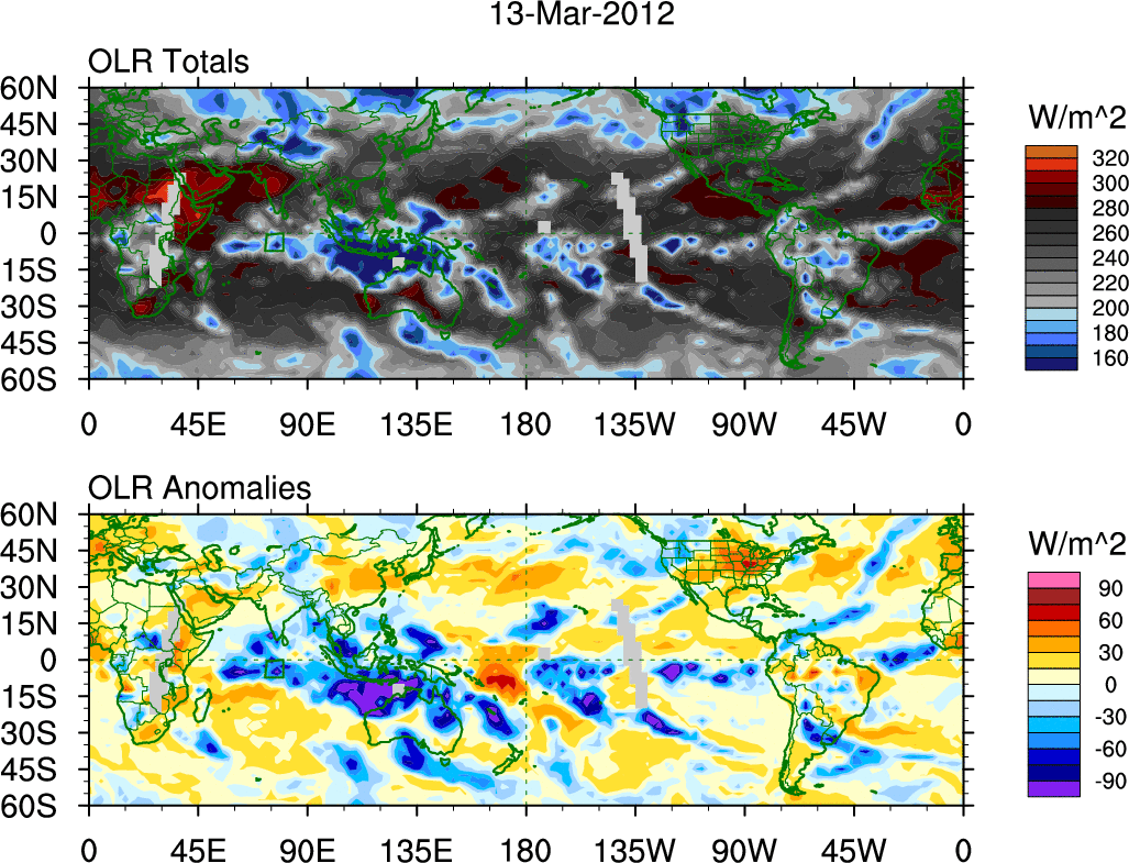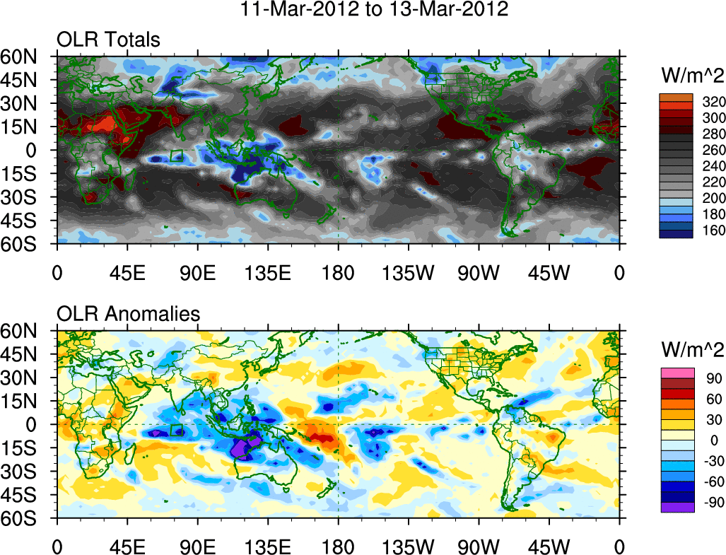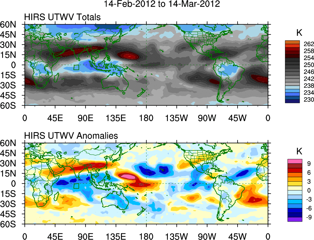 To identify tropical waves in near real-time, the OLR and UTWV data are filtered following Wheeler & Weickmann (2001 MWR). The daily anomalies are calculated using the first 3 harmonics of the seasonal cycle for 1979–2009. Missing values are then filled using linear interpolation in space and time. The most recent 365 days of anomalies are padded with 659 days of zeroes, and the result is filtered for each wave type.