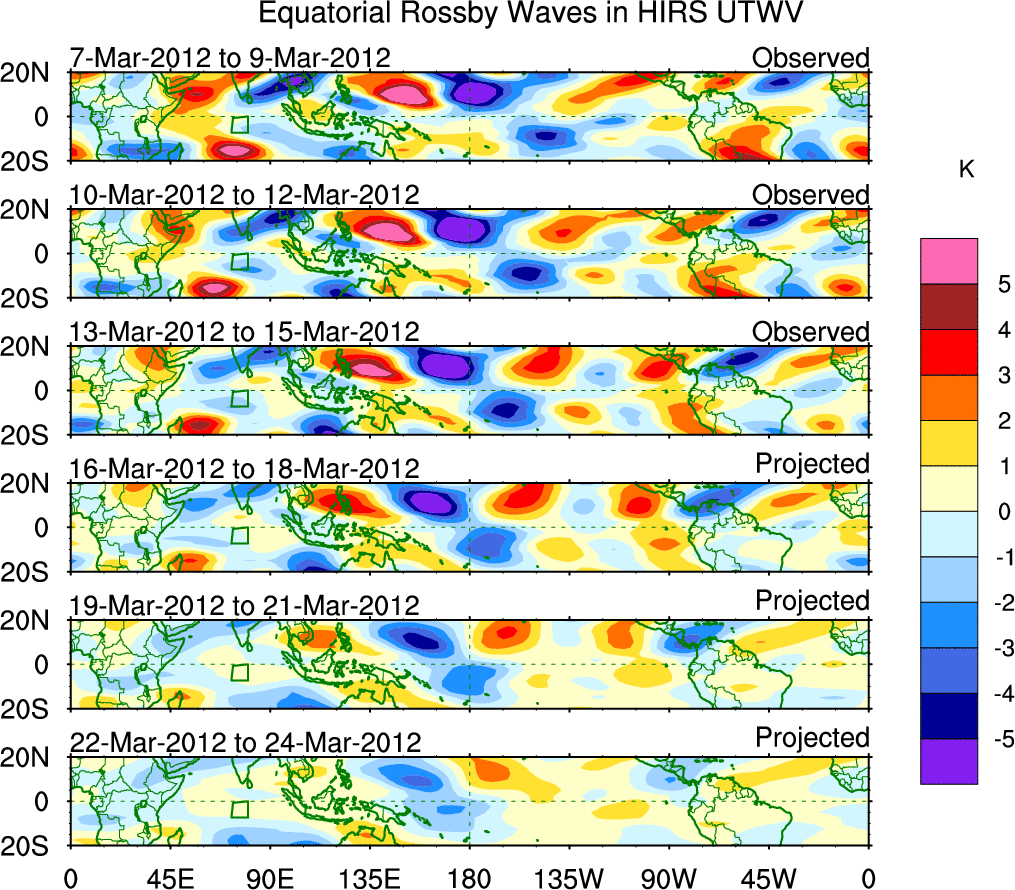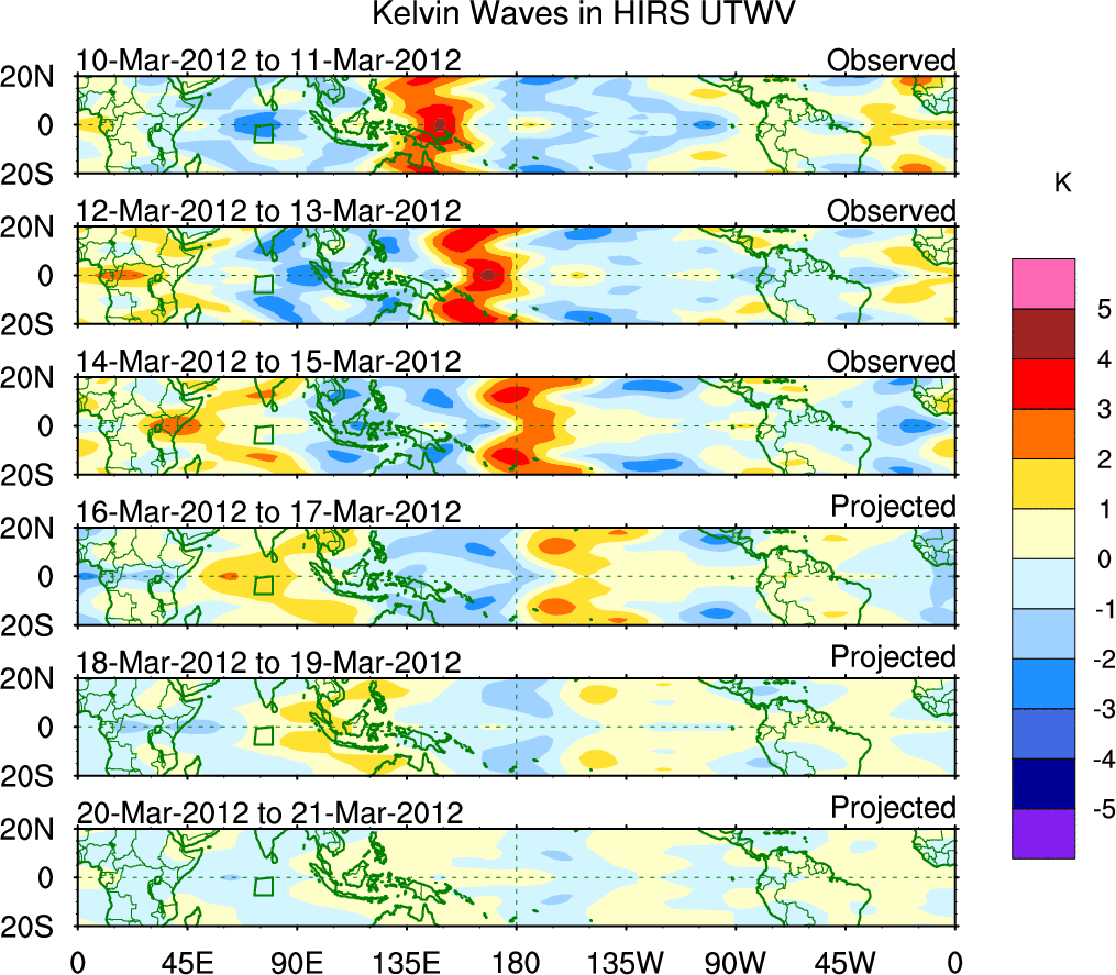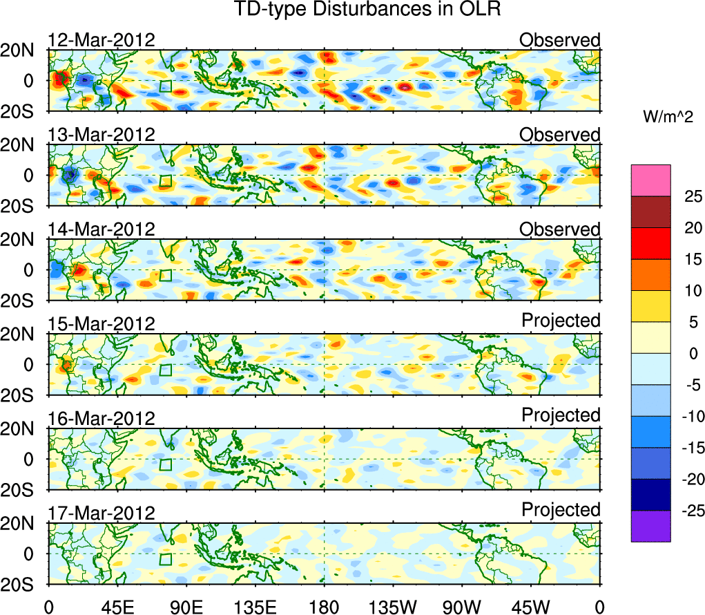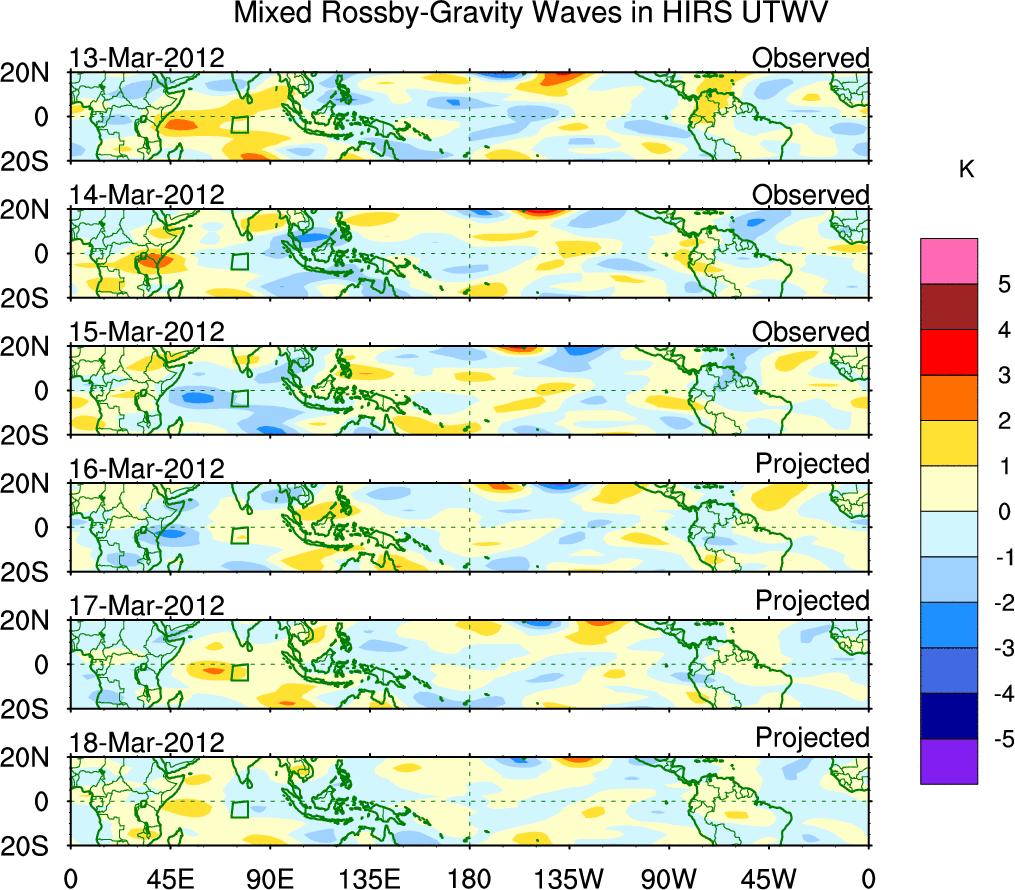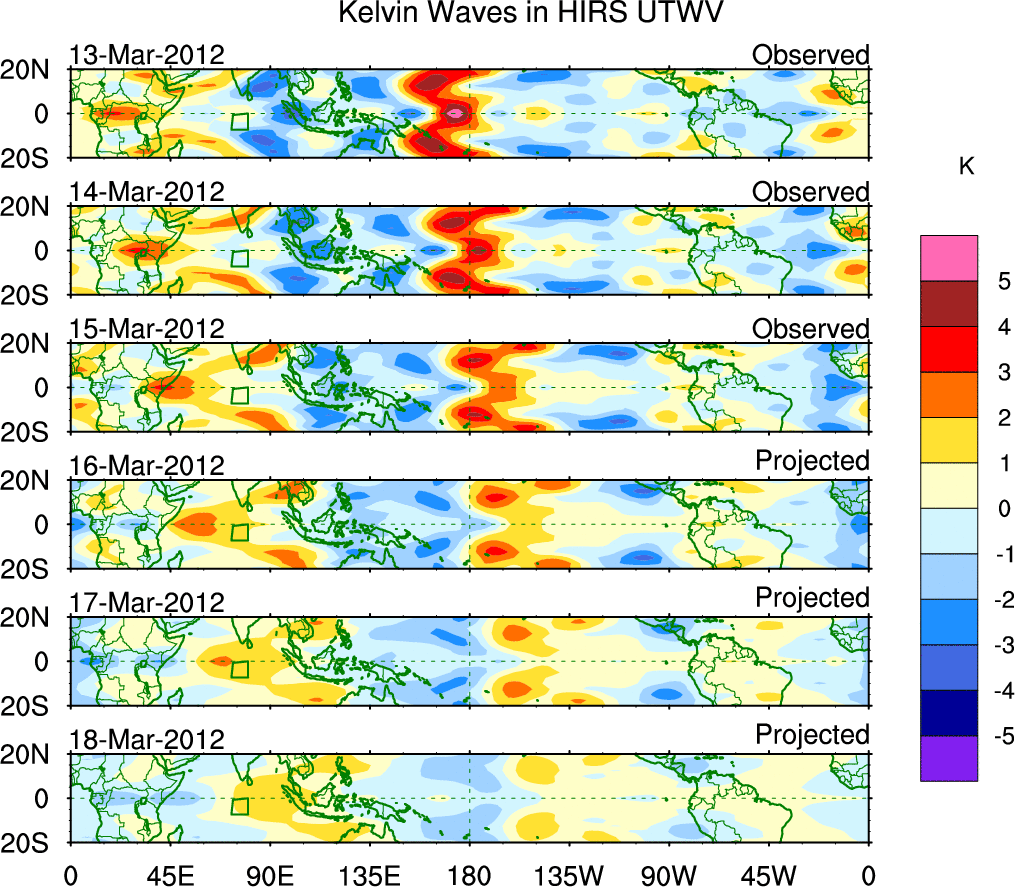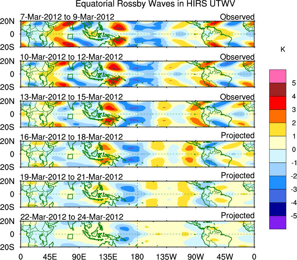 To identify tropical waves in near real-time, the OLR and UTWV data are filtered following Wheeler & Weickmann (2001 MWR). The daily anomalies are calculated using the first 3 harmonics of the seasonal cycle for 1979–2009. Missing values are then filled using linear interpolation in space and time. The most recent 365 days of anomalies are padded with 659 days of zeroes, and the result is filtered for each wave type.