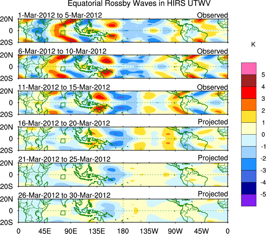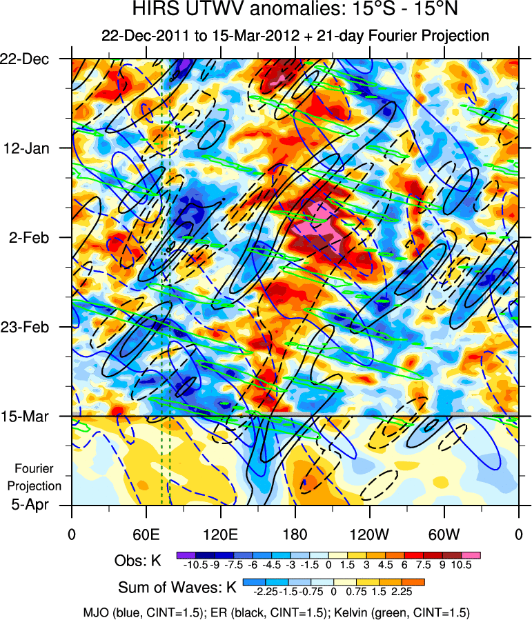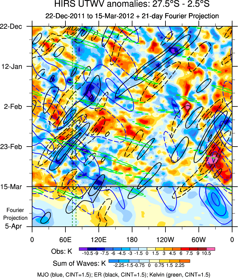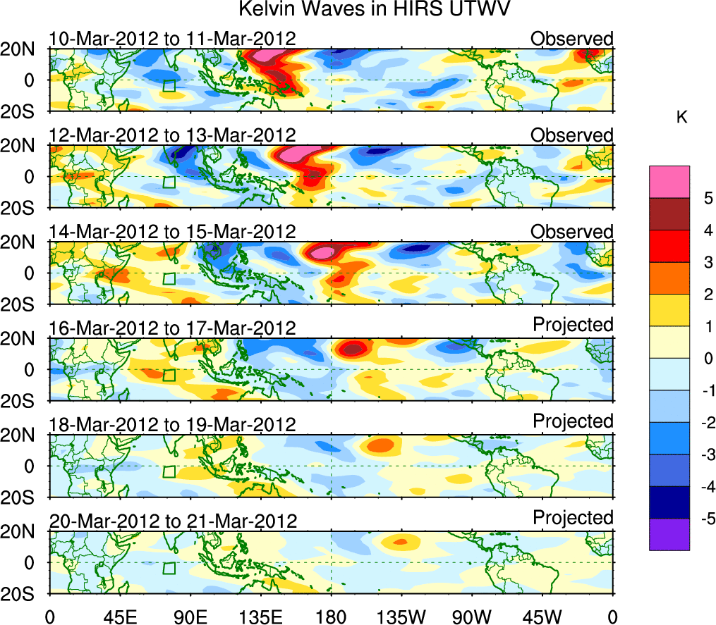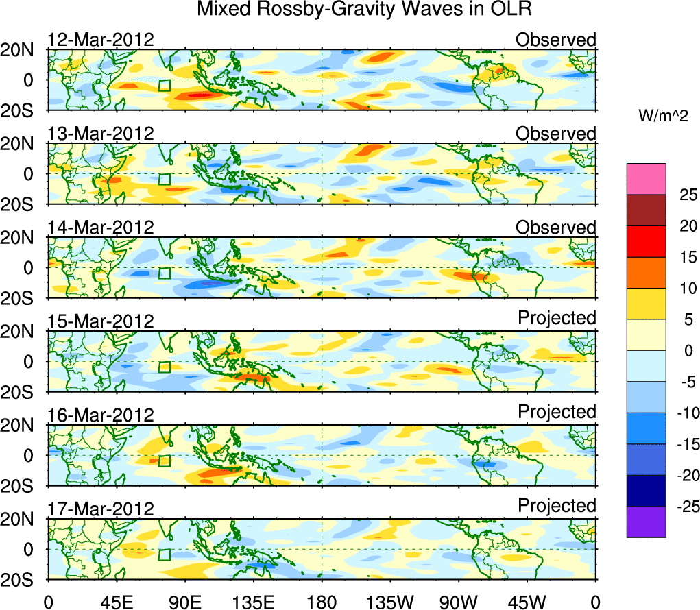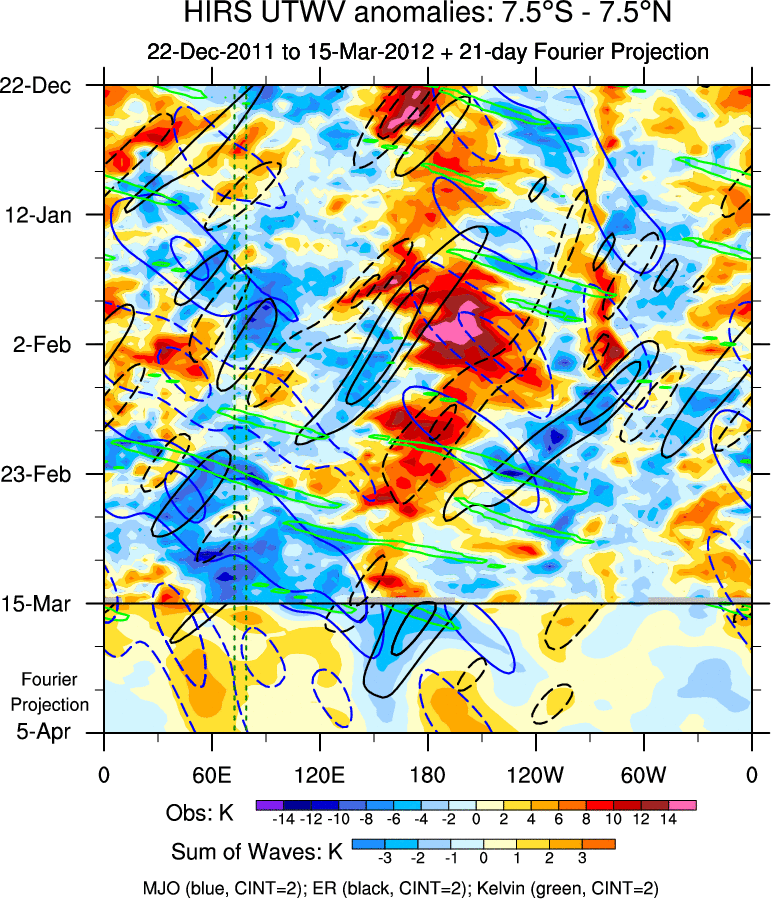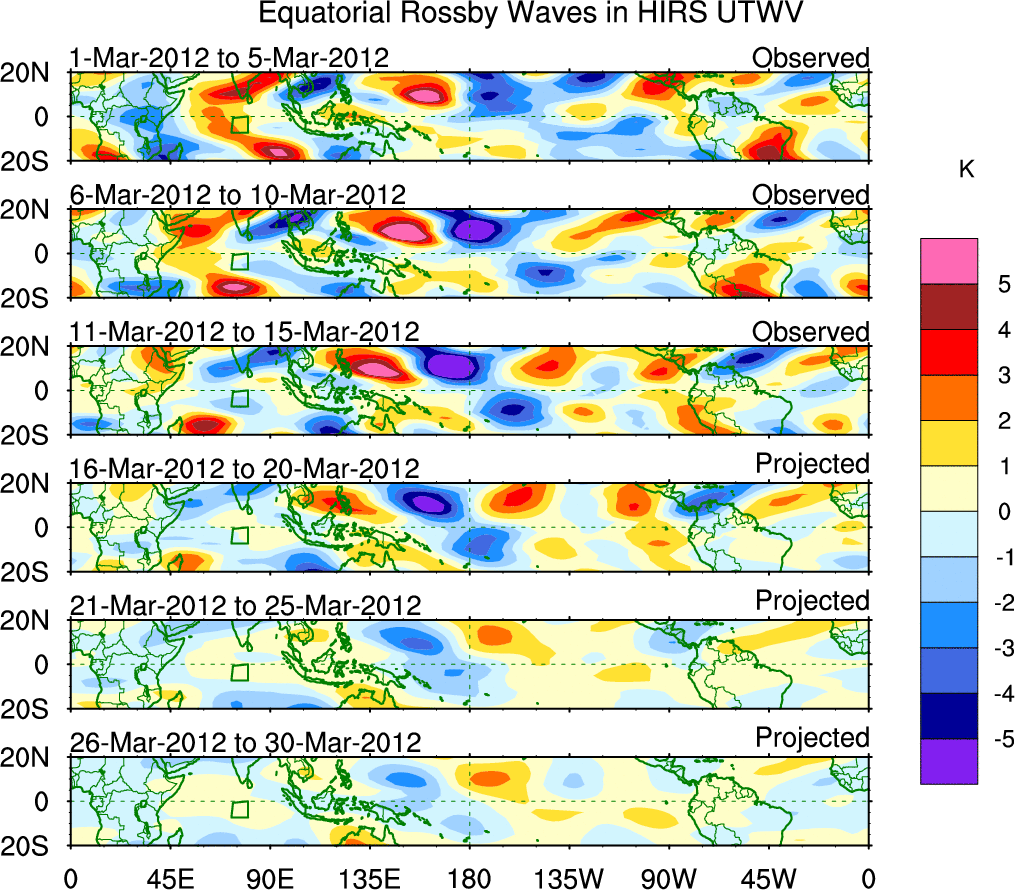To identify tropical waves in near real-time, the OLR and UTWV data are filtered following Wheeler & Weickmann (2001 MWR). The daily anomalies are calculated using the first 3 harmonics of the seasonal cycle for 1979–2009. Missing values are then filled using linear interpolation in space and time. The most recent 365 days of anomalies are padded with 659 days of zeroes, and the result is filtered for each wave type.