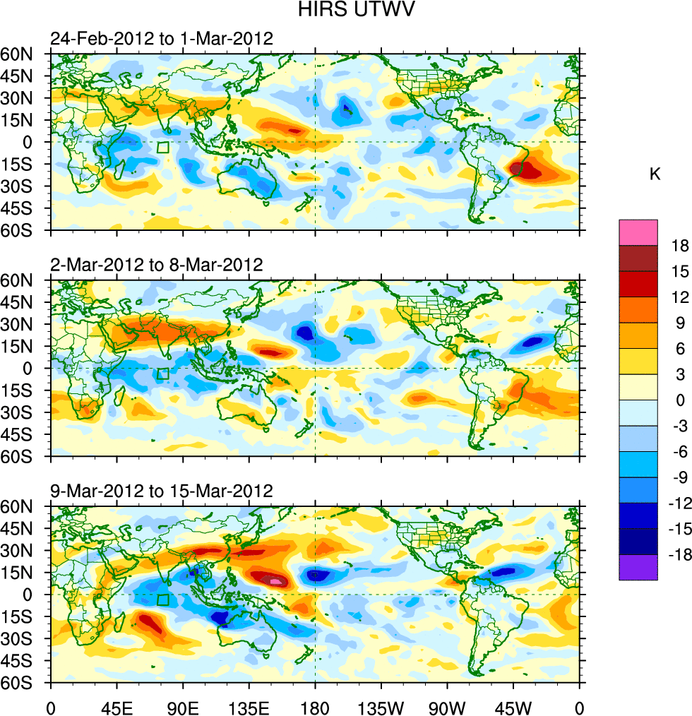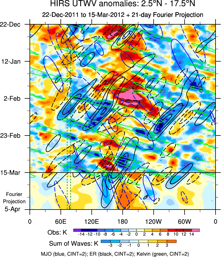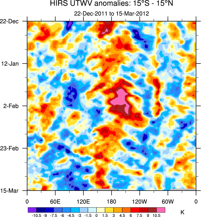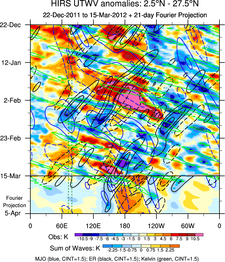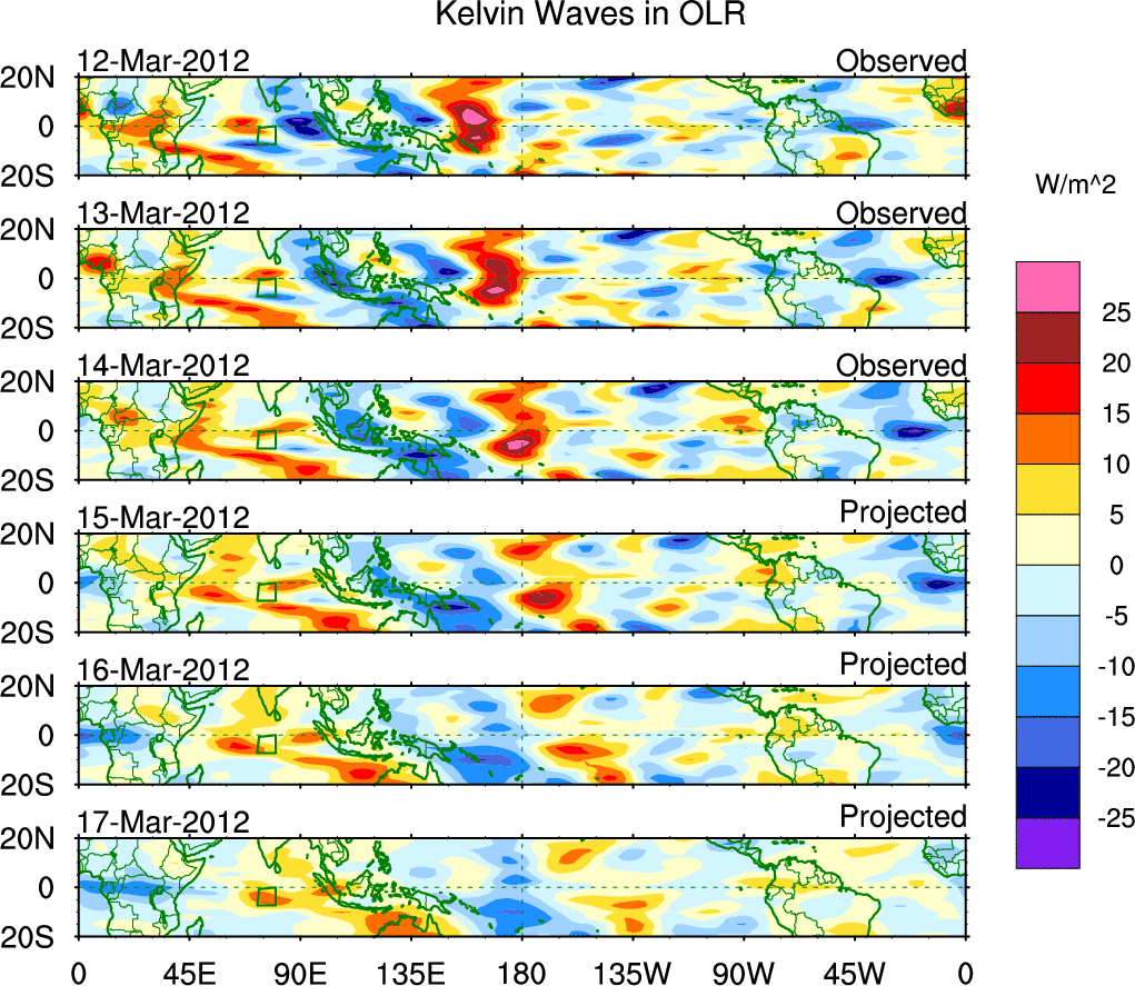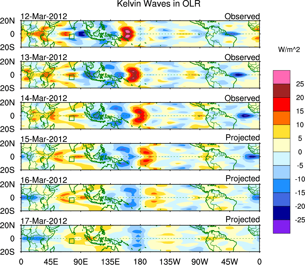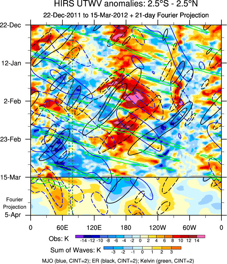 To identify tropical waves in near real-time, the OLR and UTWV data are filtered following Wheeler & Weickmann (2001 MWR). The daily anomalies are calculated using the first 3 harmonics of the seasonal cycle for 1979–2009. Missing values are then filled using linear interpolation in space and time. The most recent 365 days of anomalies are padded with 659 days of zeroes, and the result is filtered for each wave type.