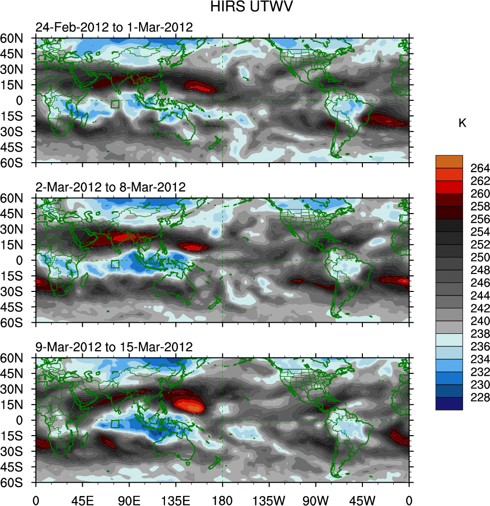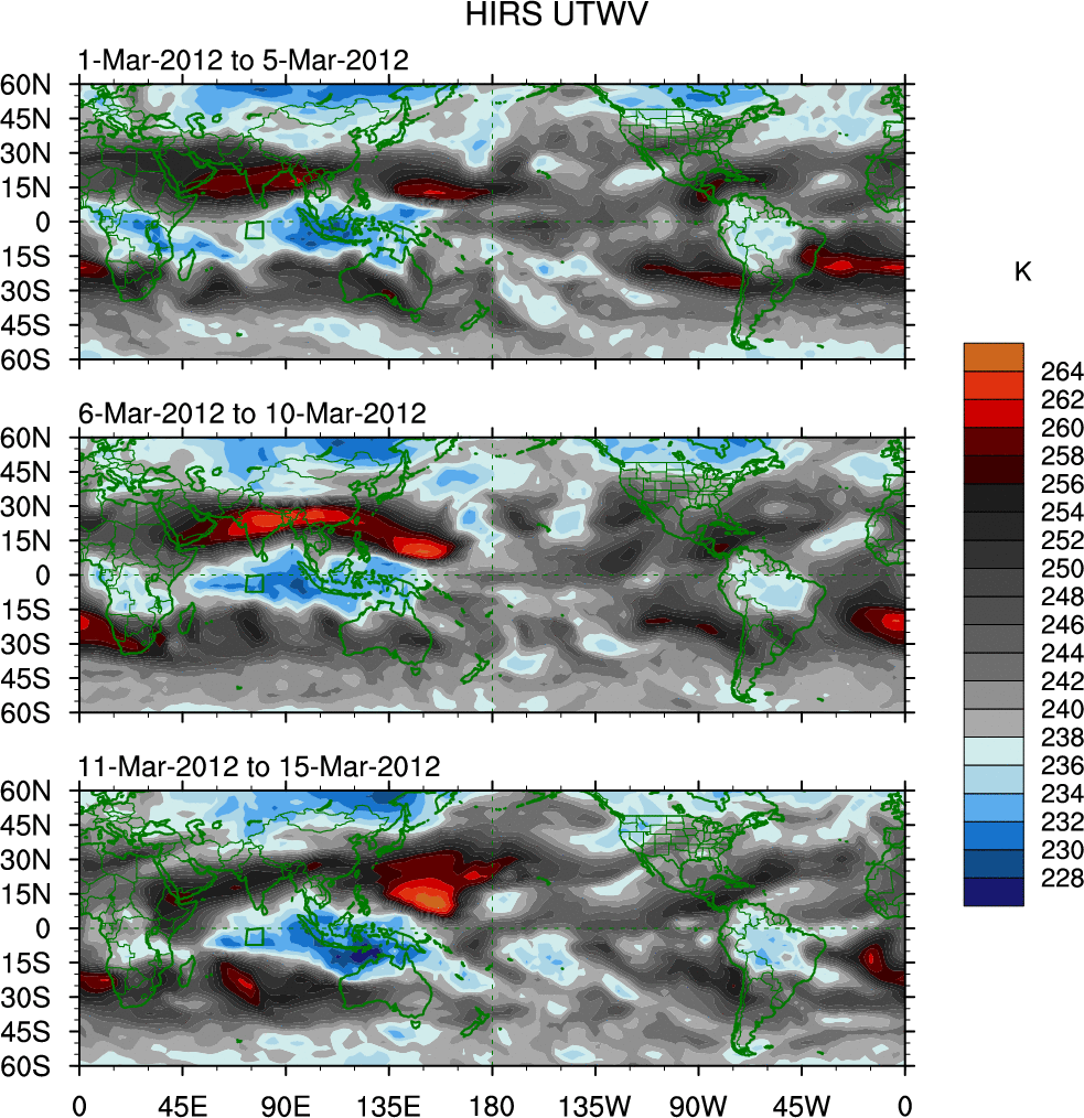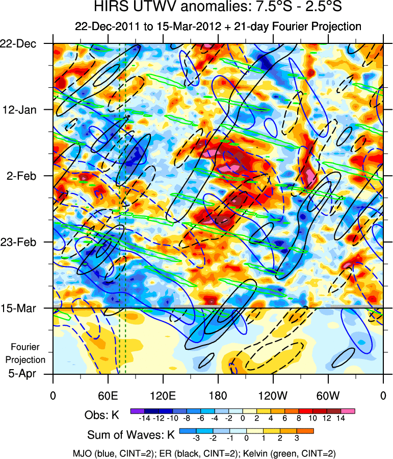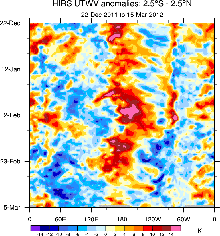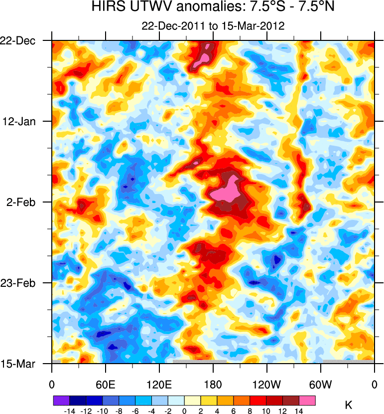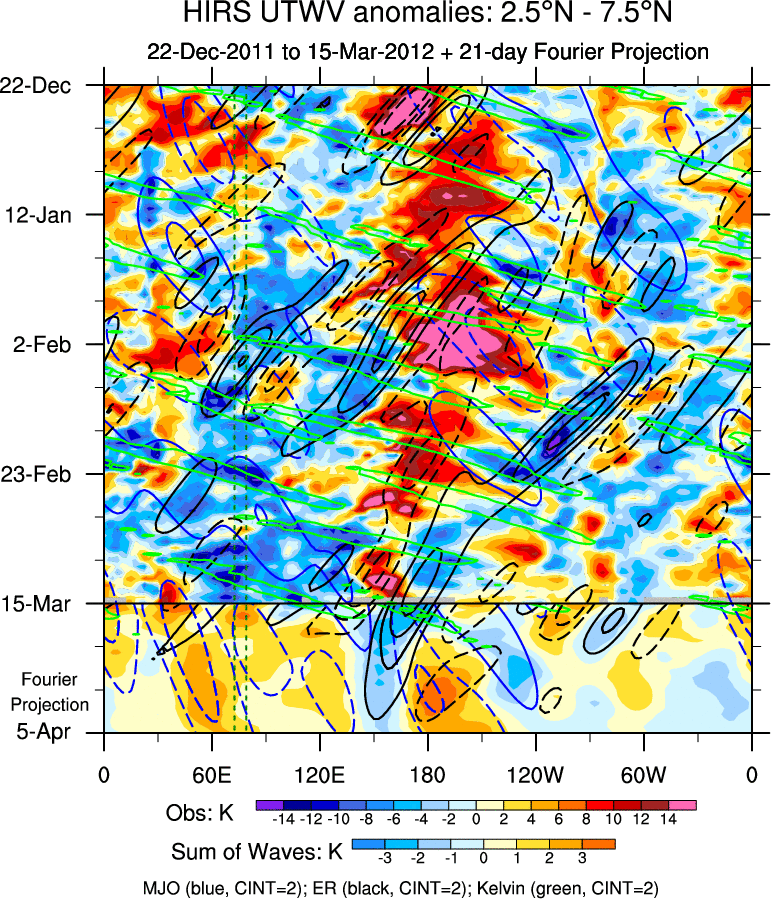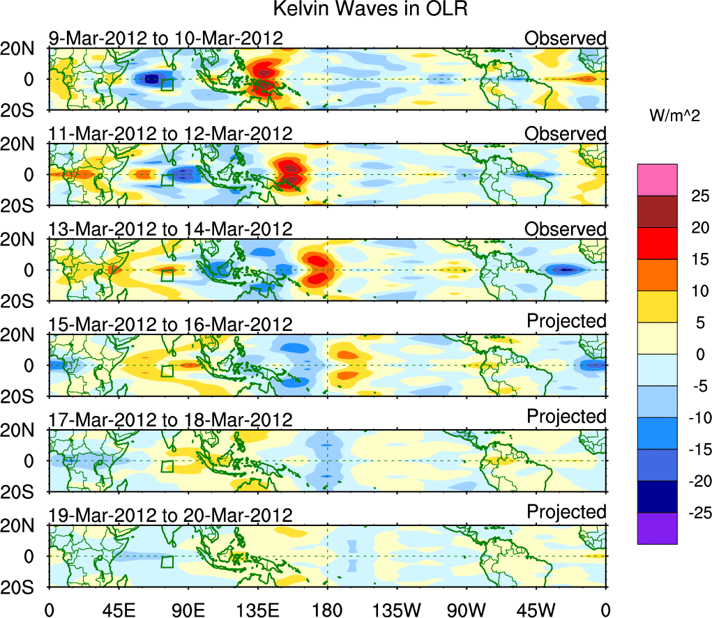 To identify tropical waves in near real-time, the OLR and UTWV data are filtered following Wheeler & Weickmann (2001 MWR). The daily anomalies are calculated using the first 3 harmonics of the seasonal cycle for 1979–2009. Missing values are then filled using linear interpolation in space and time. The most recent 365 days of anomalies are padded with 659 days of zeroes, and the result is filtered for each wave type.