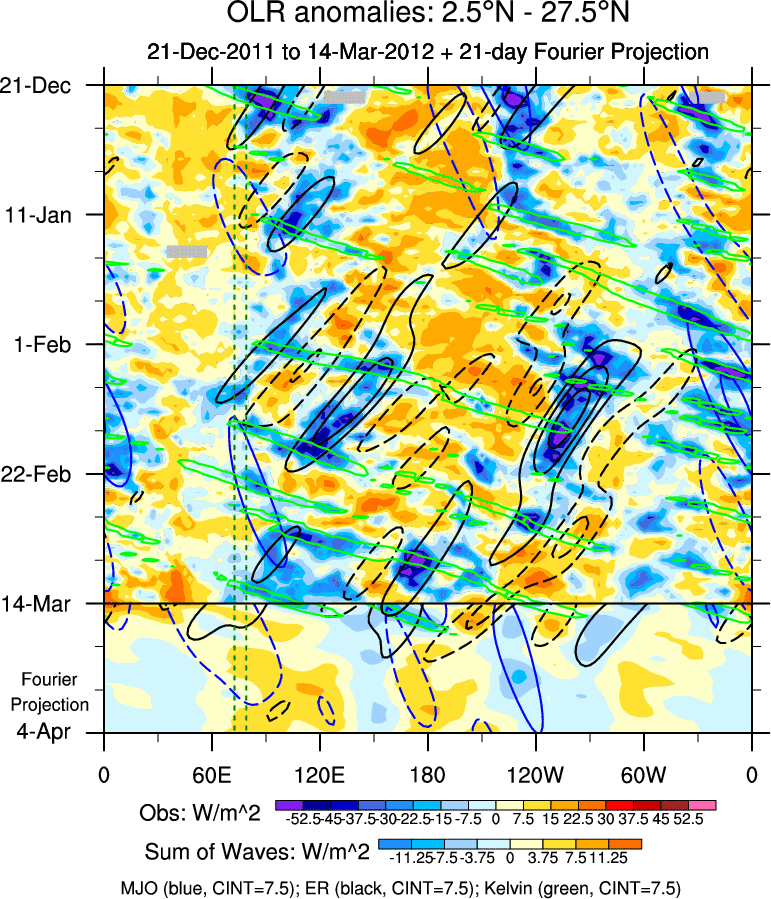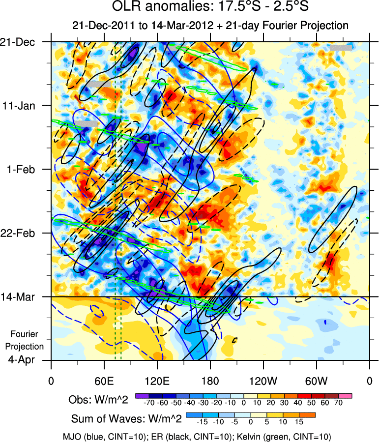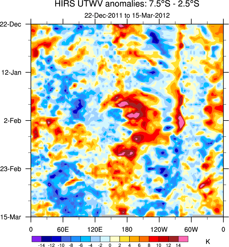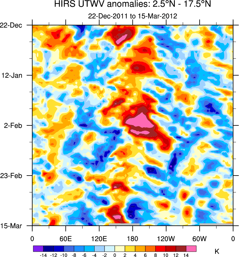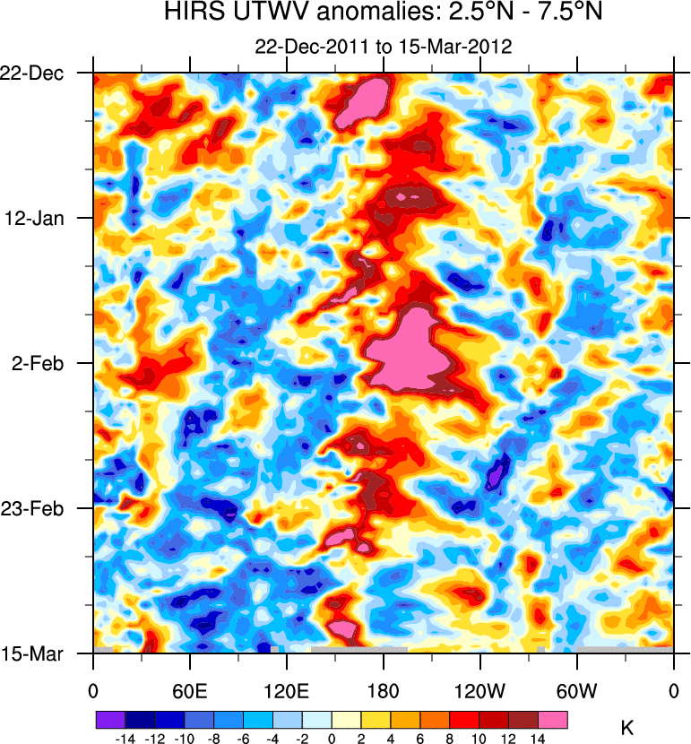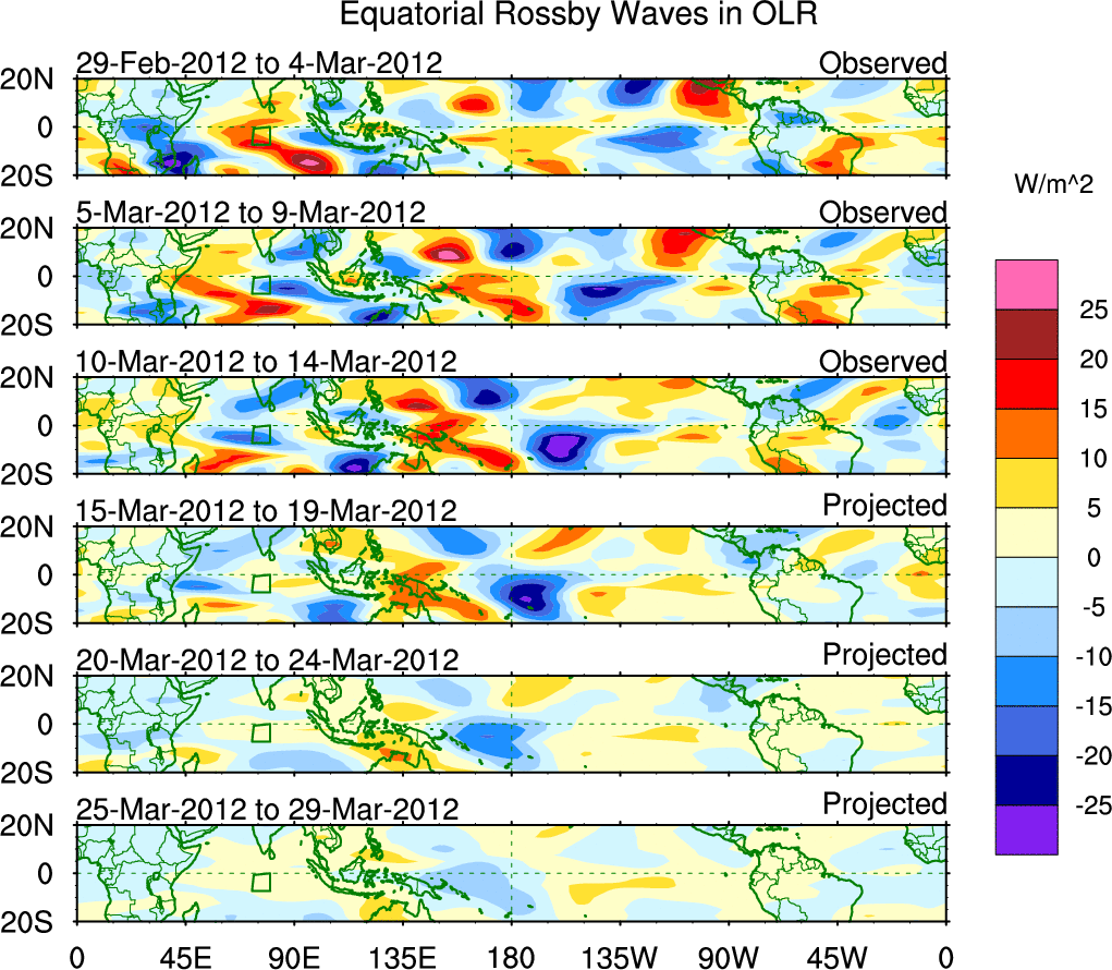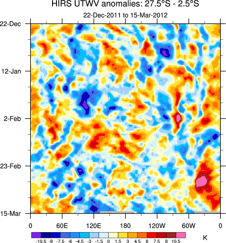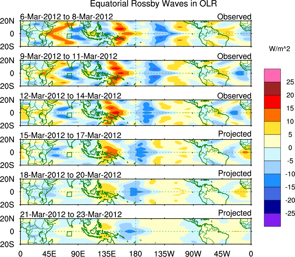 To identify tropical waves in near real-time, the OLR and UTWV data are filtered following Wheeler & Weickmann (2001 MWR). The daily anomalies are calculated using the first 3 harmonics of the seasonal cycle for 1979–2009. Missing values are then filled using linear interpolation in space and time. The most recent 365 days of anomalies are padded with 659 days of zeroes, and the result is filtered for each wave type.