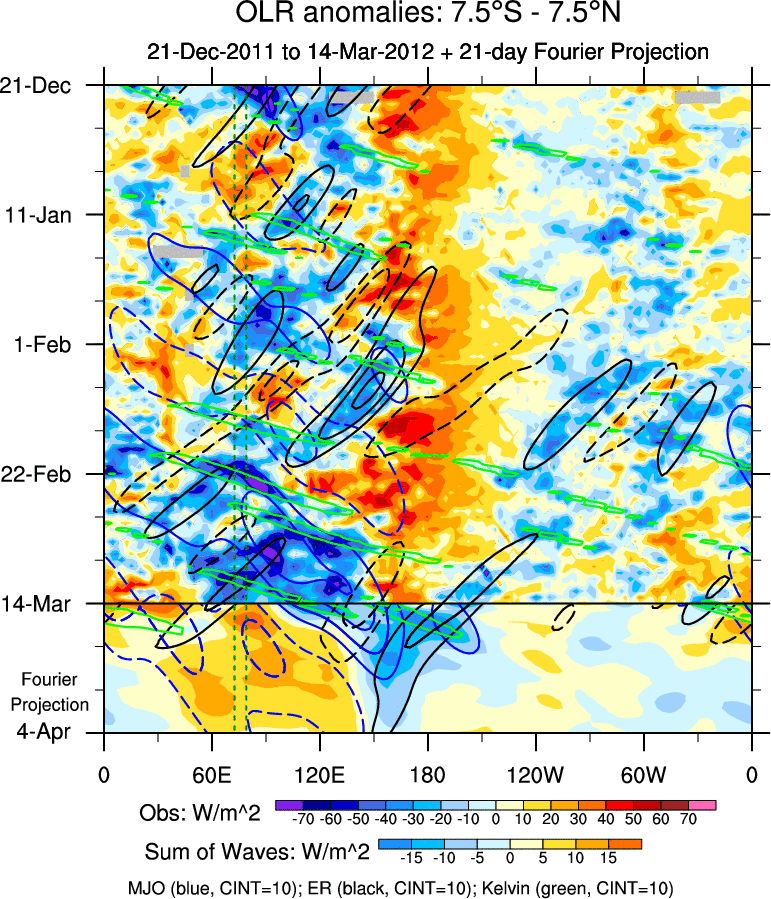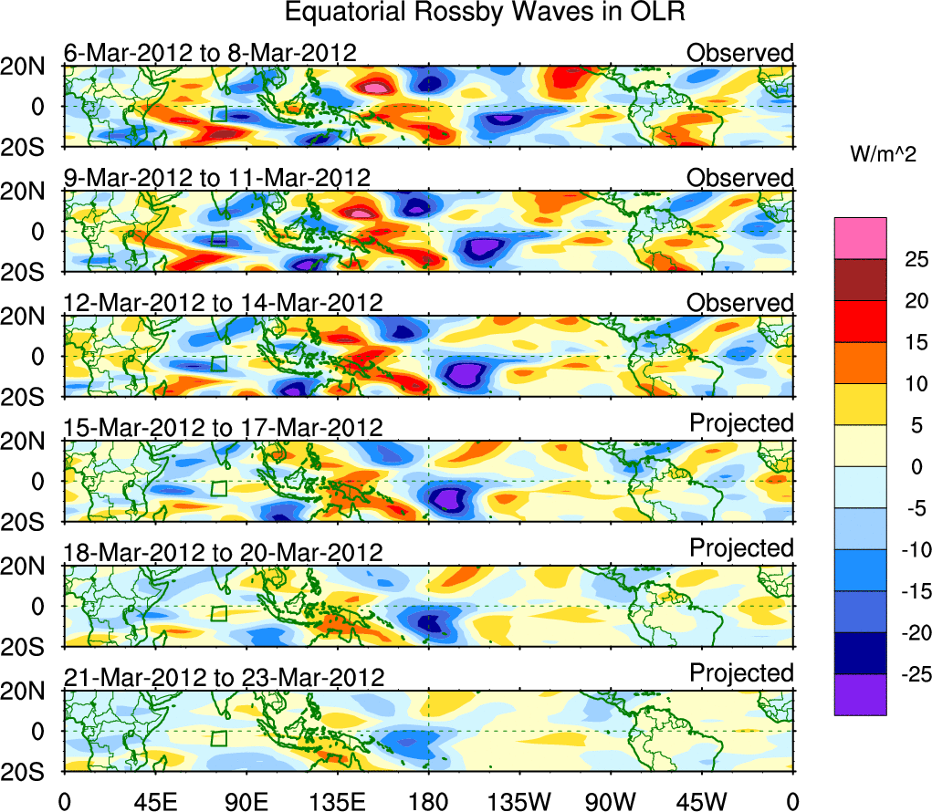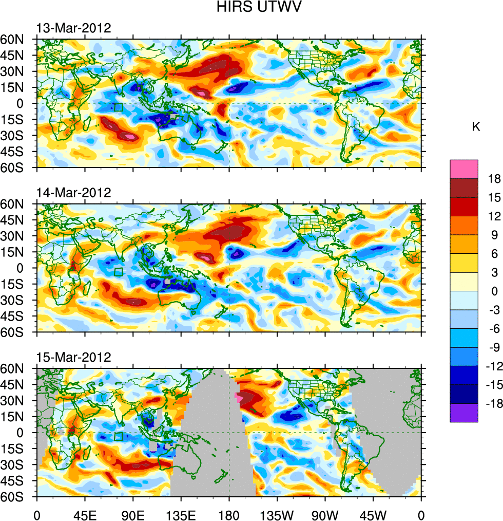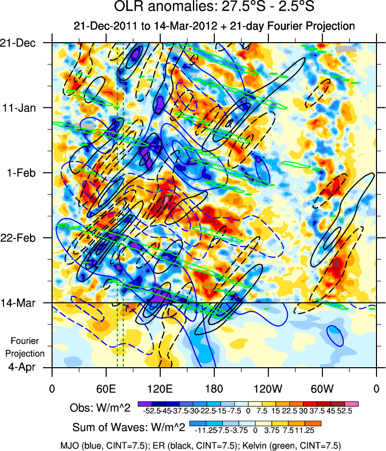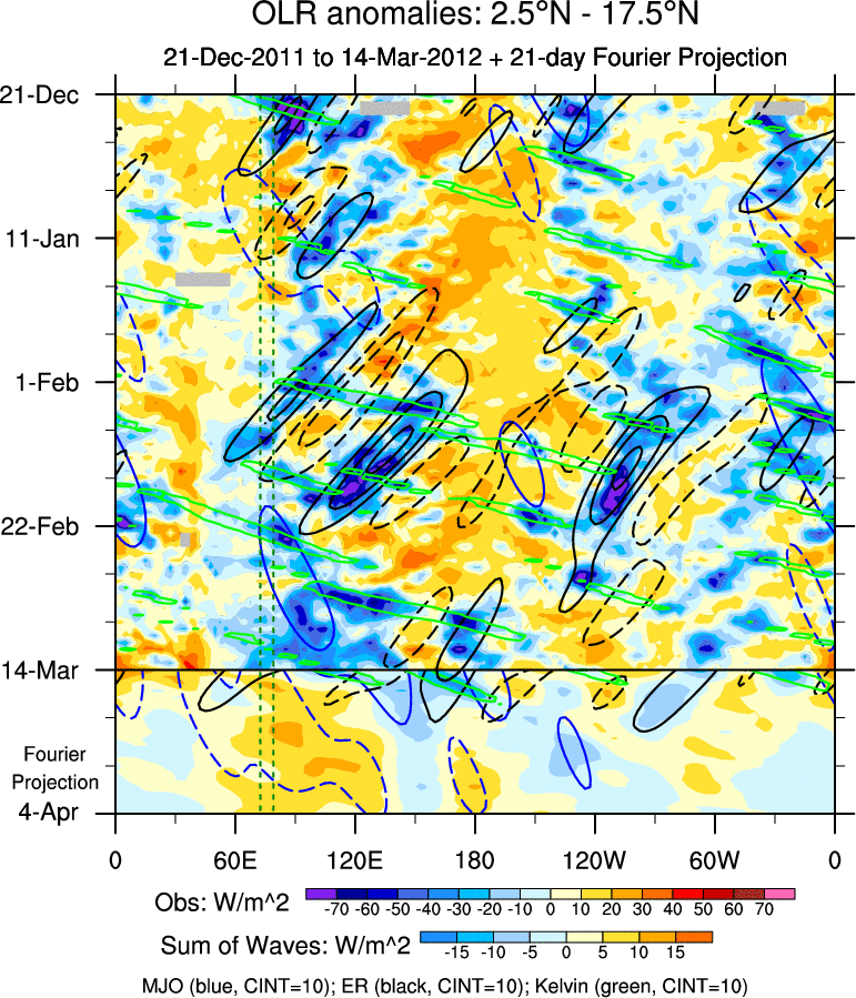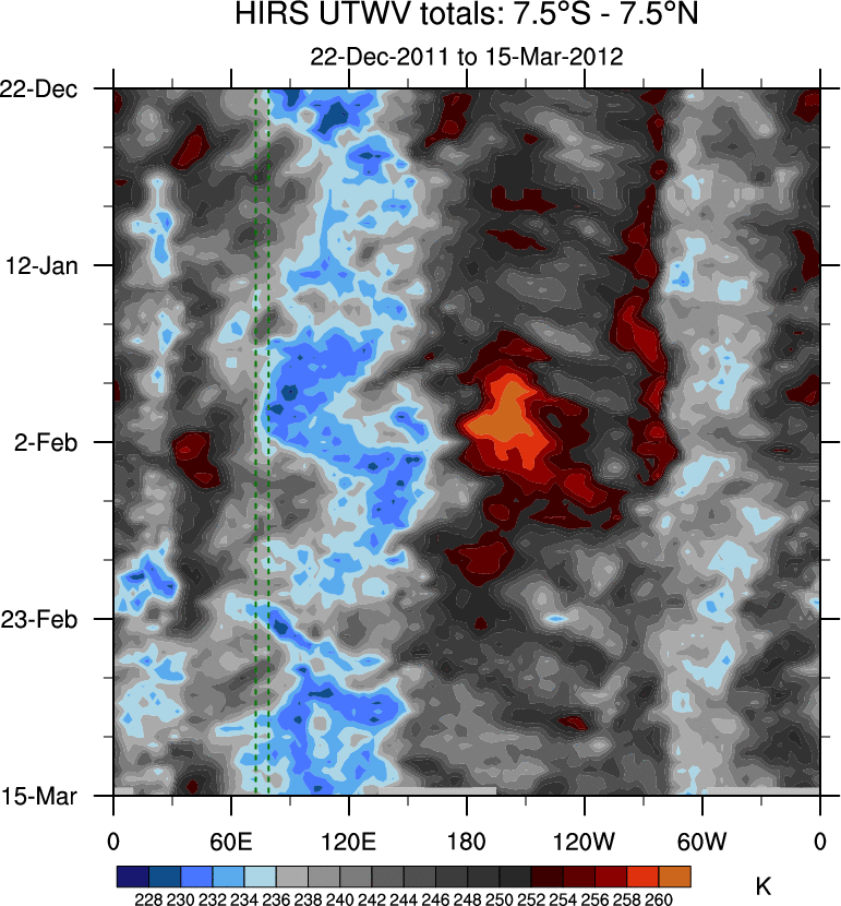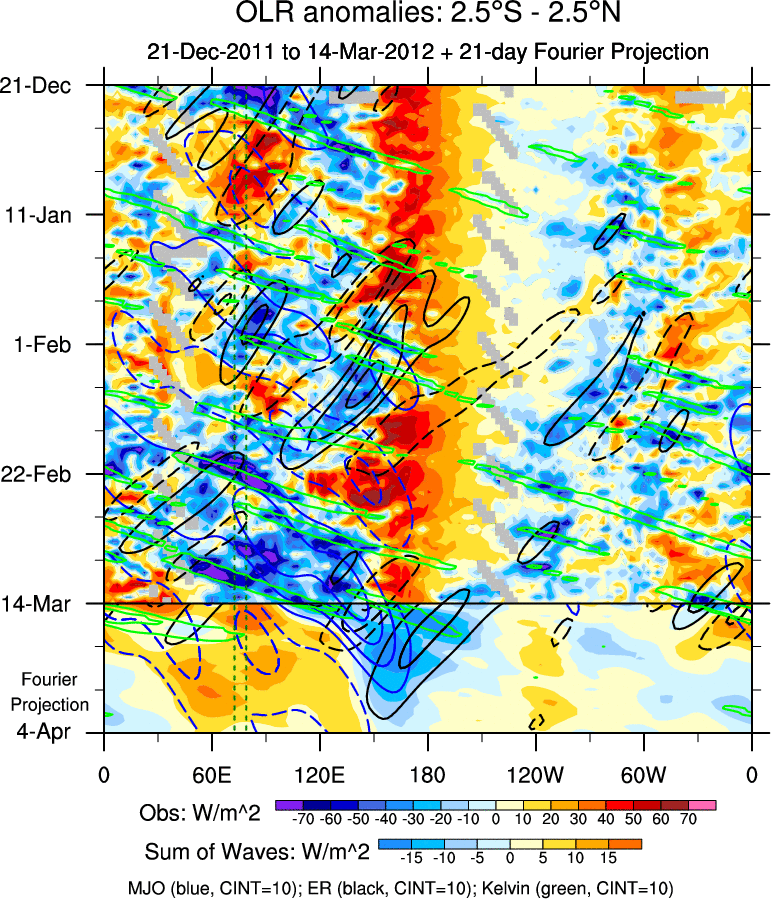 To identify tropical waves in near real-time, the OLR and UTWV data are filtered following Wheeler & Weickmann (2001 MWR). The daily anomalies are calculated using the first 3 harmonics of the seasonal cycle for 1979–2009. Missing values are then filled using linear interpolation in space and time. The most recent 365 days of anomalies are padded with 659 days of zeroes, and the result is filtered for each wave type.
