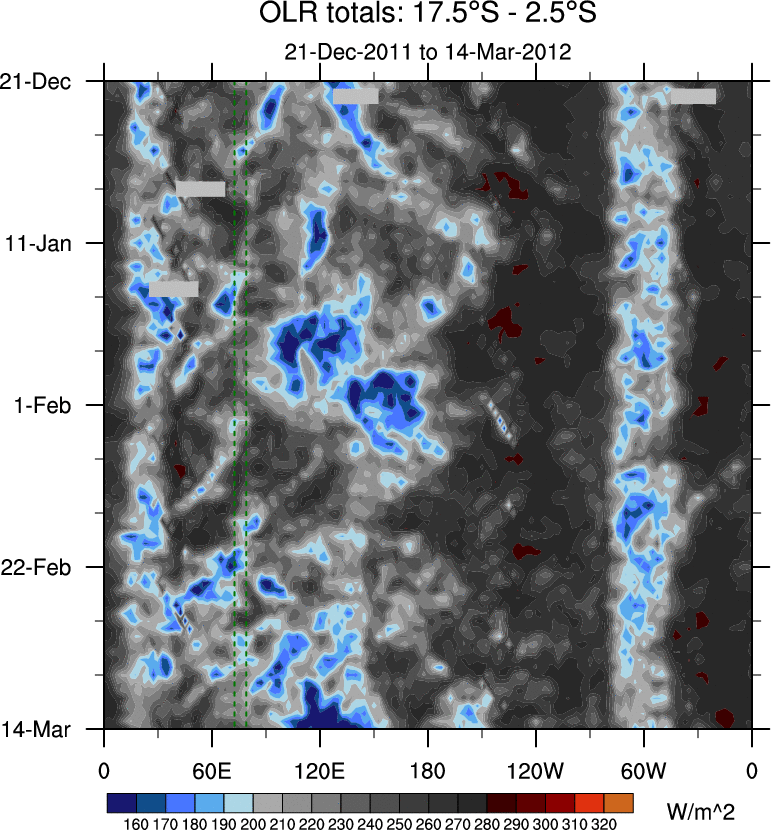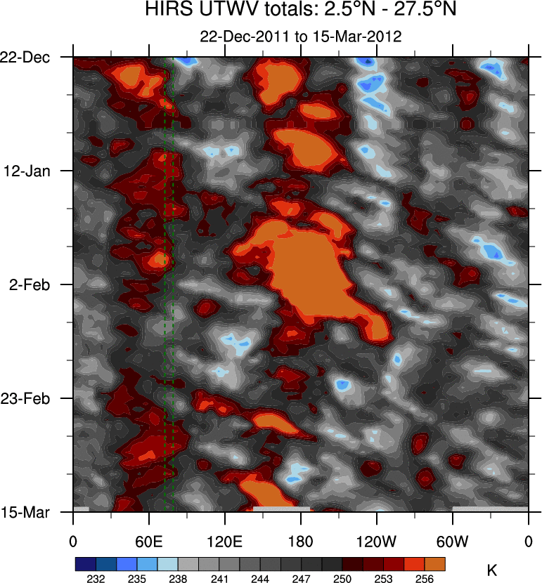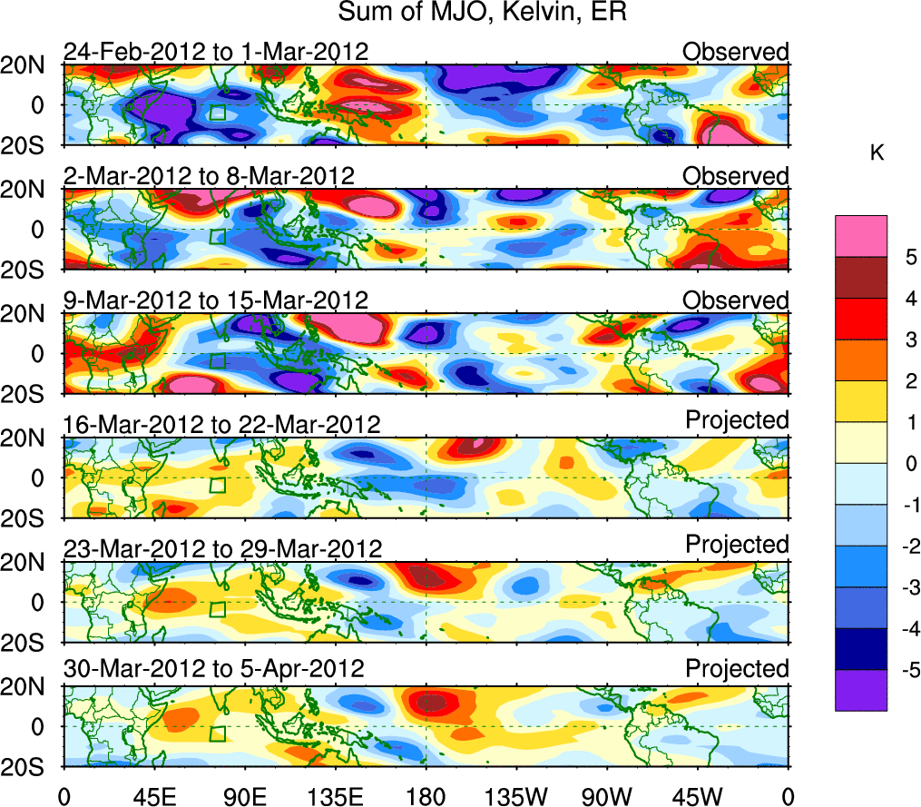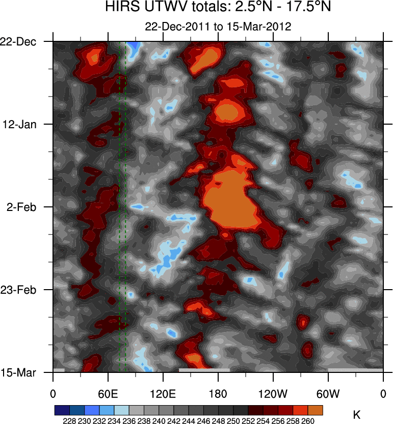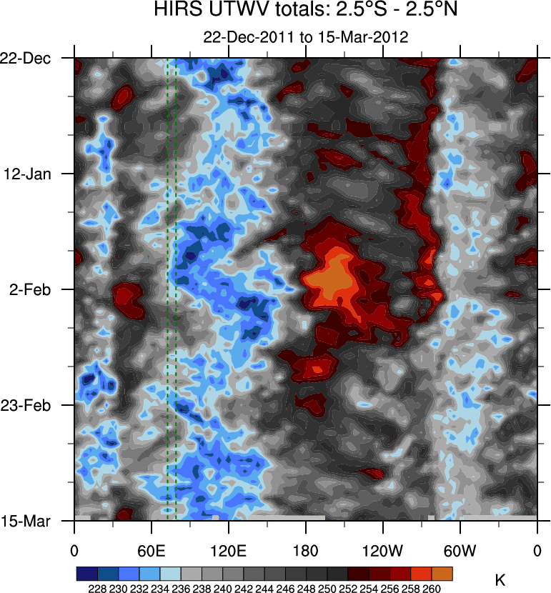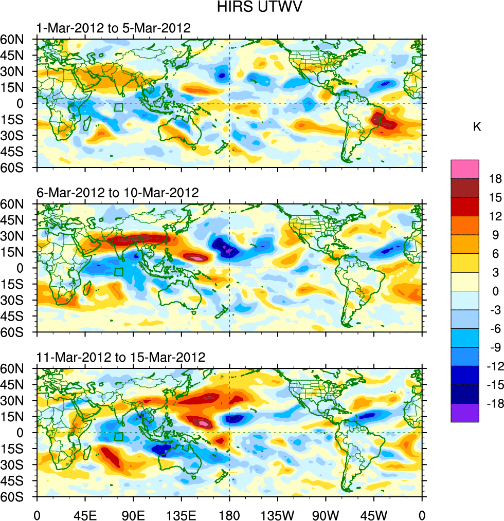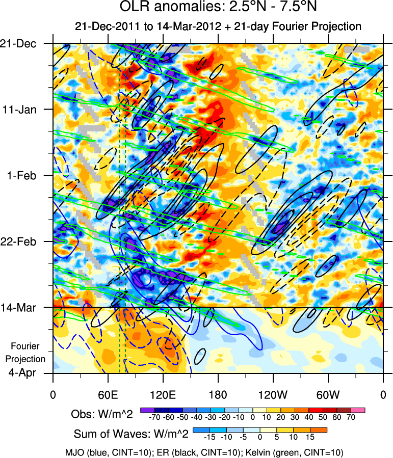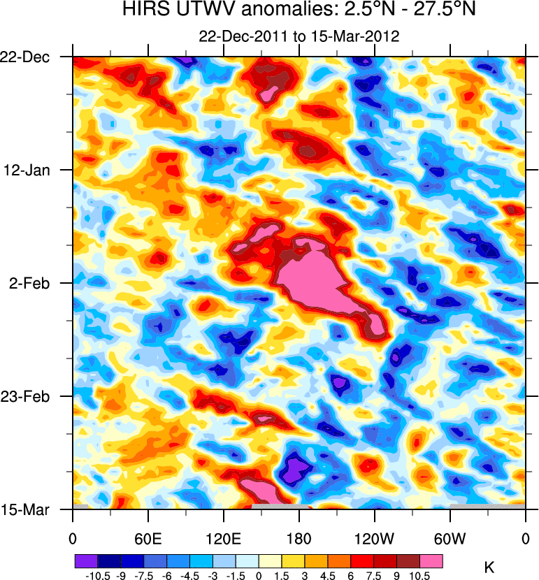 To identify tropical waves in near real-time, the OLR and UTWV data are filtered following Wheeler & Weickmann (2001 MWR). The daily anomalies are calculated using the first 3 harmonics of the seasonal cycle for 1979–2009. Missing values are then filled using linear interpolation in space and time. The most recent 365 days of anomalies are padded with 659 days of zeroes, and the result is filtered for each wave type.