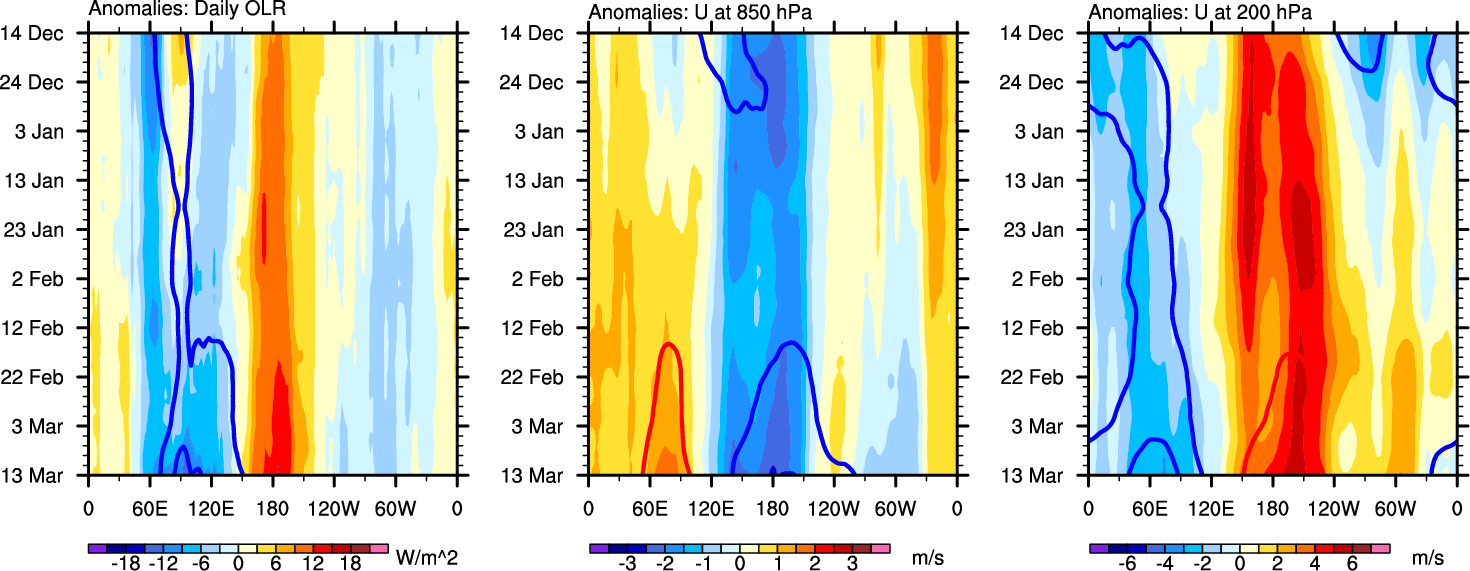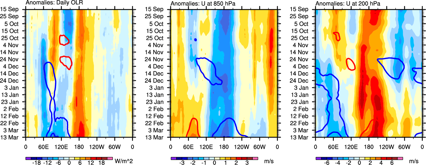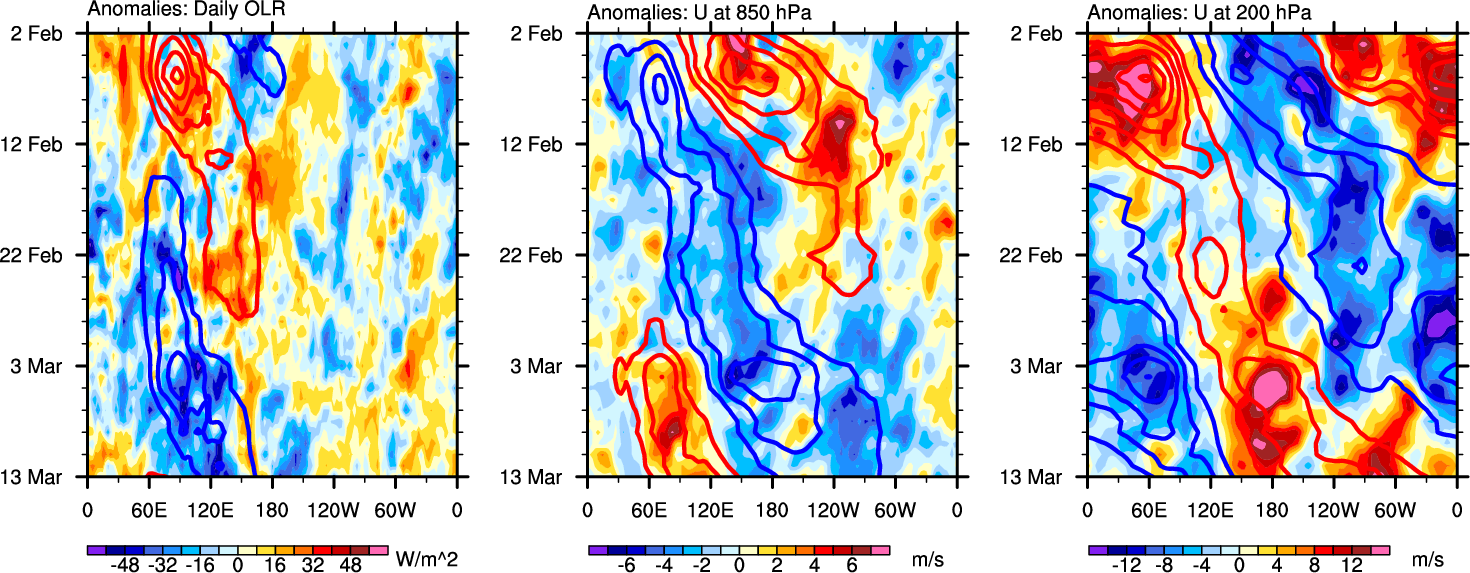The Hovmollers show longitude-time plots for OLR, U-850, and U-200. The shading indicates the observed anomalies, while the contours are the projection of those anomalies onto the RMM EOFs.
